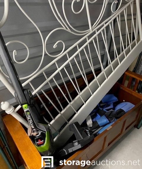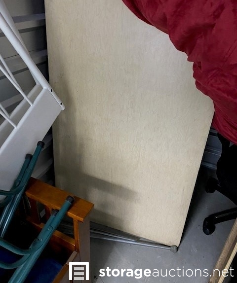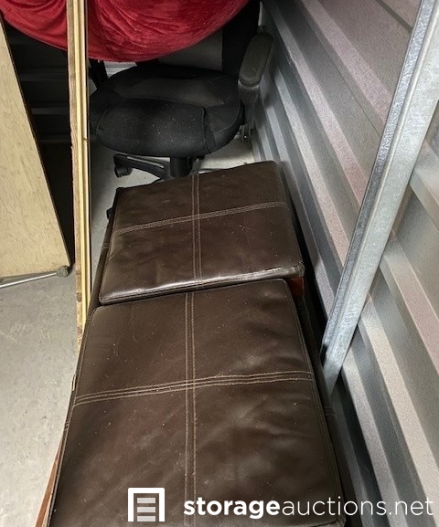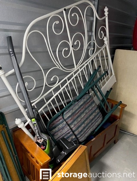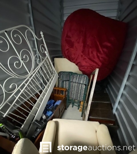 Clean unit in climate control. Ottoman, day bed frame, office chair, desk, folding table and chairs, battery operated vacuum, camping chairs, sitting chair and miscellaneous items.