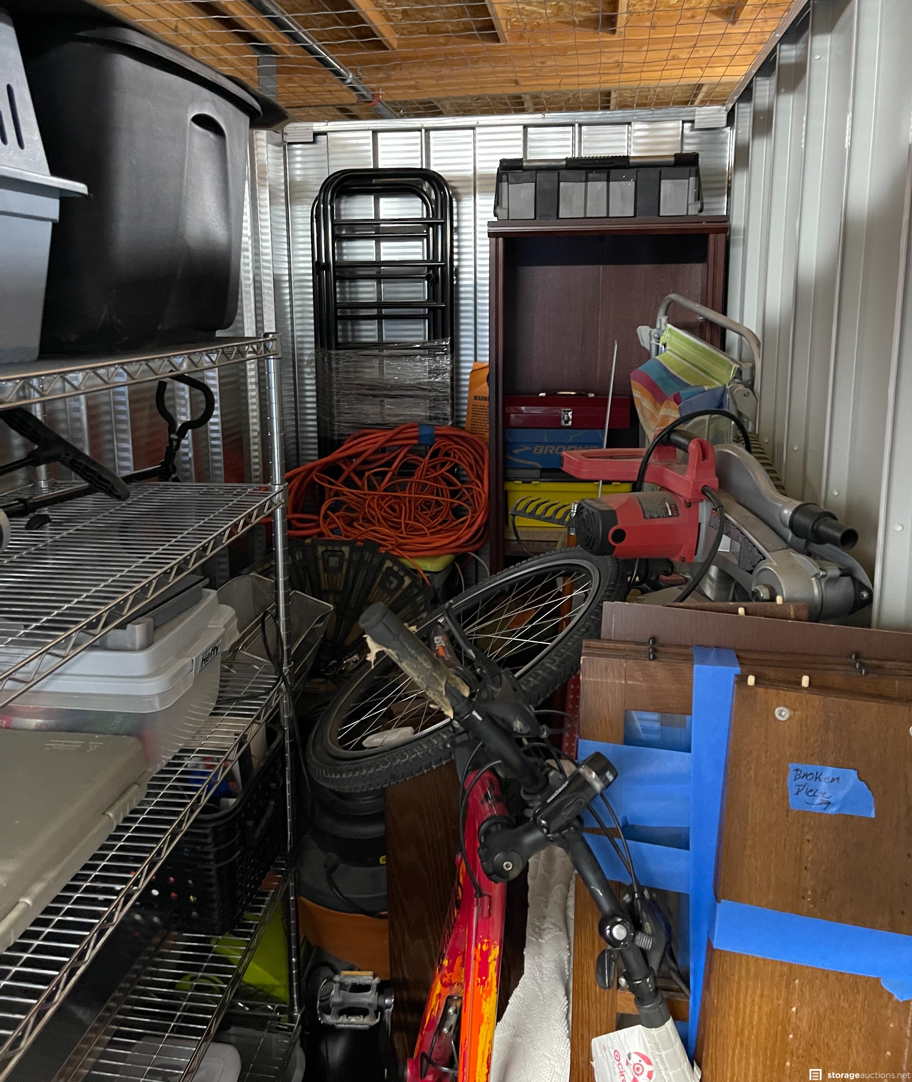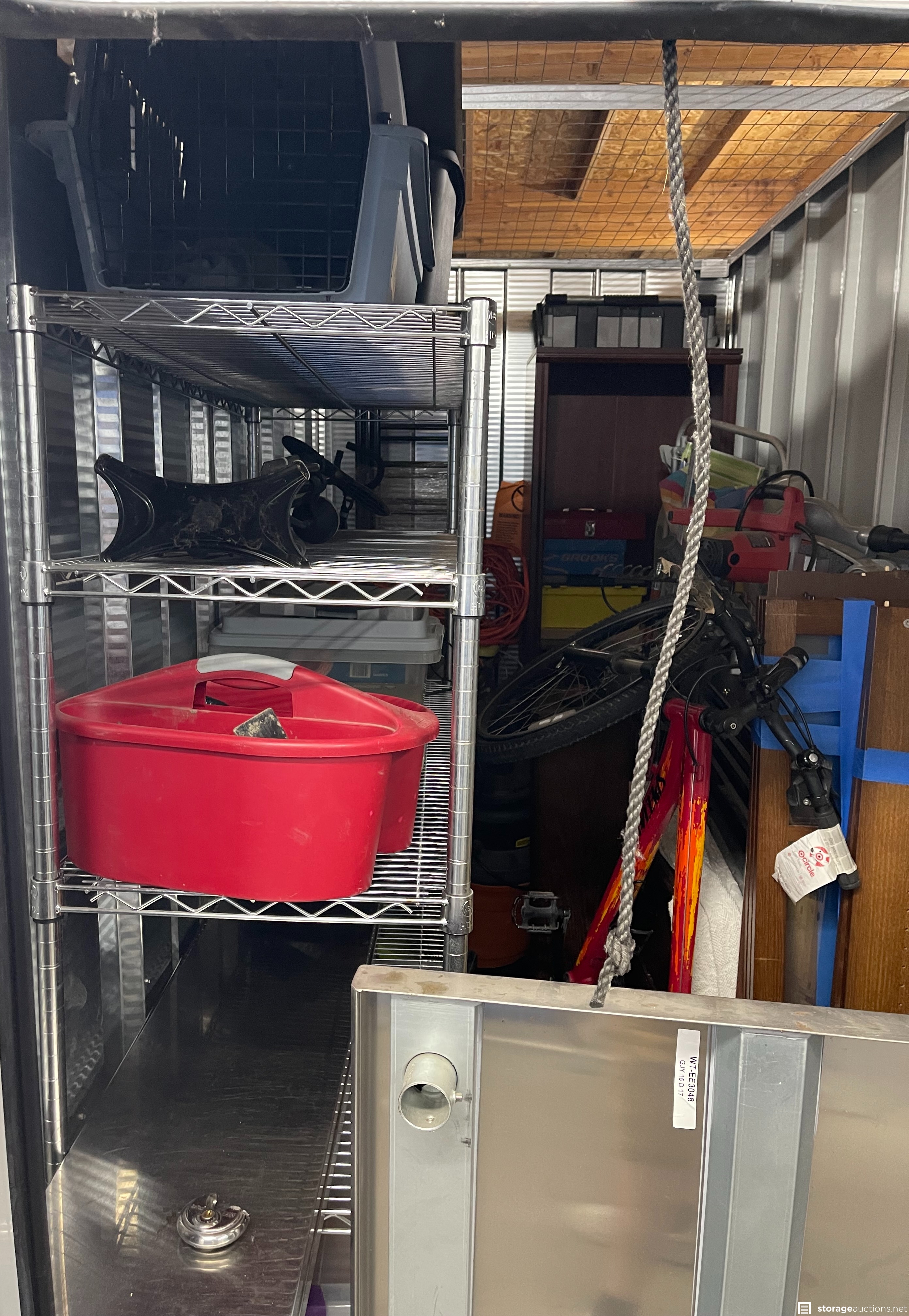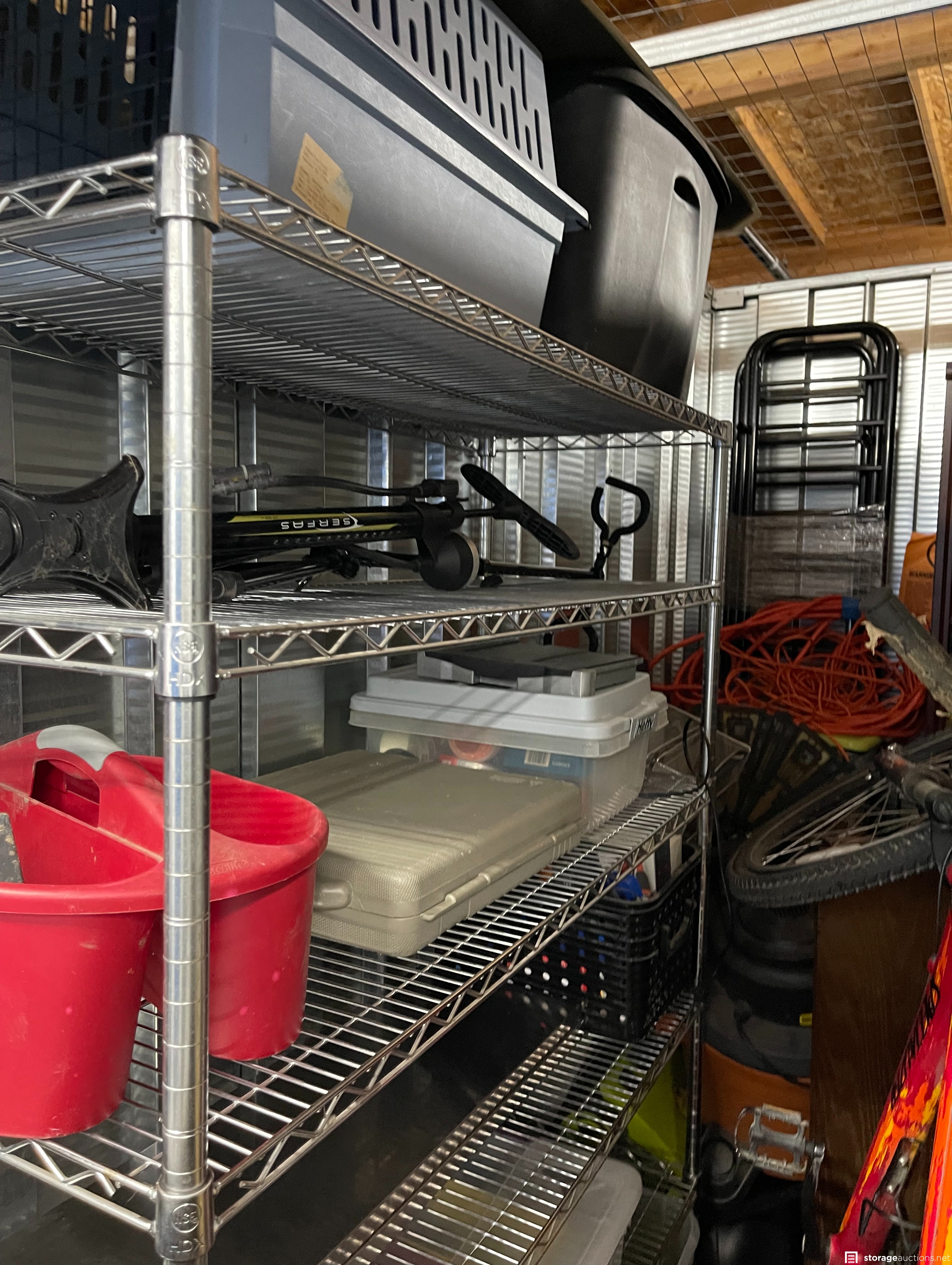 METAL SHELVING, MOUNTAIN BIKE, SAW BLADE, TOOLBOXES, PET CARRIER, DRESSER, STAINLESS STEEL TABLE, BEACH CHAIRS, SHOP VAC, BOOK CASE, MILK CRATES, DOLLIE, 24 TOTES, MISC. ITEMS.