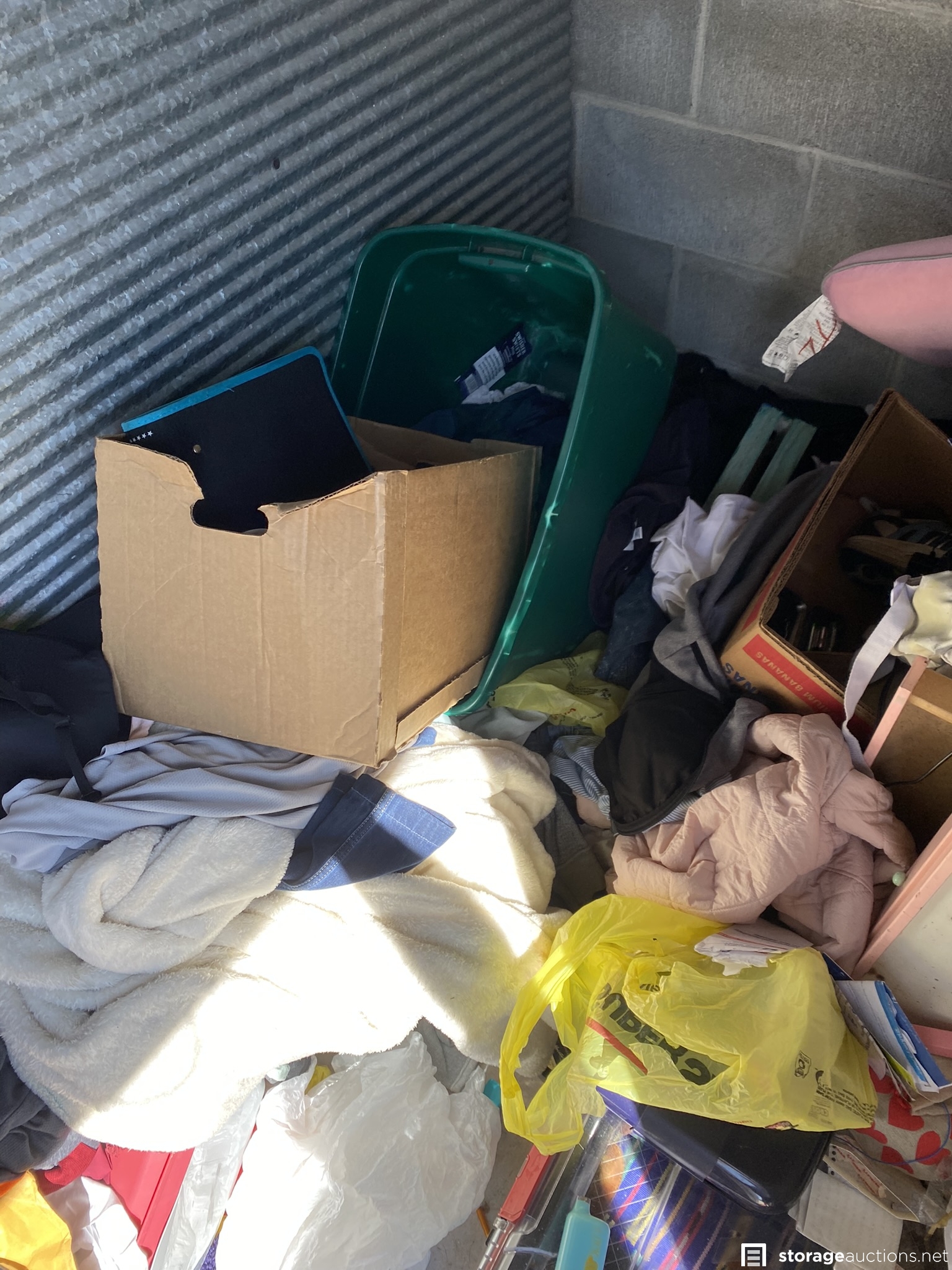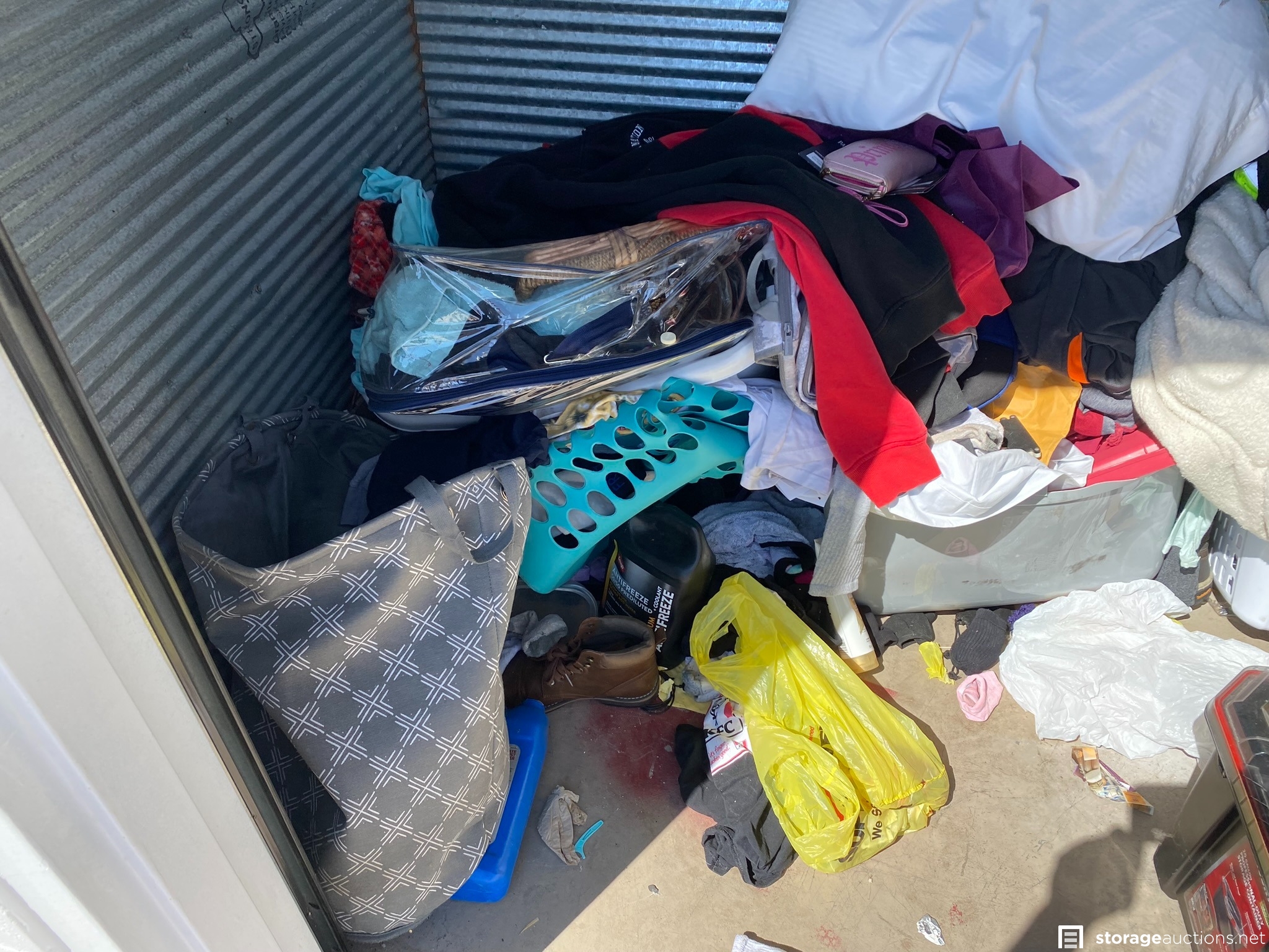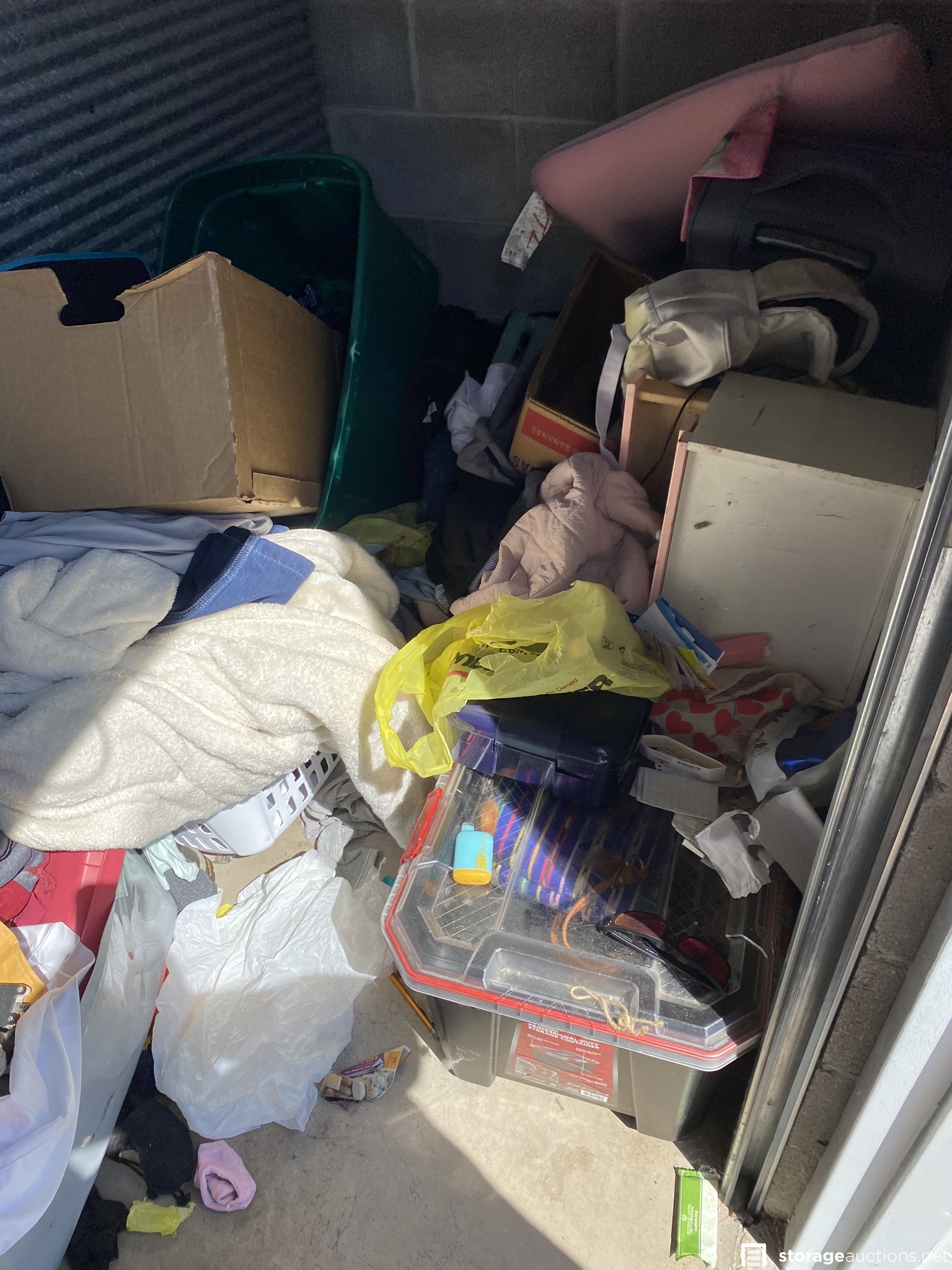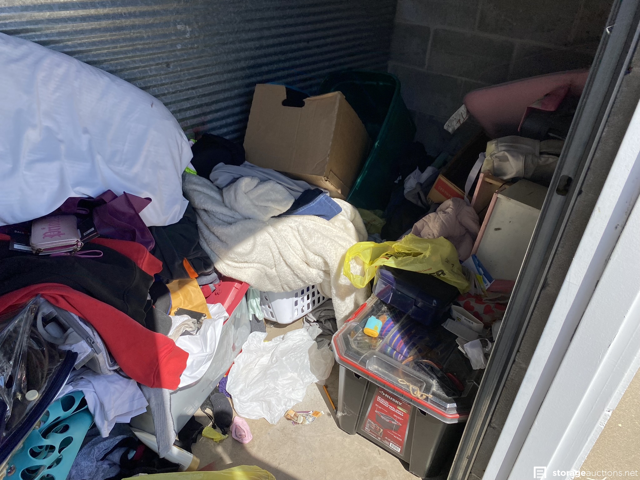Husky storage container, suitcase and various household goods.