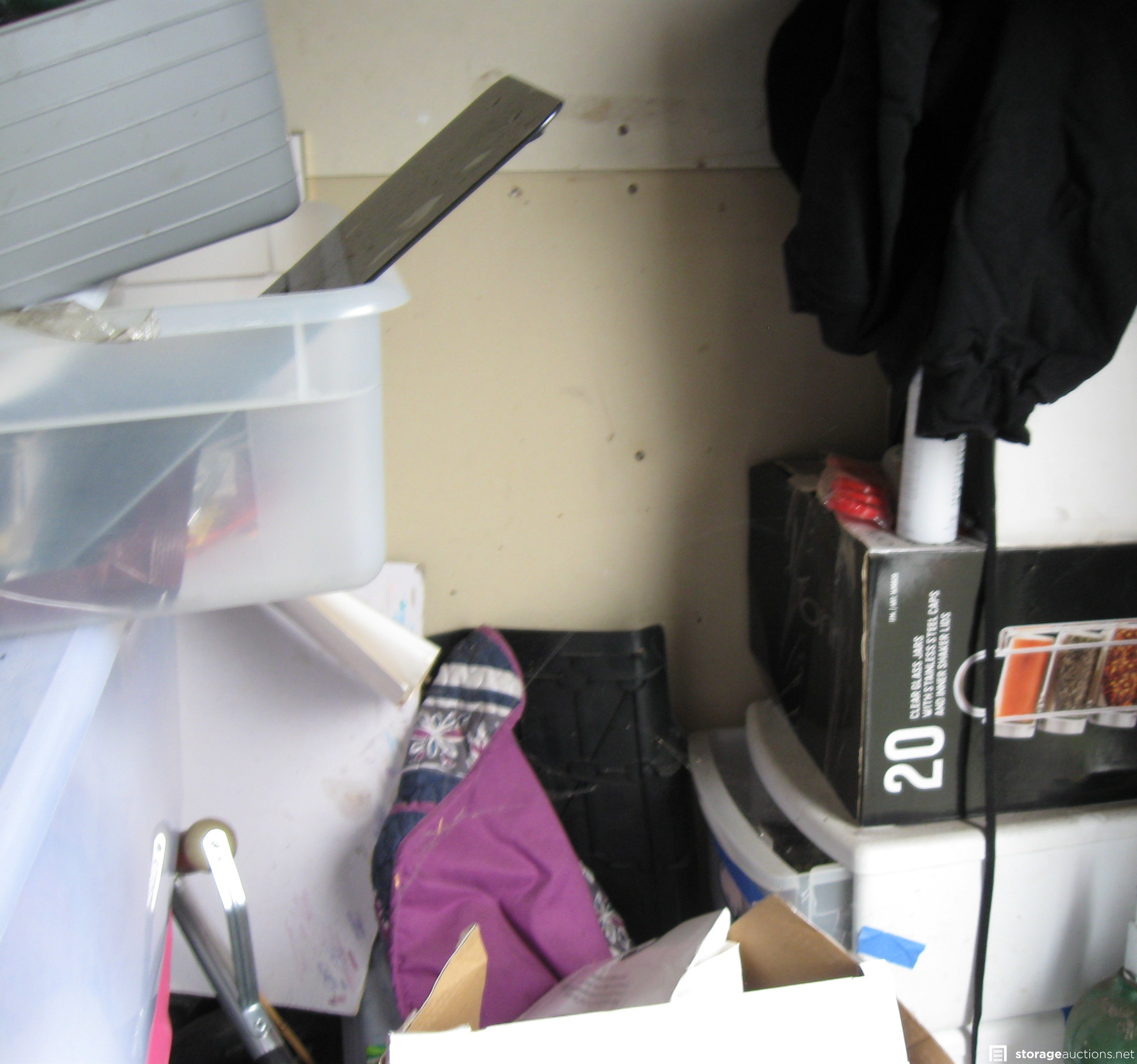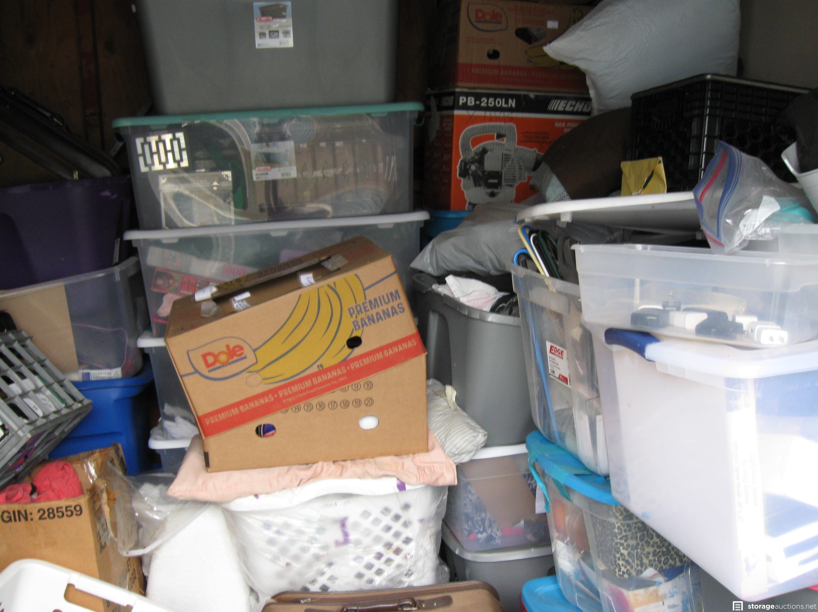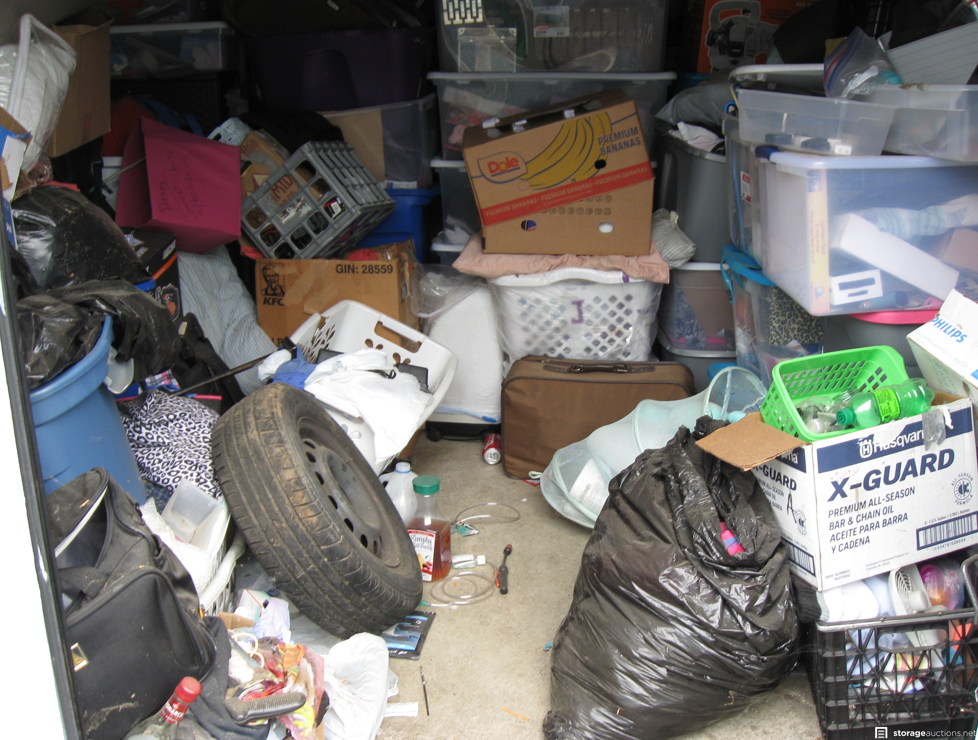 Unit appears to contain household items, suitcases, tire, jewelry box, snow tire cables