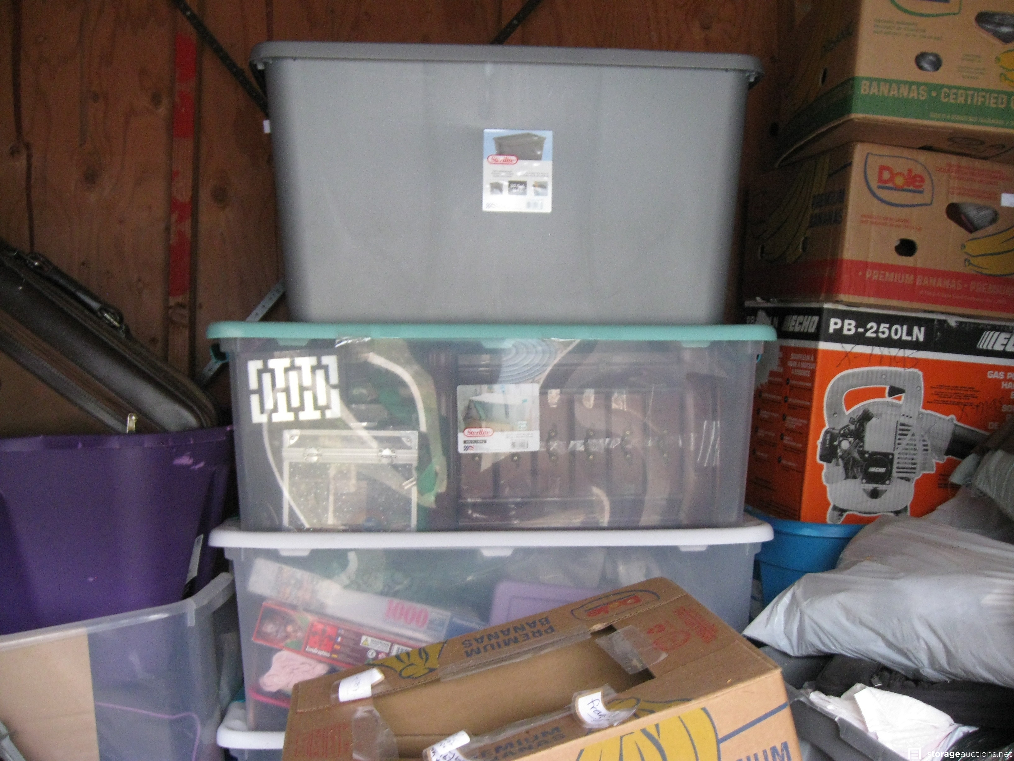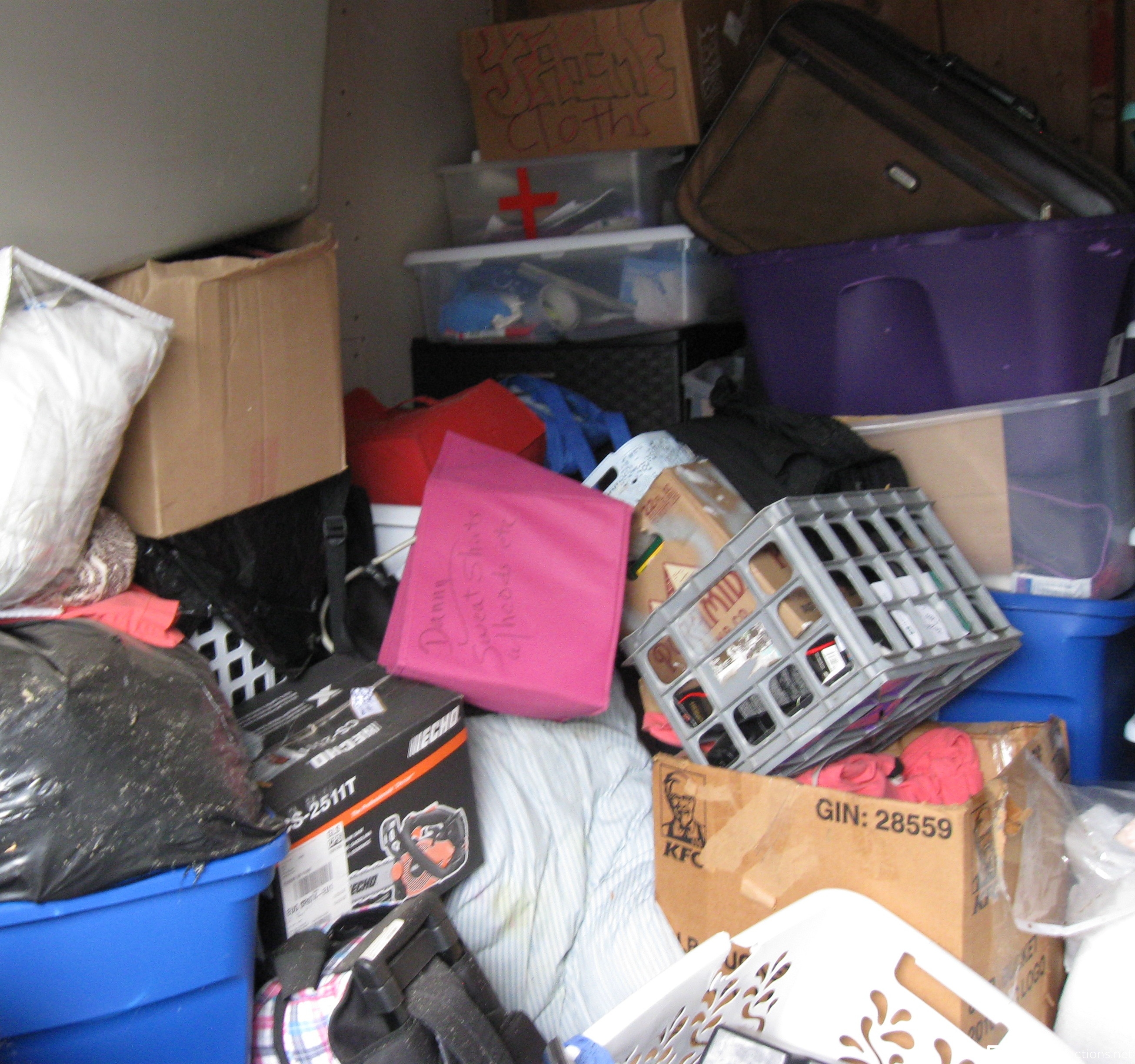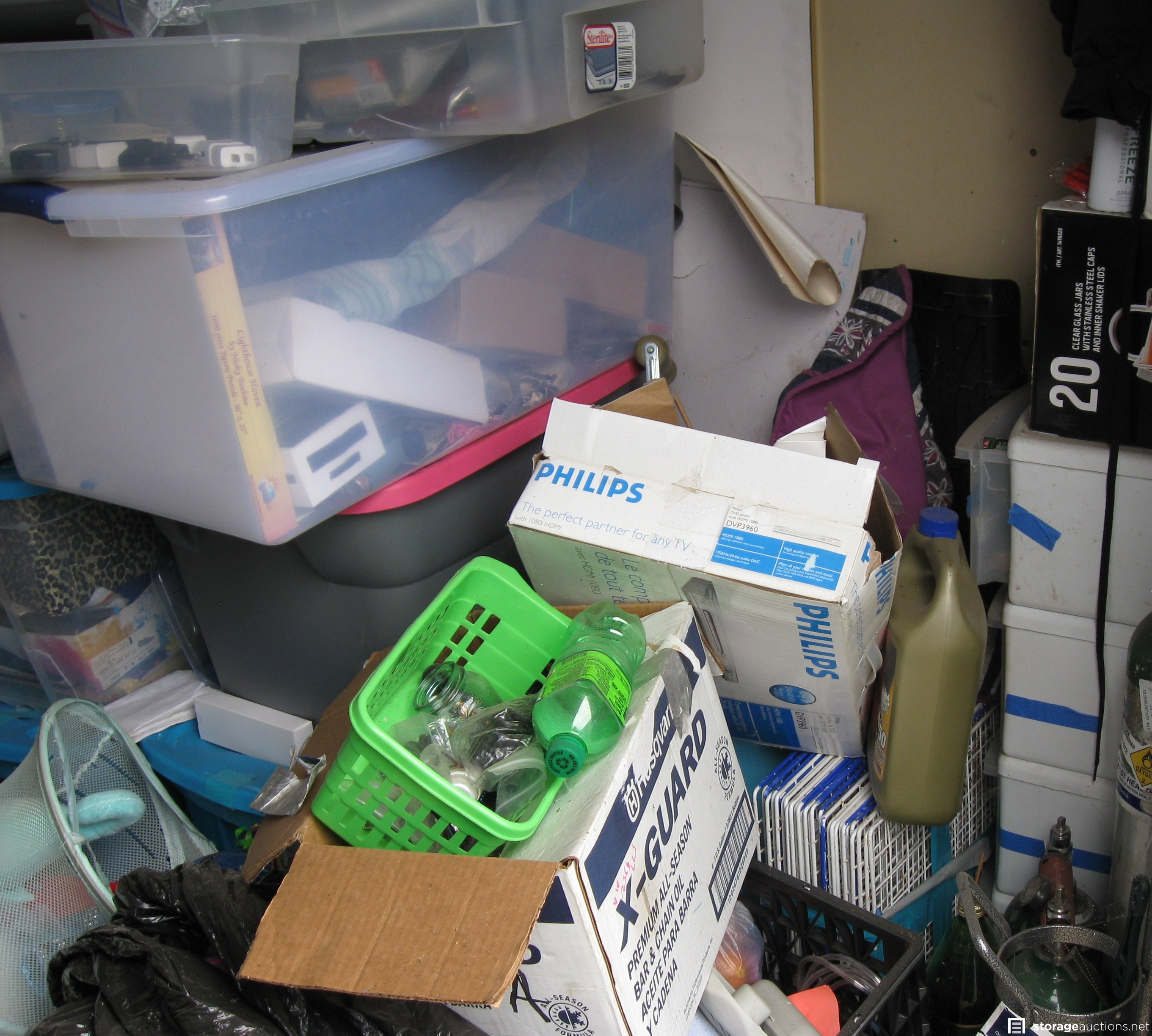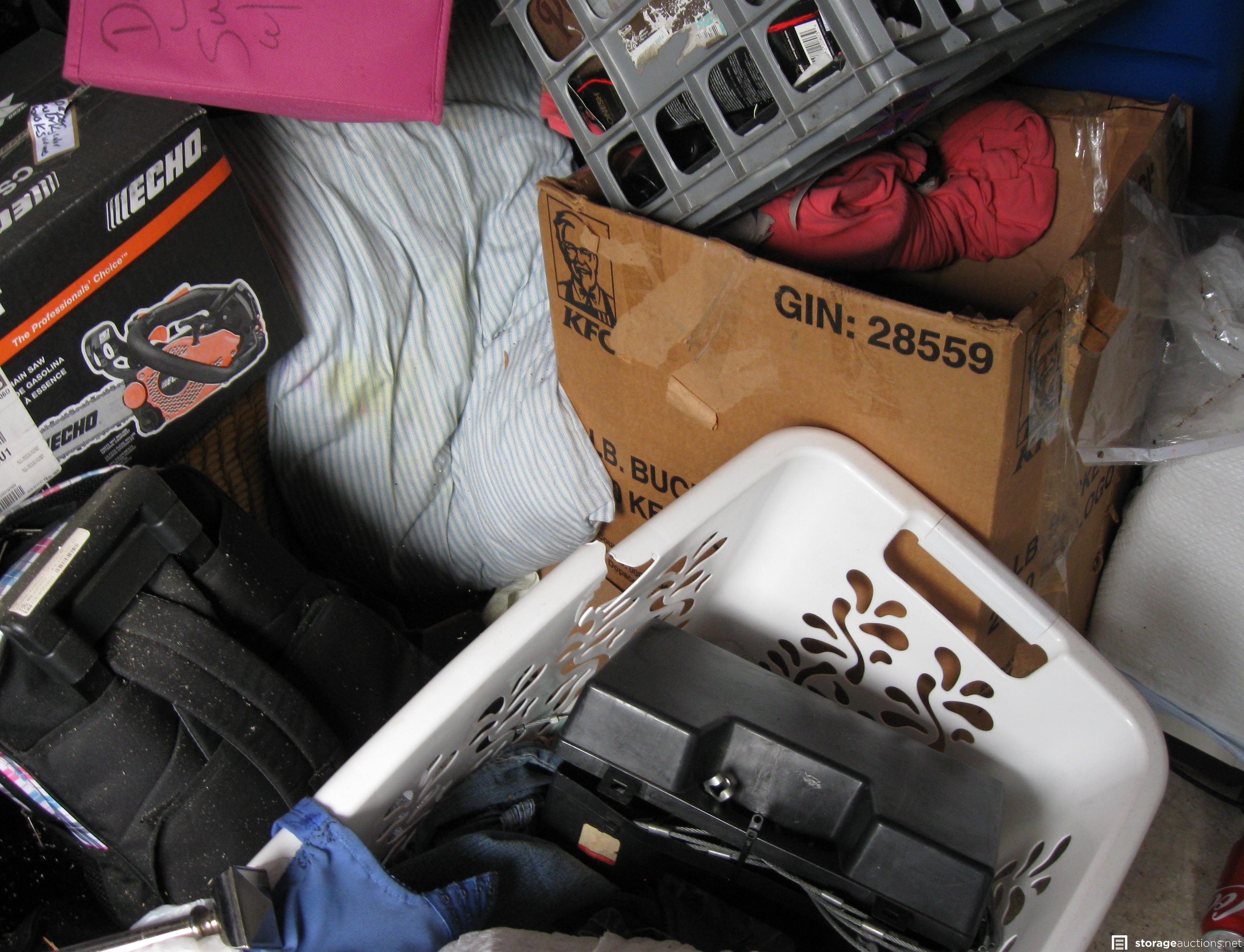 Unit appears to contain household items, suitcases, tire, jewelry box, snow tire cables
