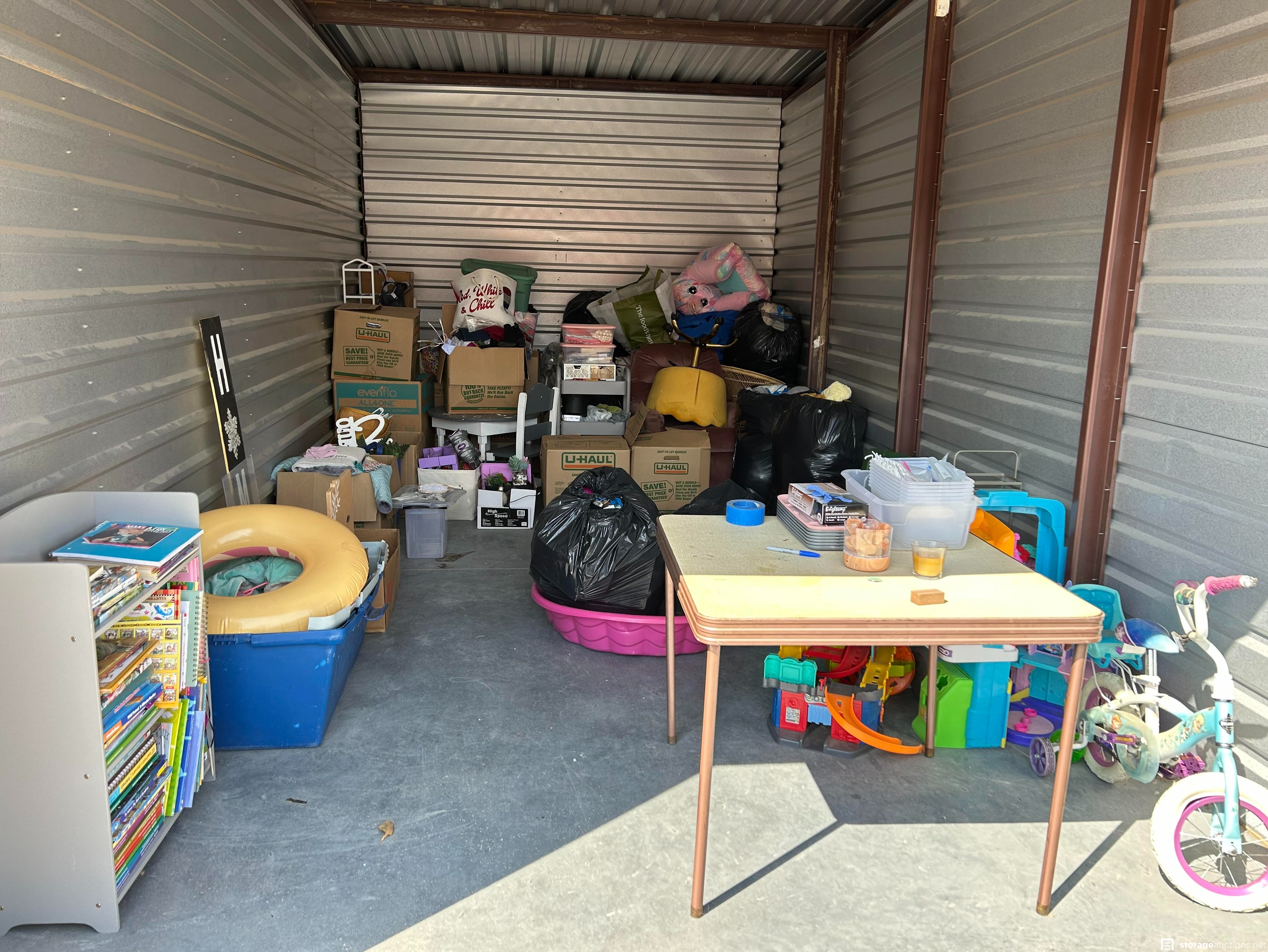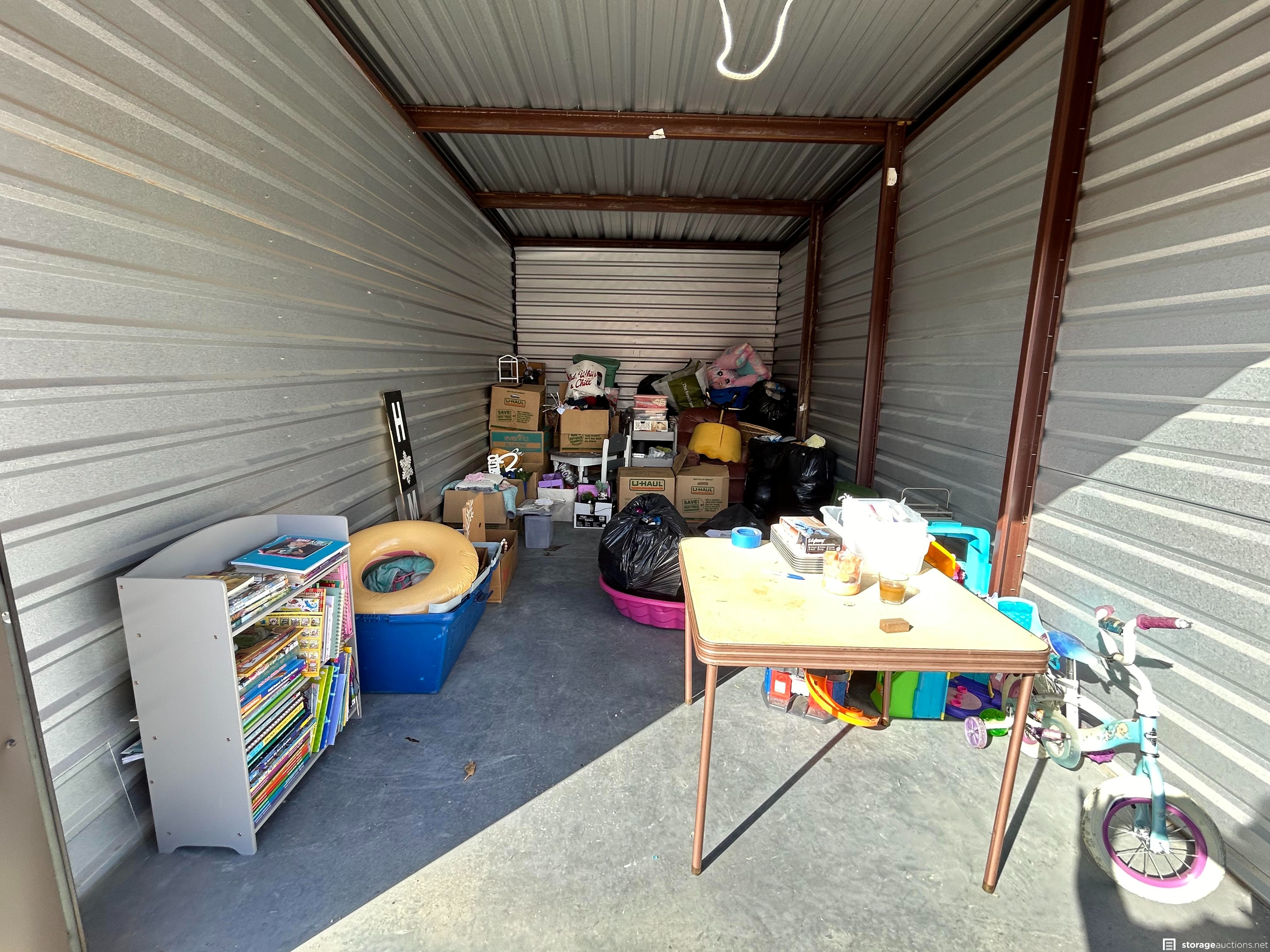 This units includes a bookshelf full of kids books, a square table, a kids bike with training wheels, home decor, a pool floatie, clothes, chairs, what appears to be a recliner, roller blades, a metal cart with three shelves, plastic tubs and lids, reusable tote bags, and miscellaneous bags and boxes.