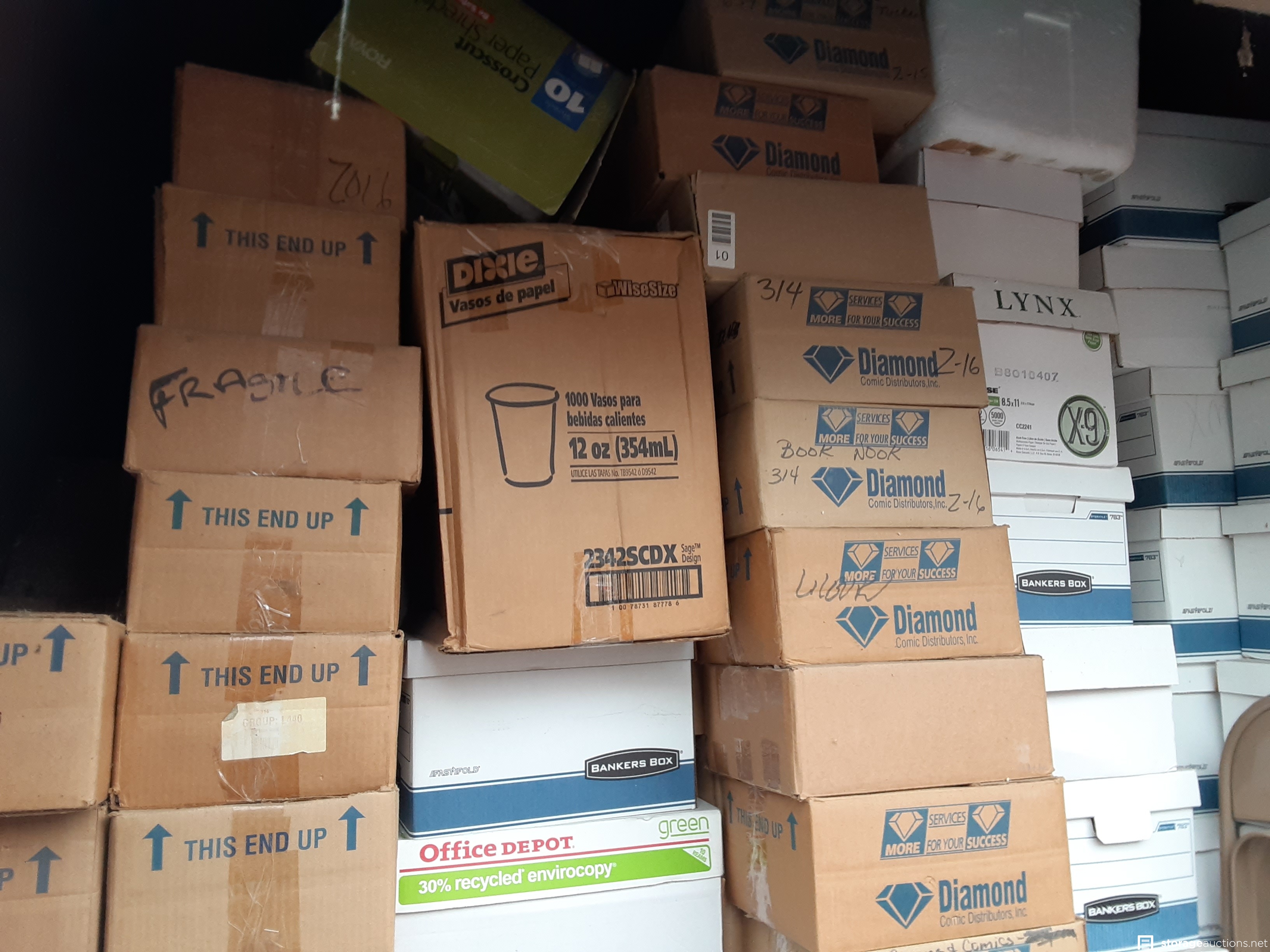 BOXES FILLED WITH COLLECTIBLE TITAN COMICS, TITAN GAMES, BOOKS, DVDS. FOLDING CHAIR, PROJECTOR SCREEN. UNKNOWN ITEMS STORED IN BACK OF UNIT.