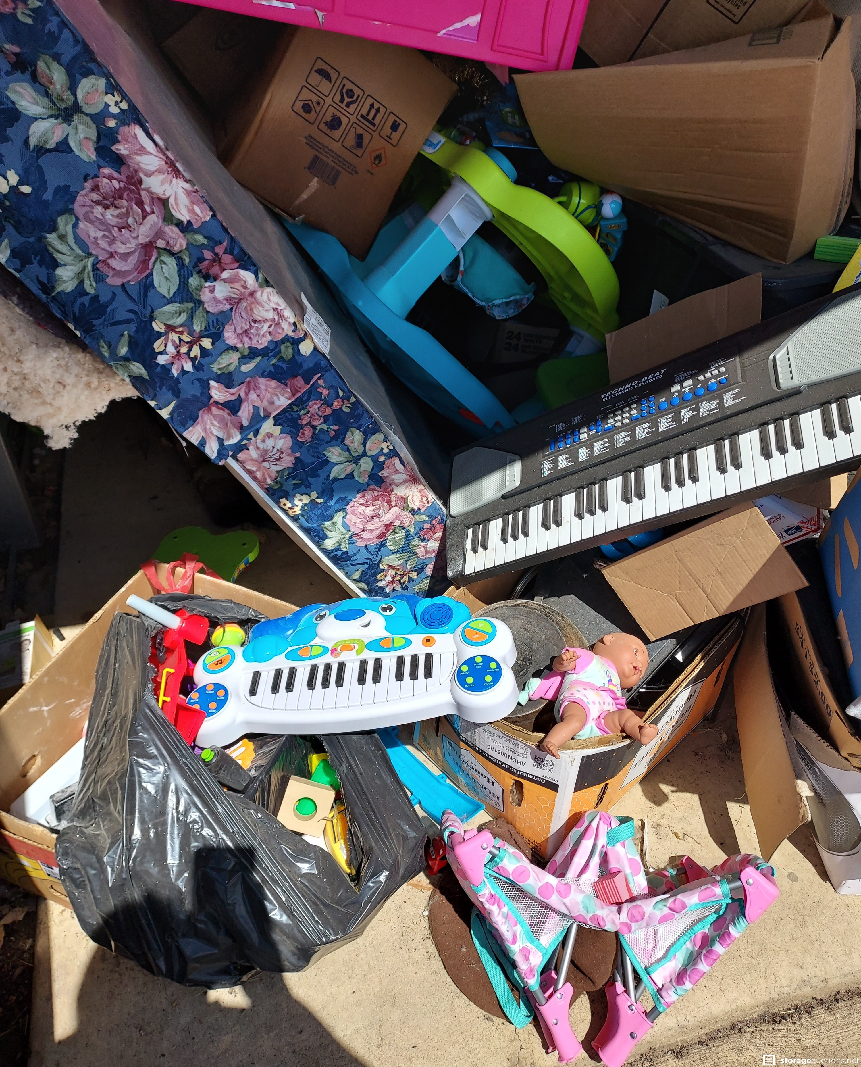 Box spring, chairs, battery-operated child's toy car, various children's toys, multiple boxes with unknown contents.