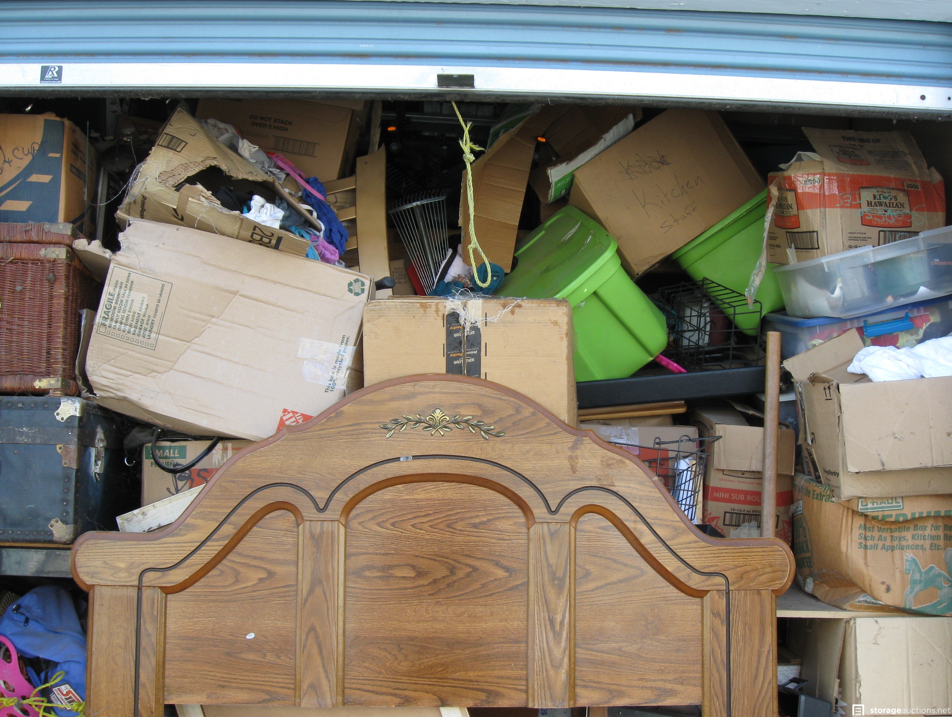 Unit appears to contain; trunks, tool box, shelving unit, dresser, boxes, yard, tools, headboard, walker, old sewing machine-in desk, and household items.