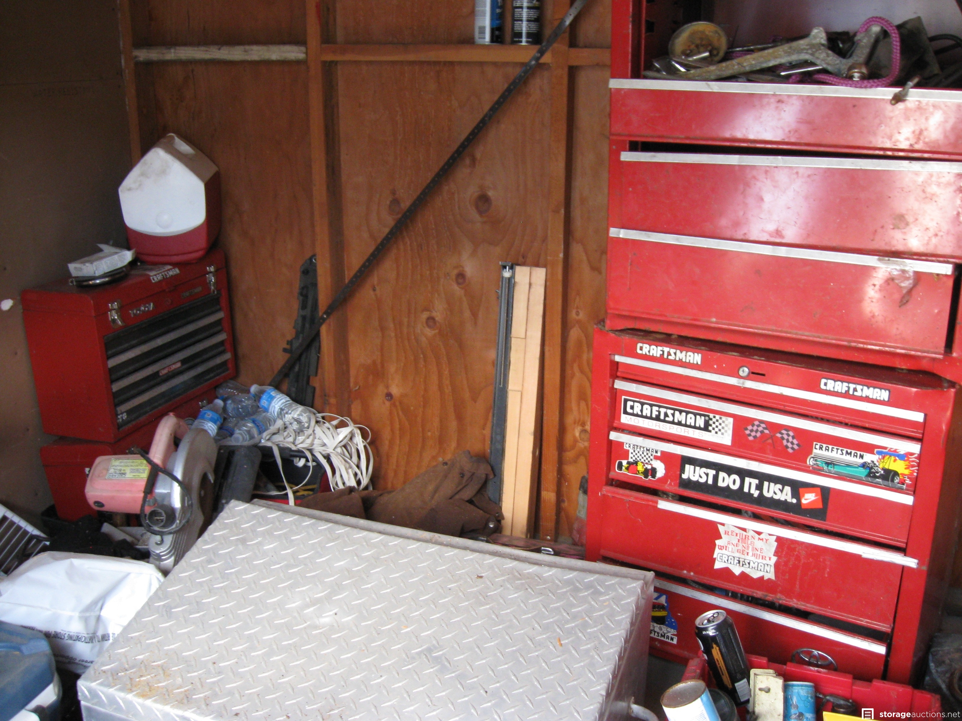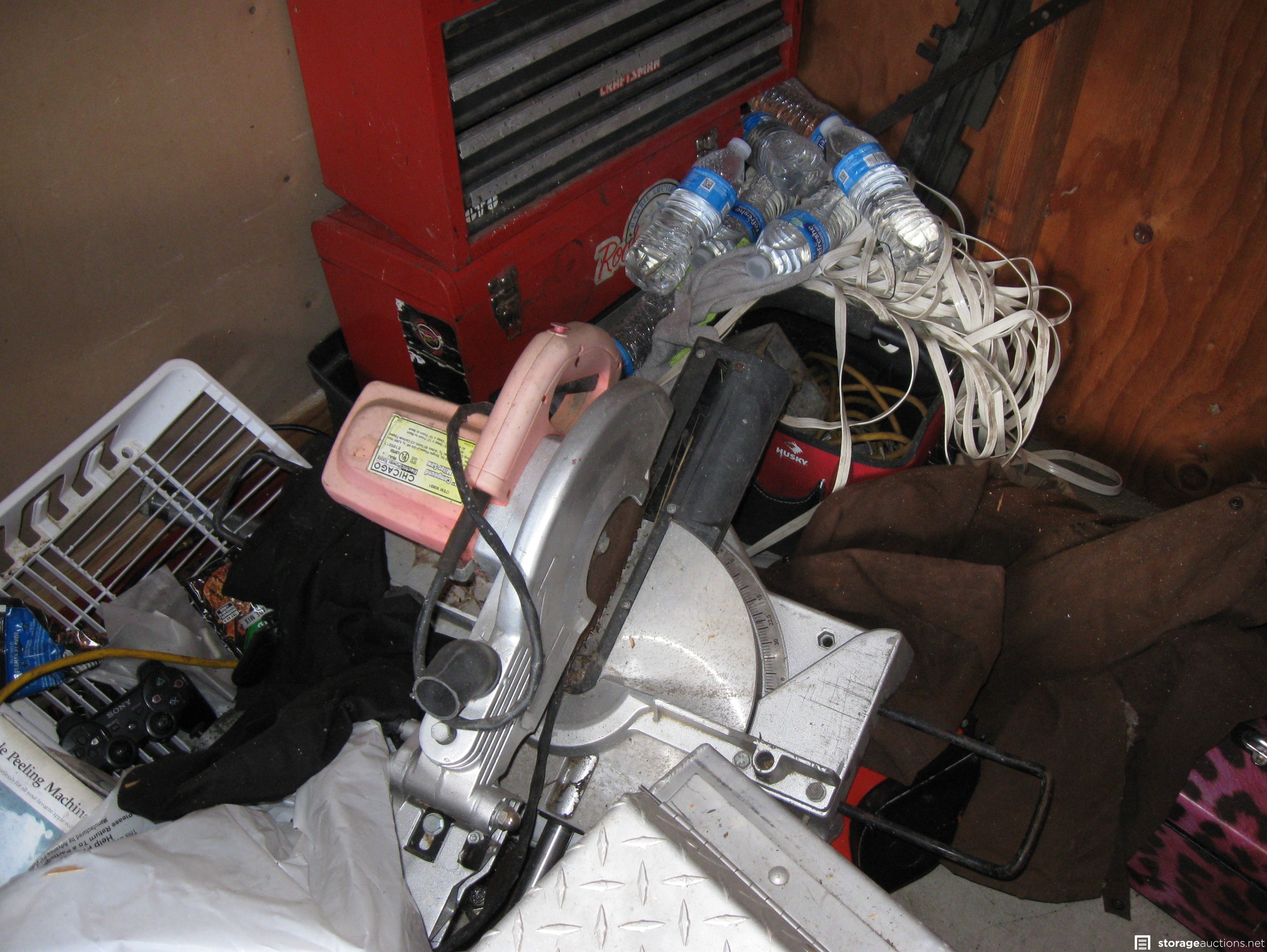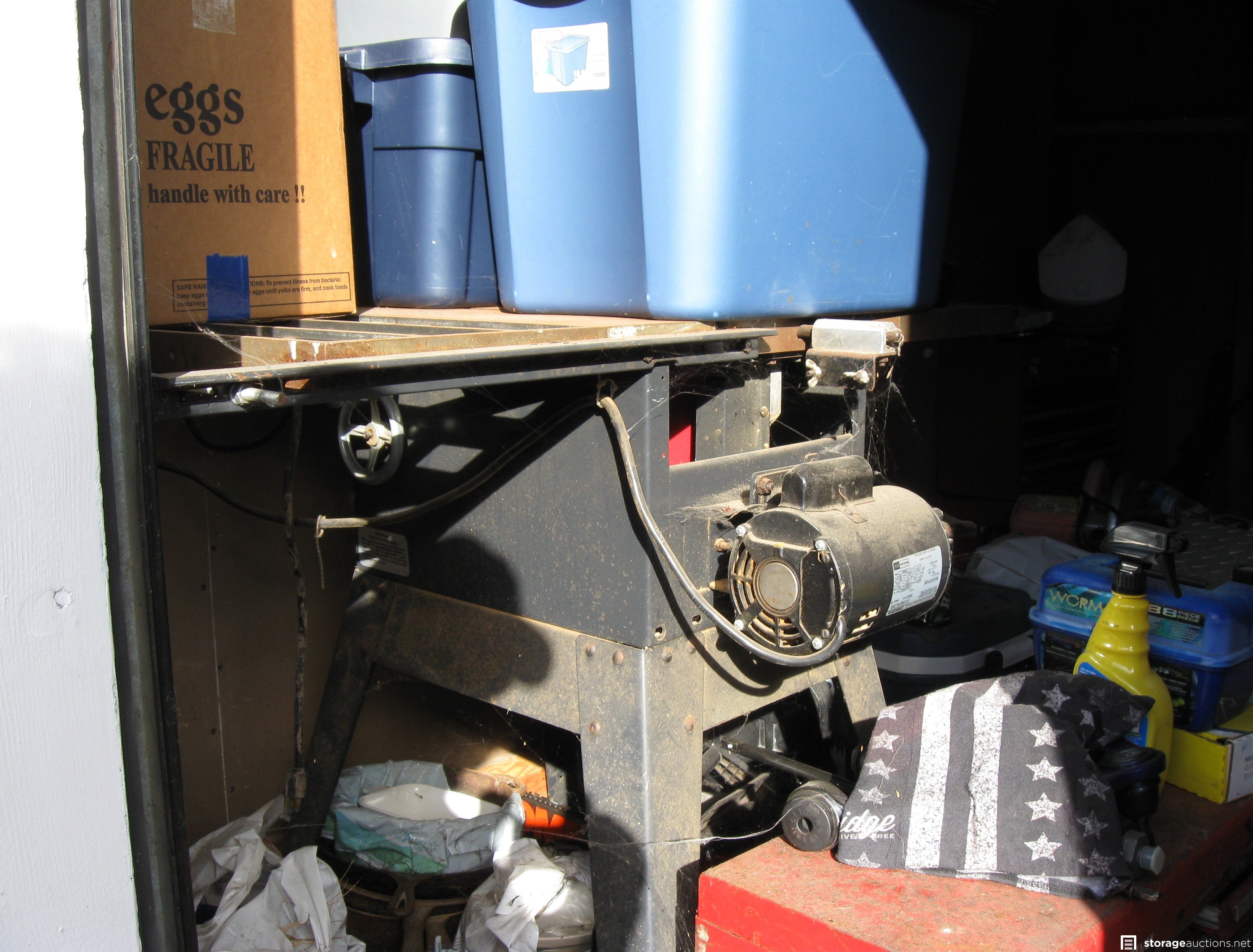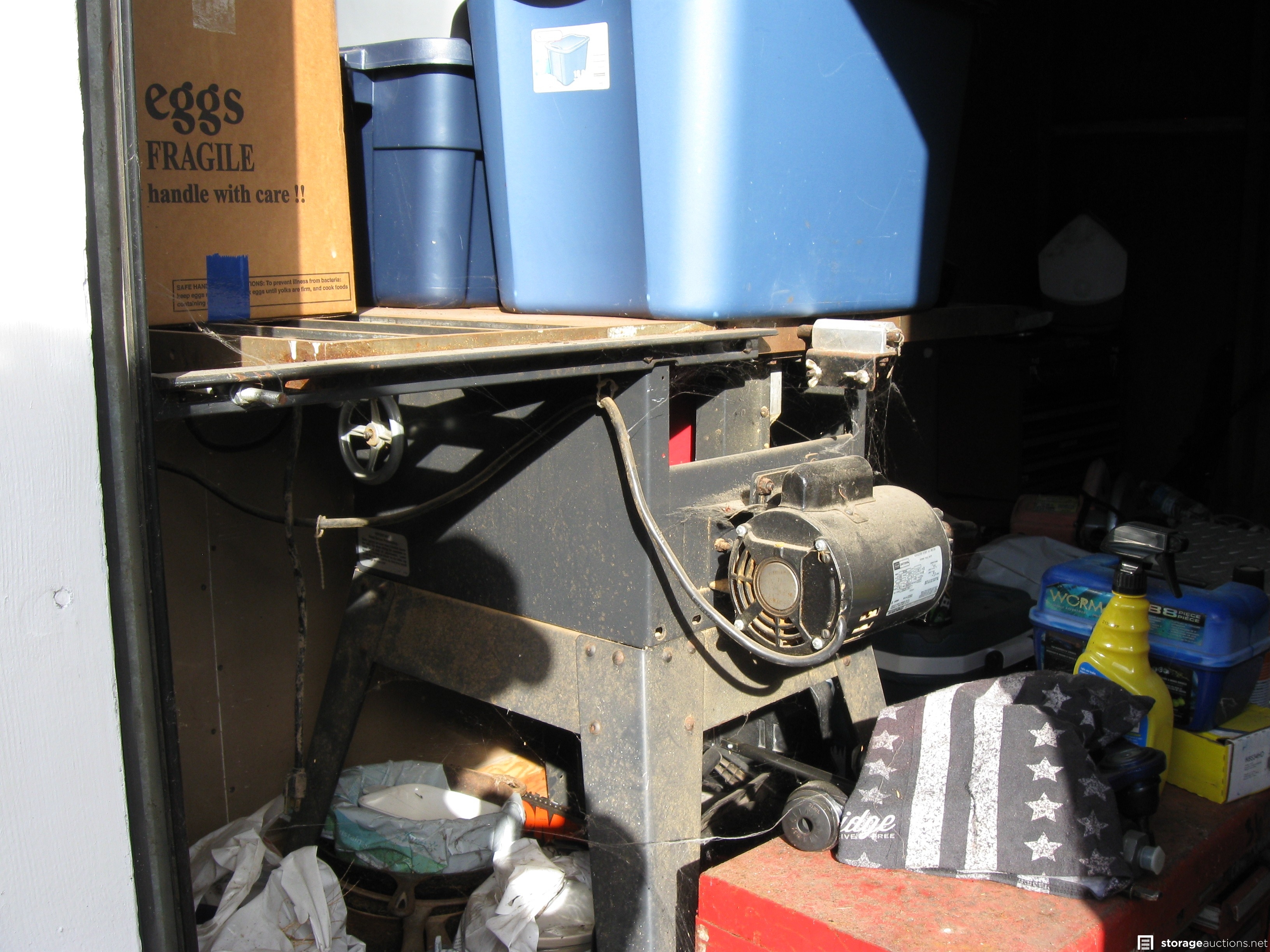 Unit appears to contain; table saw, tool box, tools, cast-iron skillets, miter saw, wood twin bed frame