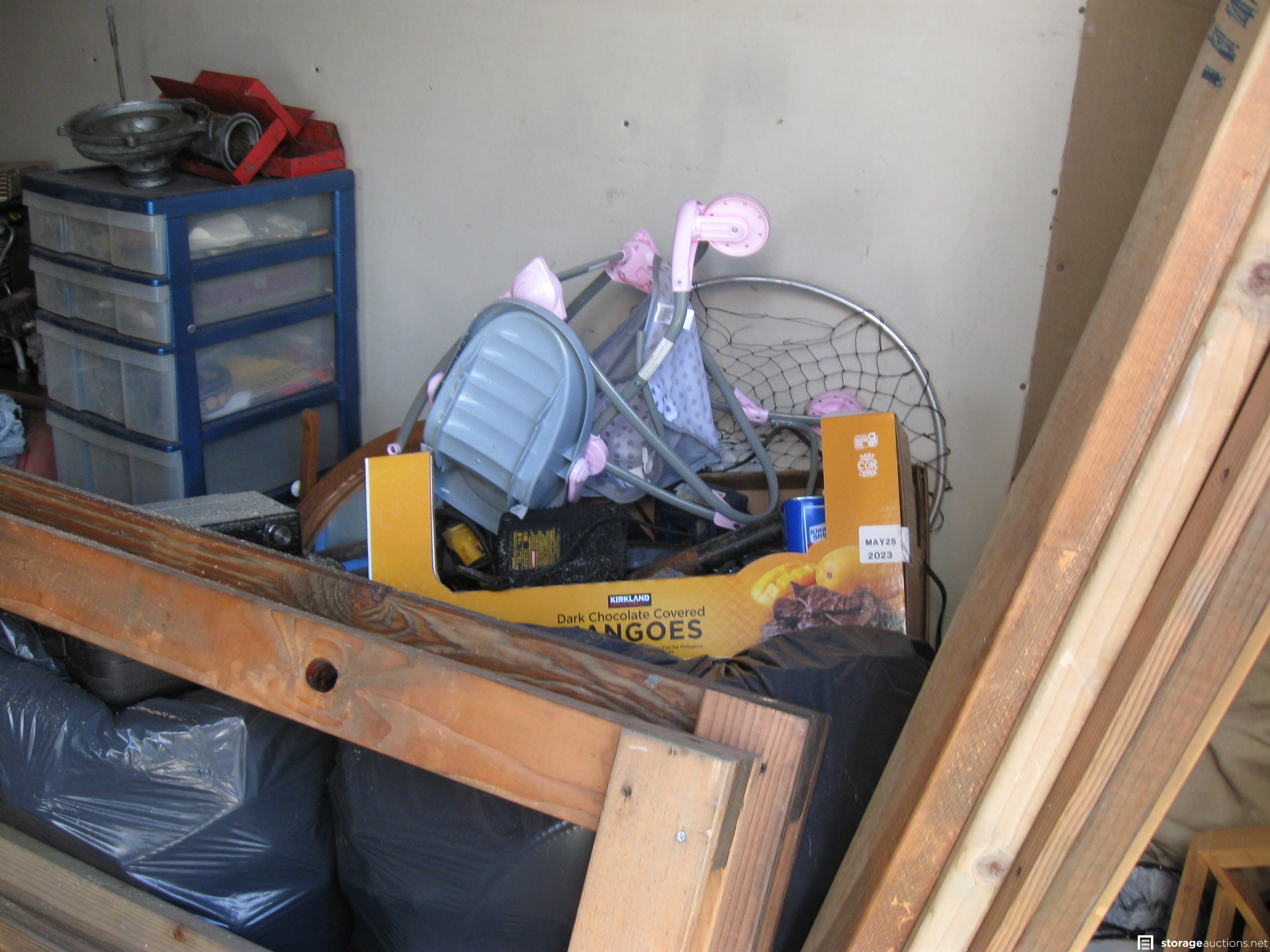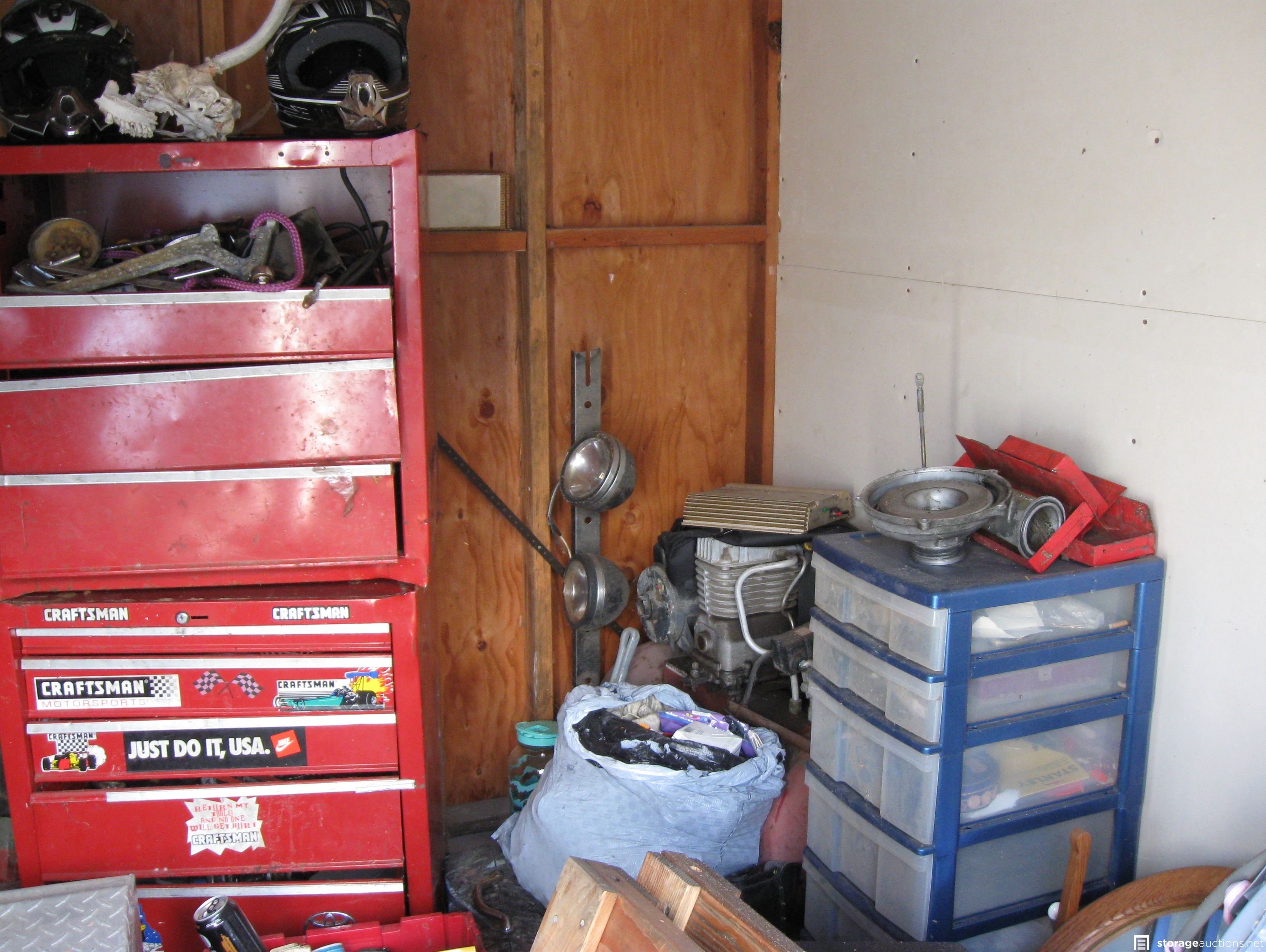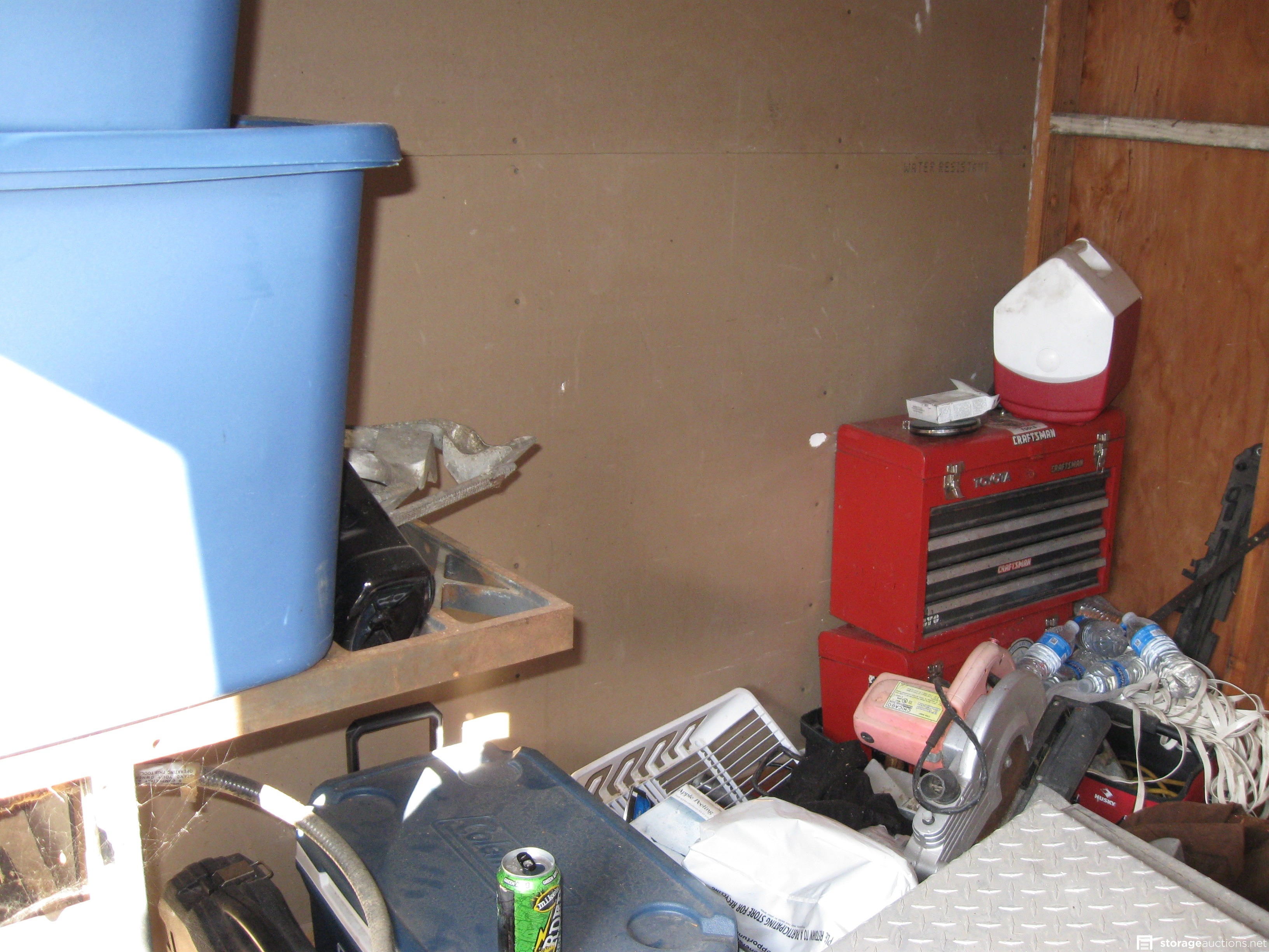 Unit appears to contain; table saw, tool box, tools, cast-iron skillets, miter saw, wood twin bed frame
