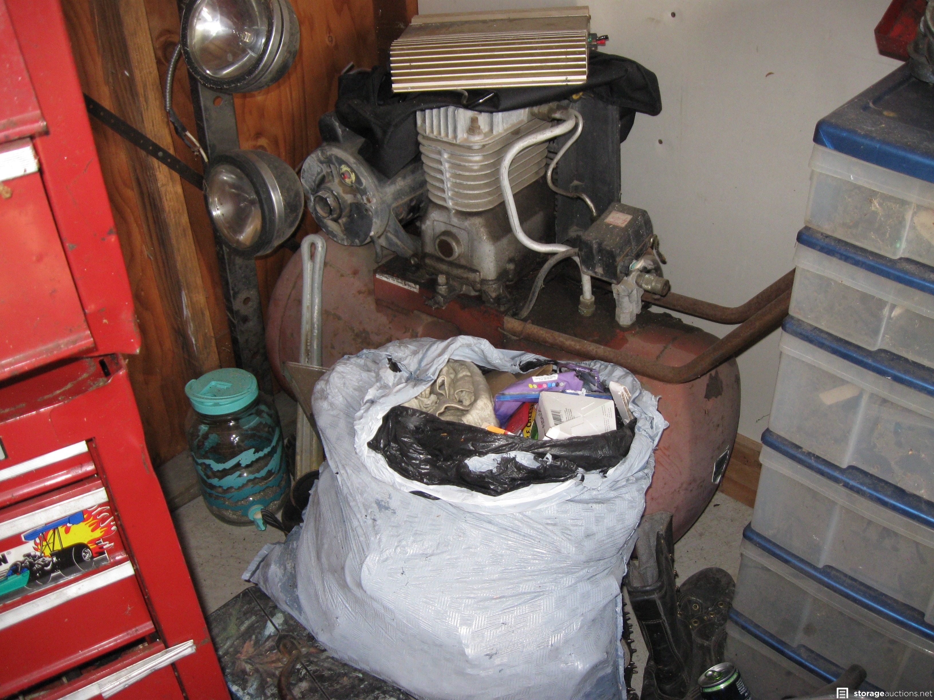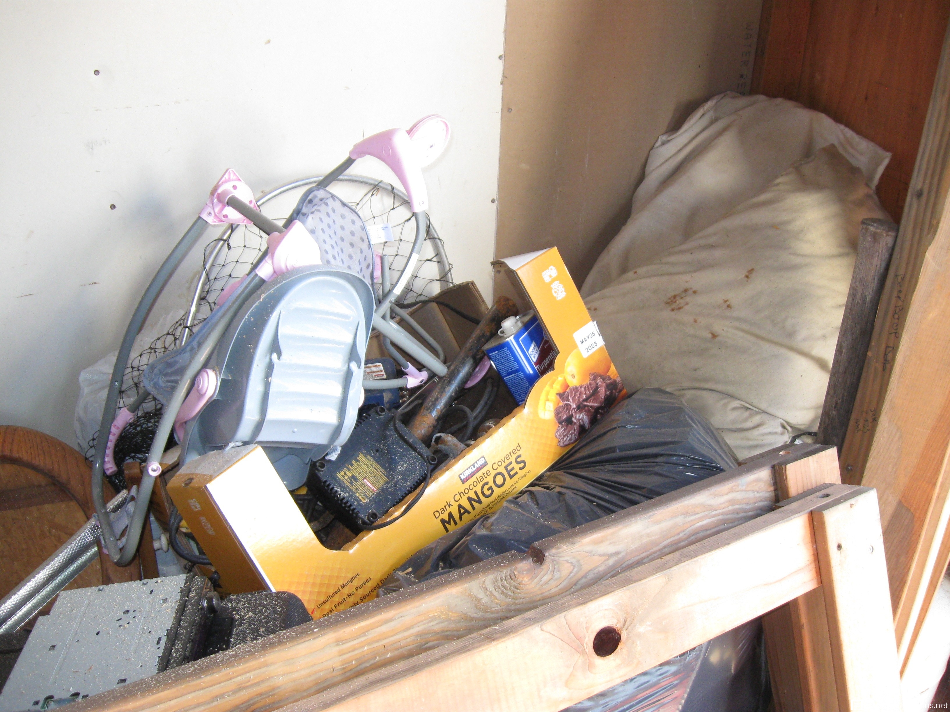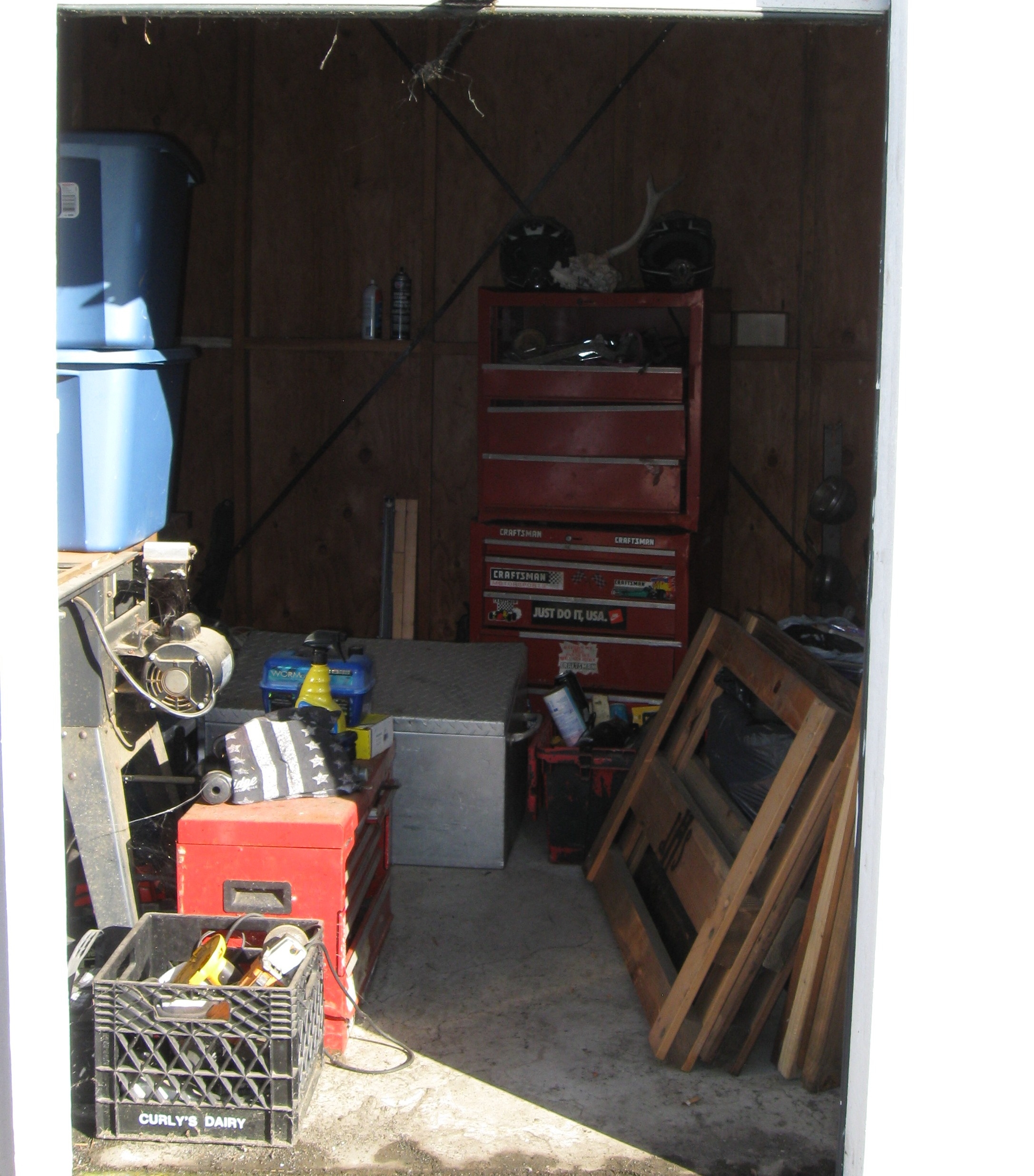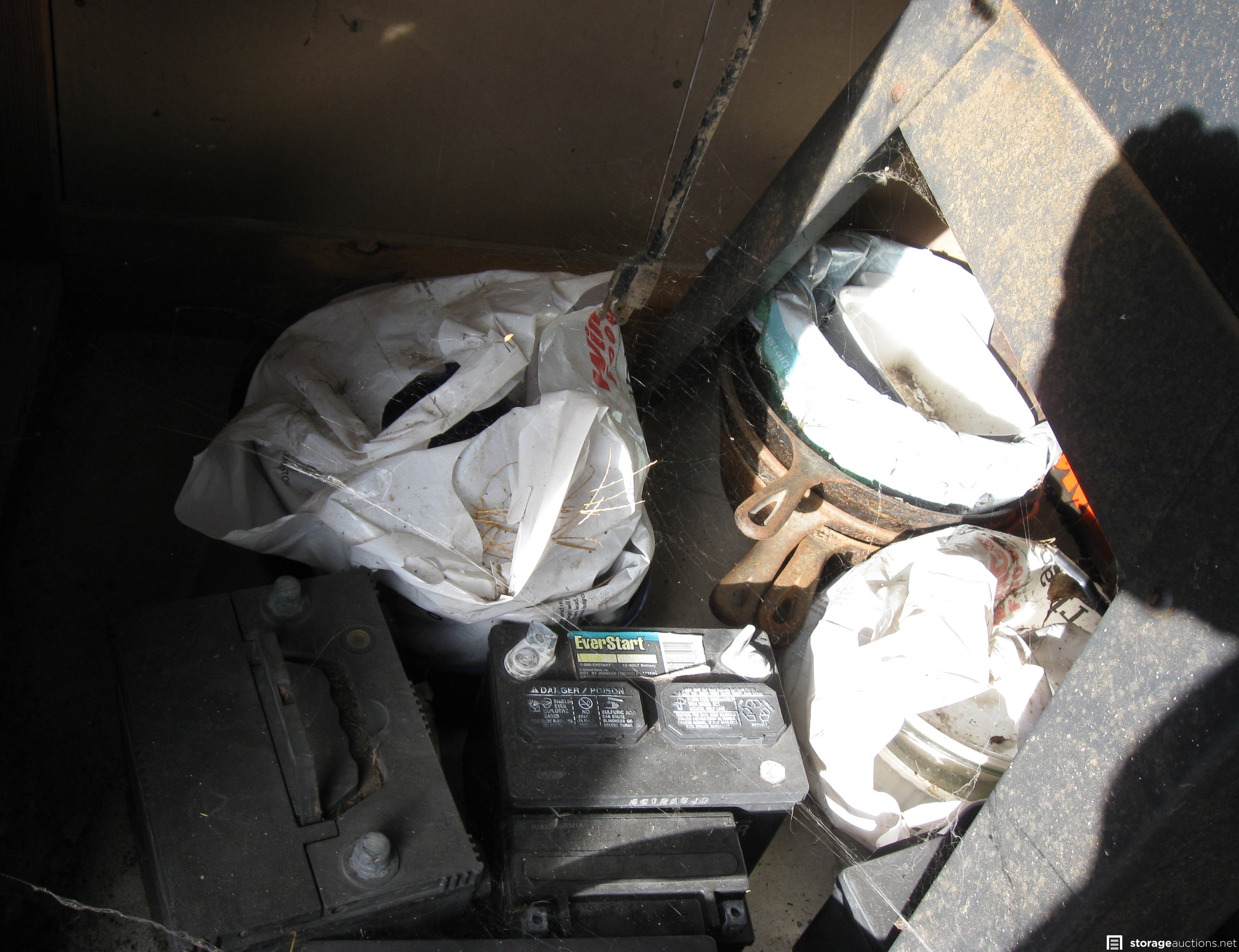 Unit appears to contain; table saw, tool box, tools, cast-iron skillets, miter saw, wood twin bed frame