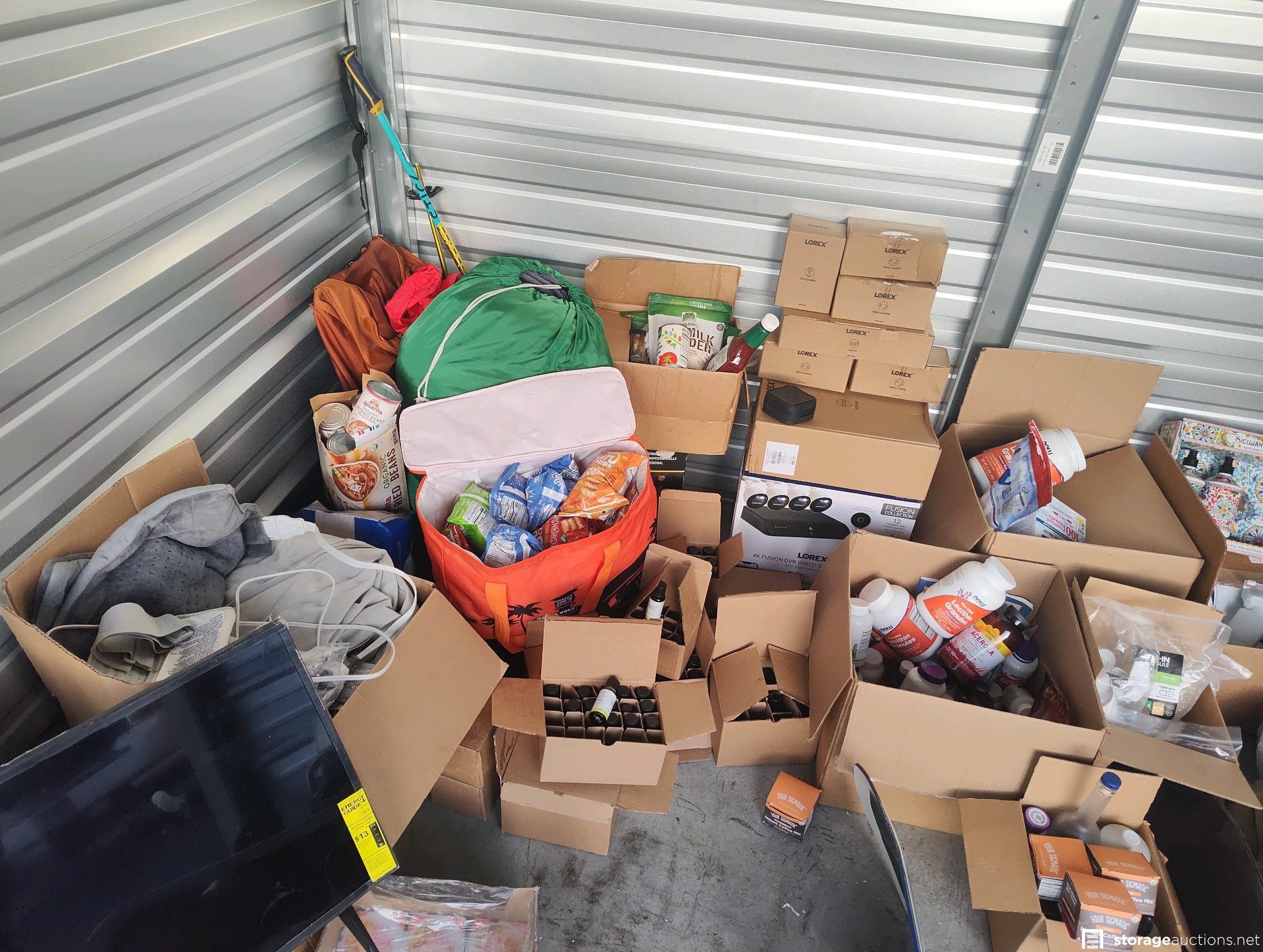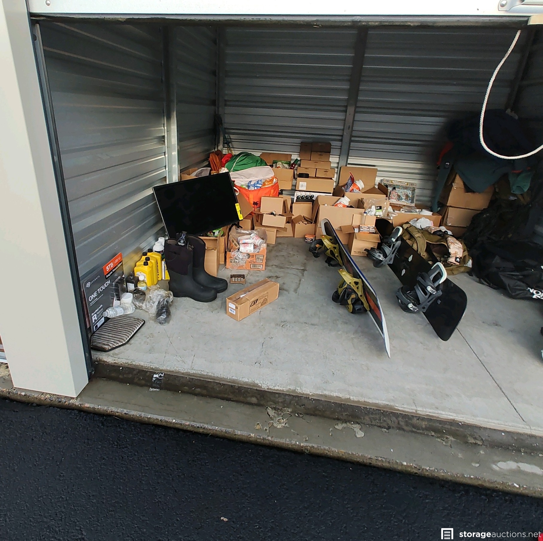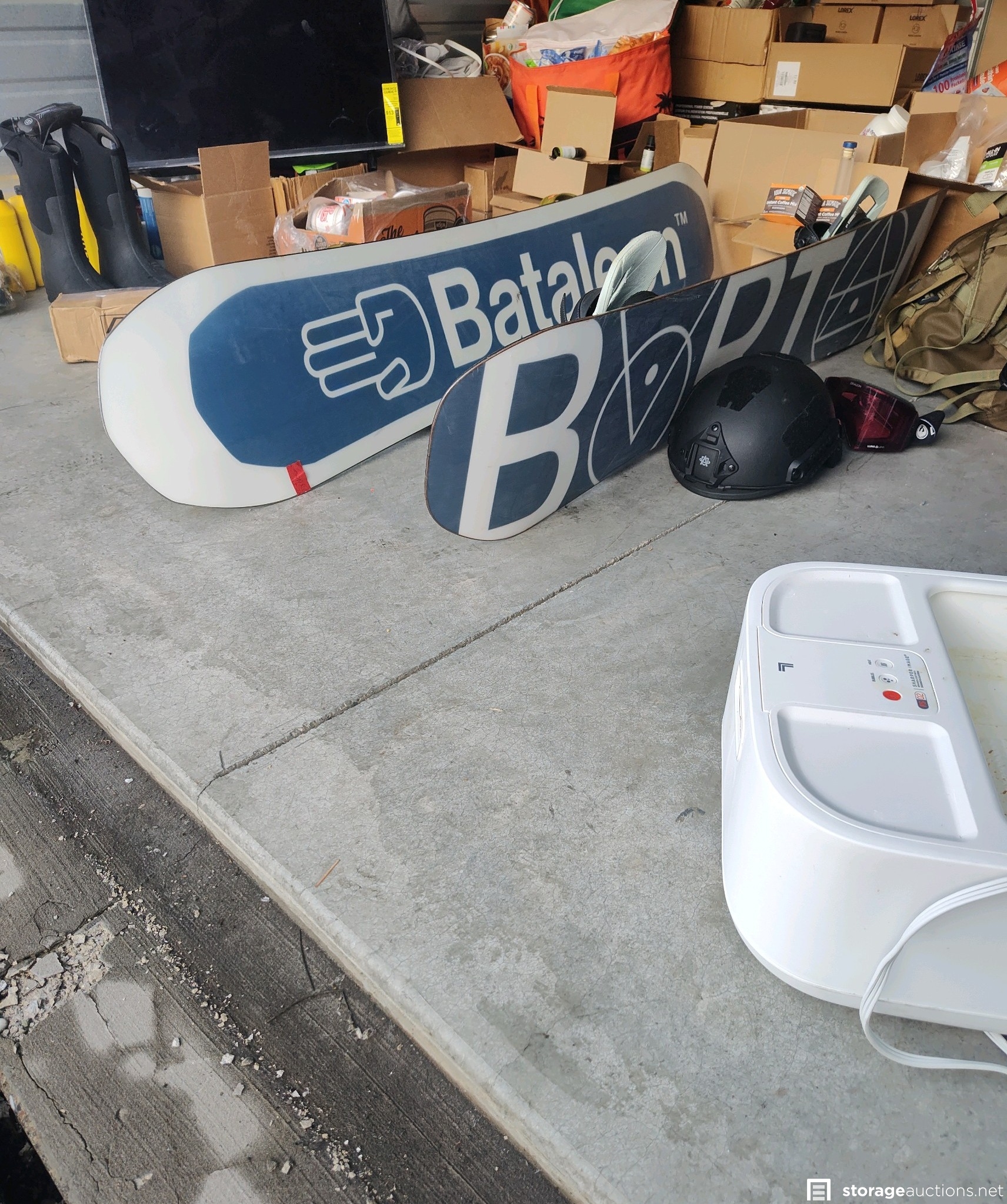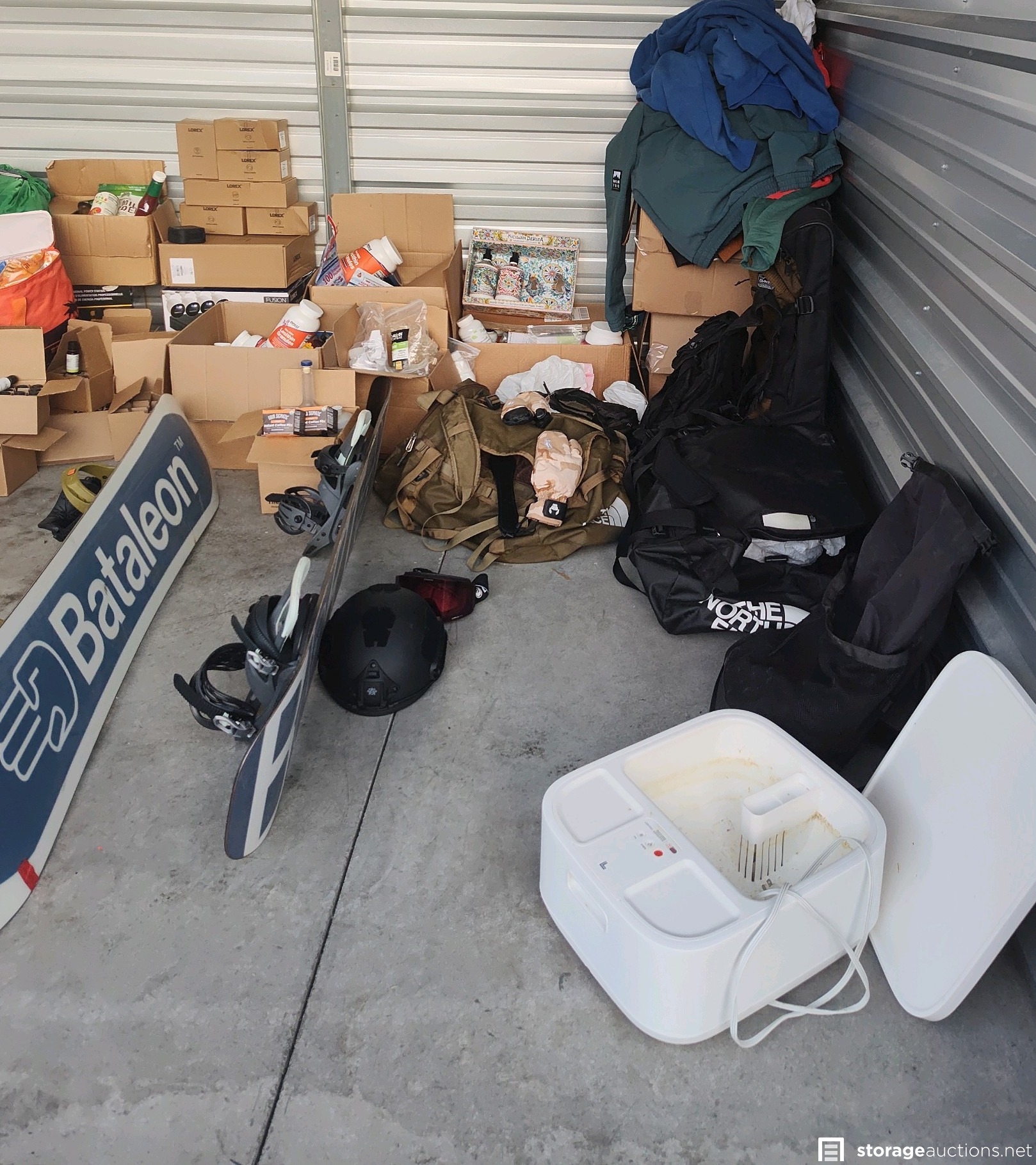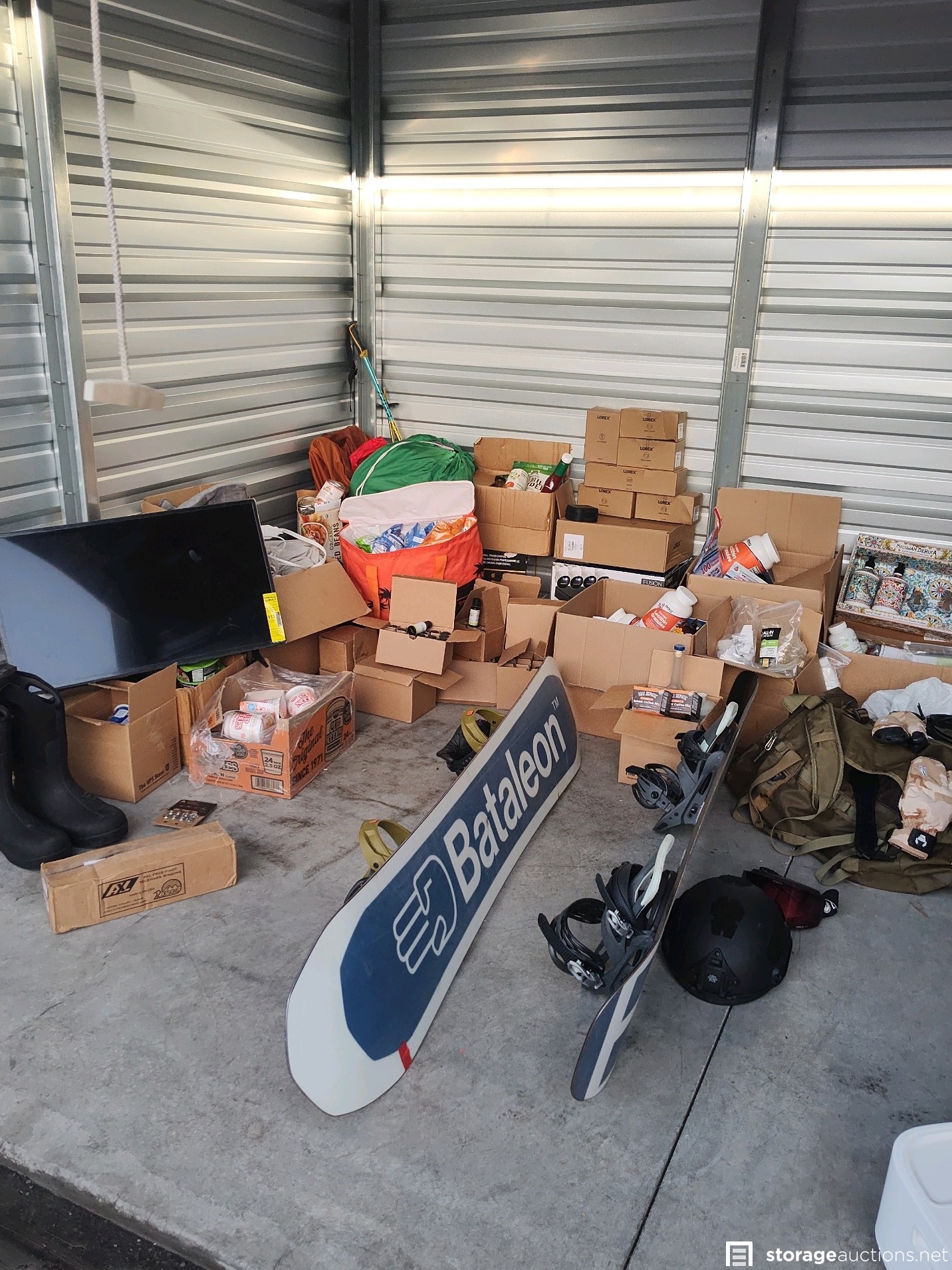 Burton Snowboard W/Bindings, Bataleon Snowboard w/Bindings, AXL-Free Pivot Telemark Bindings LG (new) box has sticker price of $449.96 for Ski's, Ski/Snowboard Goggles, Ski/Snowboard Helmet (Heavy Duty), Foot Bath, Air Mattress, Heating Pads, Boot Warmer's, Ski Outfit's, Ski Poles, TV looks about 19in, Travel Totes, Bags & Backpacks, Ragun Messager, cases of Essential Oils, Vitamins Supplements and Powders, Car Oils, Tow Straps and Bulk Foods (cup of noodles, refried beans, mac and cheese) Hot Tub or Pool Chemicals. Lorex Security Camera System, Lorex Indoor Security camera, STB One Touch HDD Massive Storage for Windows & Mac USB 3.0, other misc. stuff.
