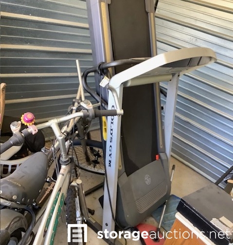 GOLD'S GYM TREADMILL, 3 ADULT BIKES, 1 CHILD BIKE, WATER DISPENSERS, VARIOUS HAND TOOLS, LAMP STAND, LEAF BLOWER, BIKE HELMETS, MISC. PAINT TOOLS, BOW AND ARROW TARGET, QUEEN MATTRESS SET