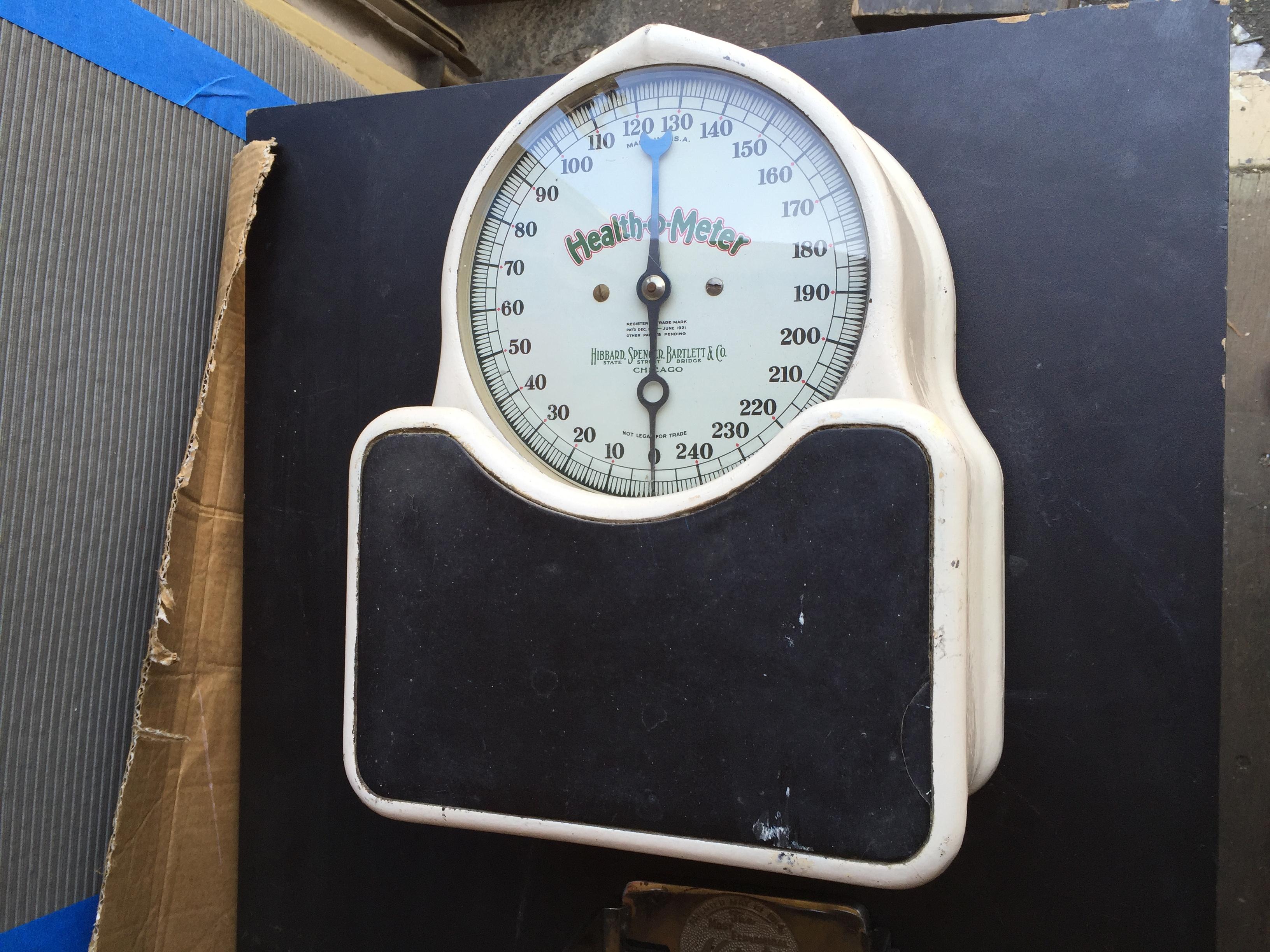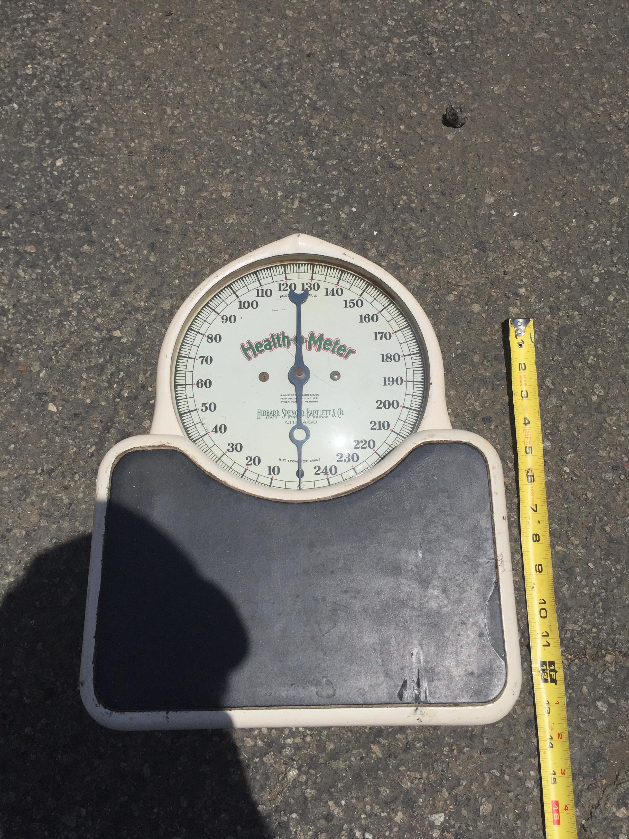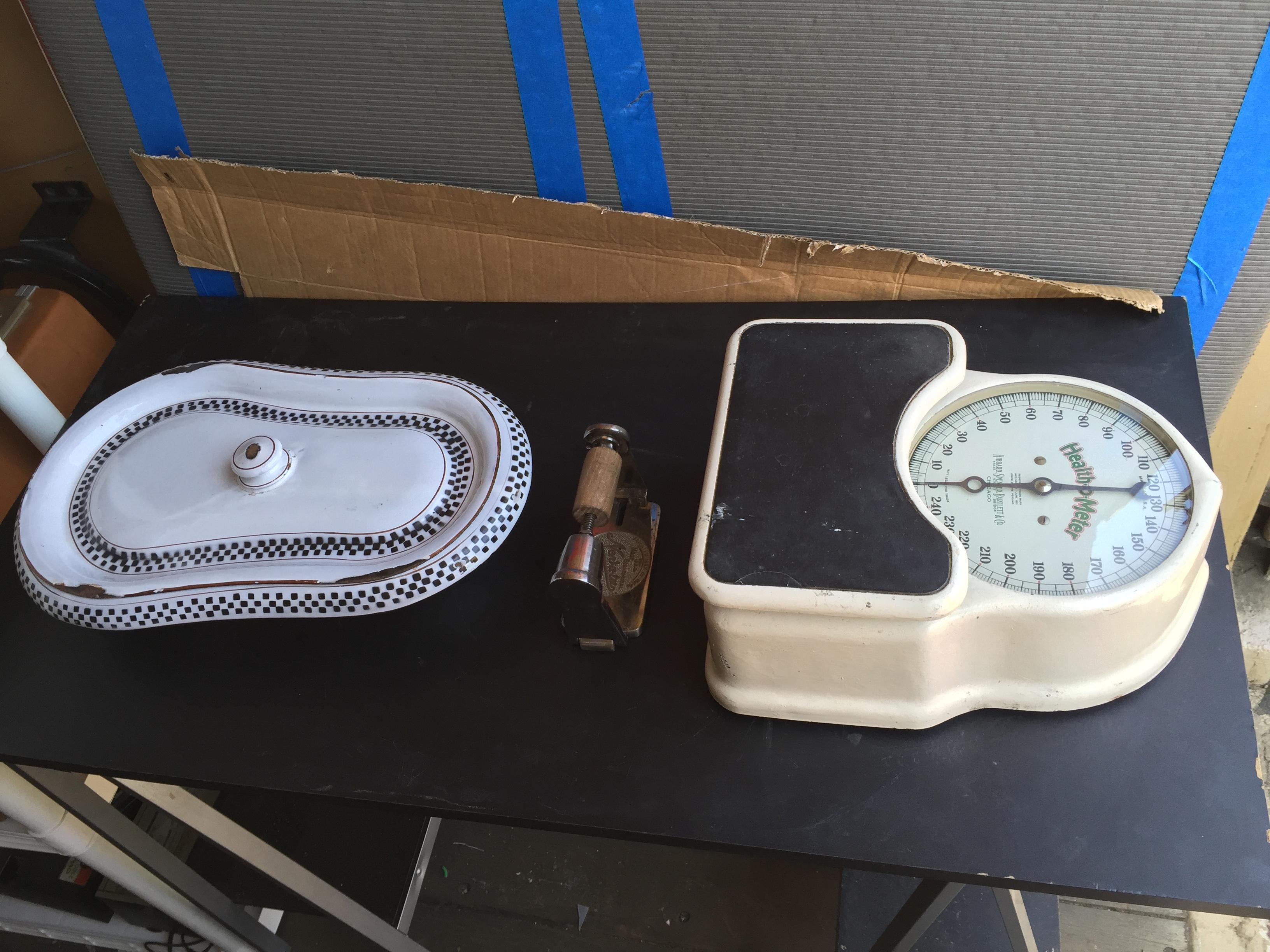 Mary's Finds Antique Porcelain painted bath tub used by brothels, an vintage Hubbard, Spencer, Bartlett & Co Scale and tool made by Atlas Company.