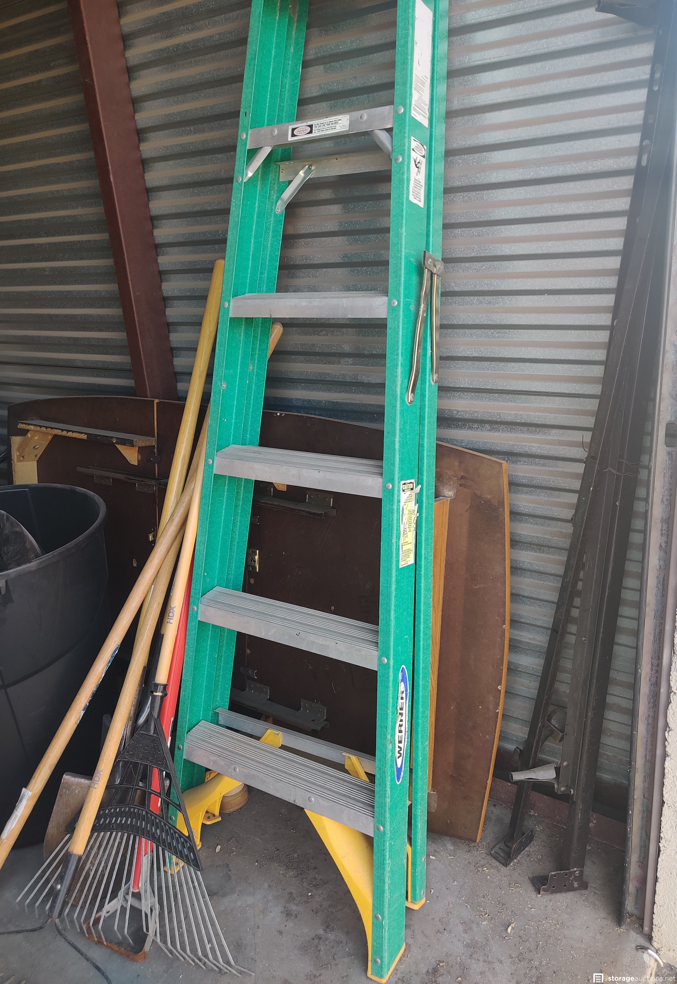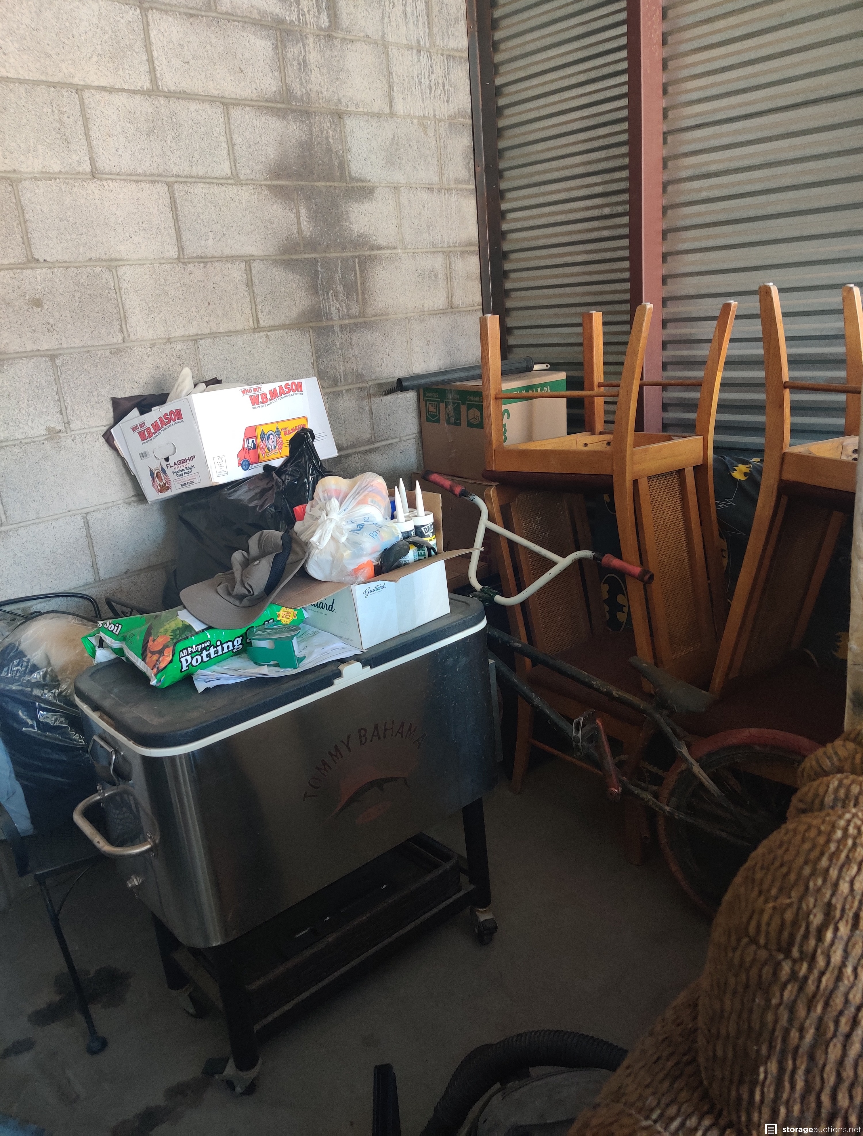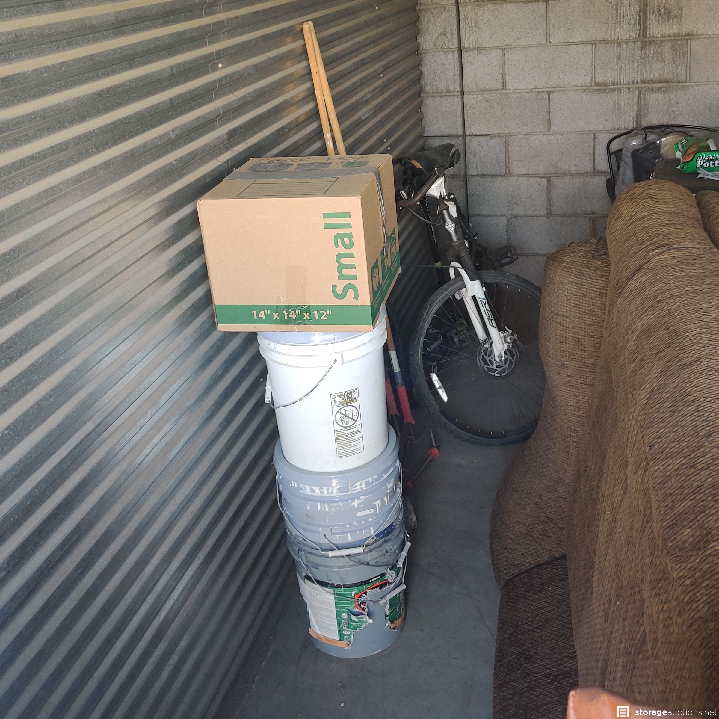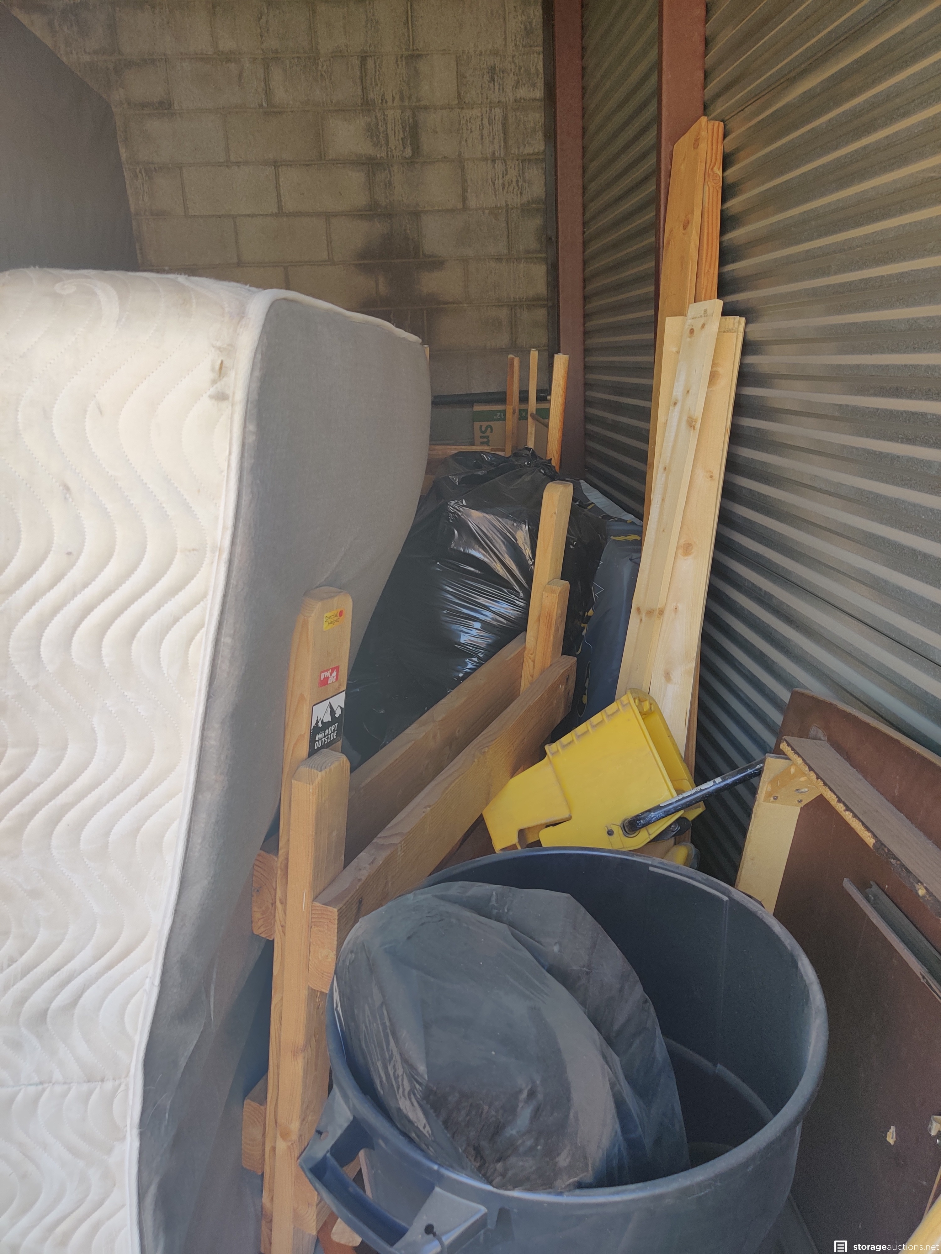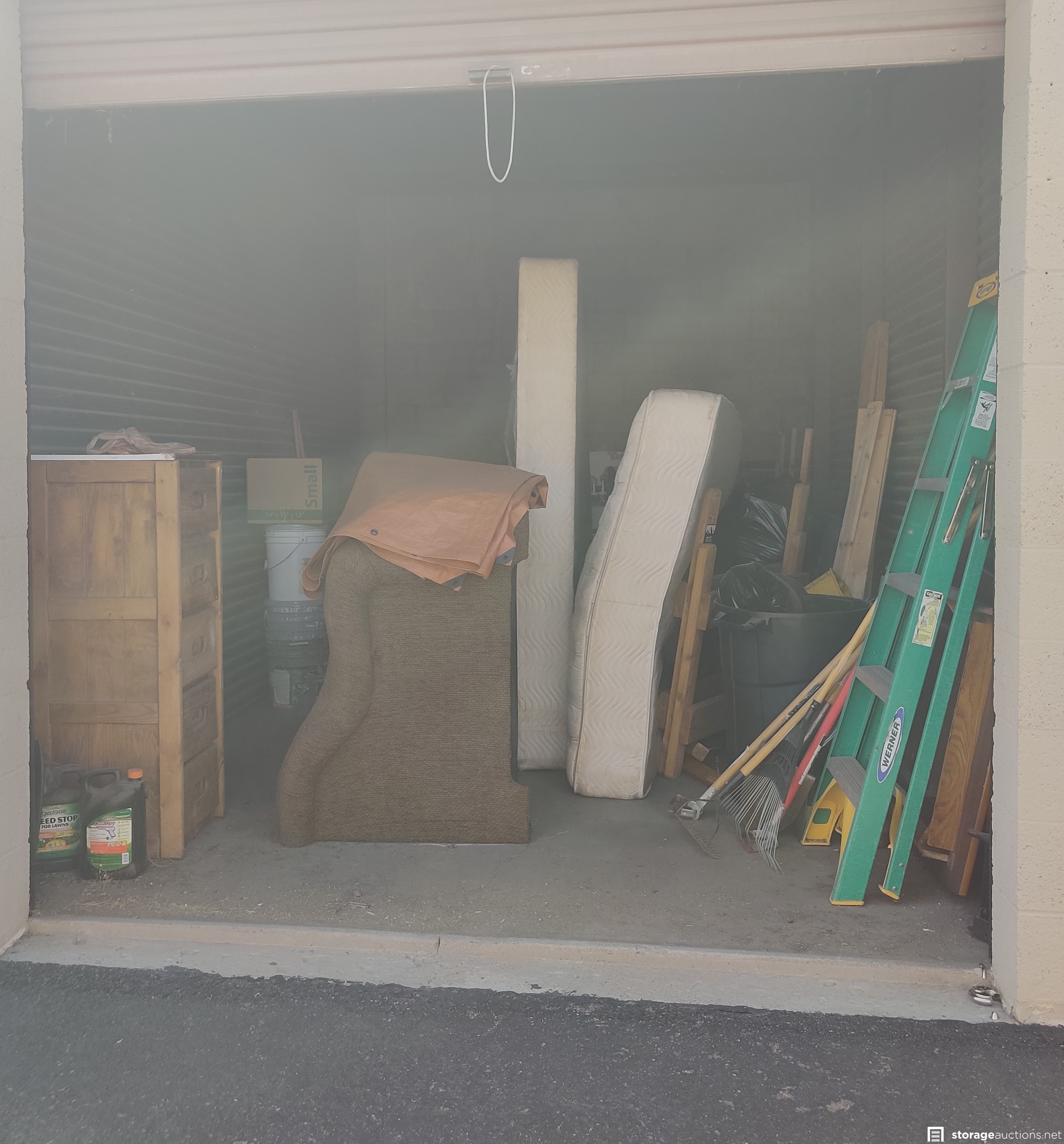 unit appears to contain ; sofa, boxes, bags , bed mattress, ladder, cabinets, bike, paint buckets, chairs