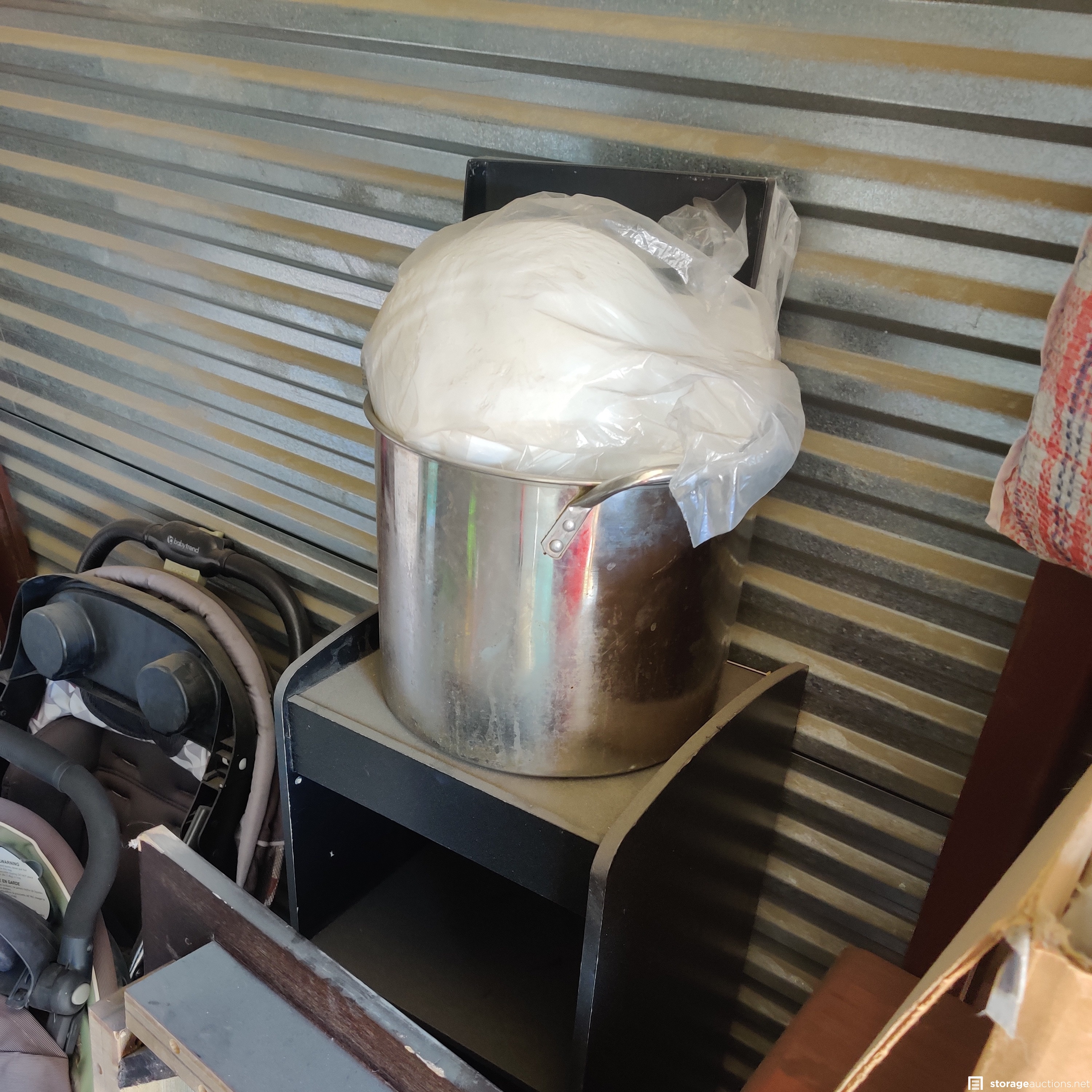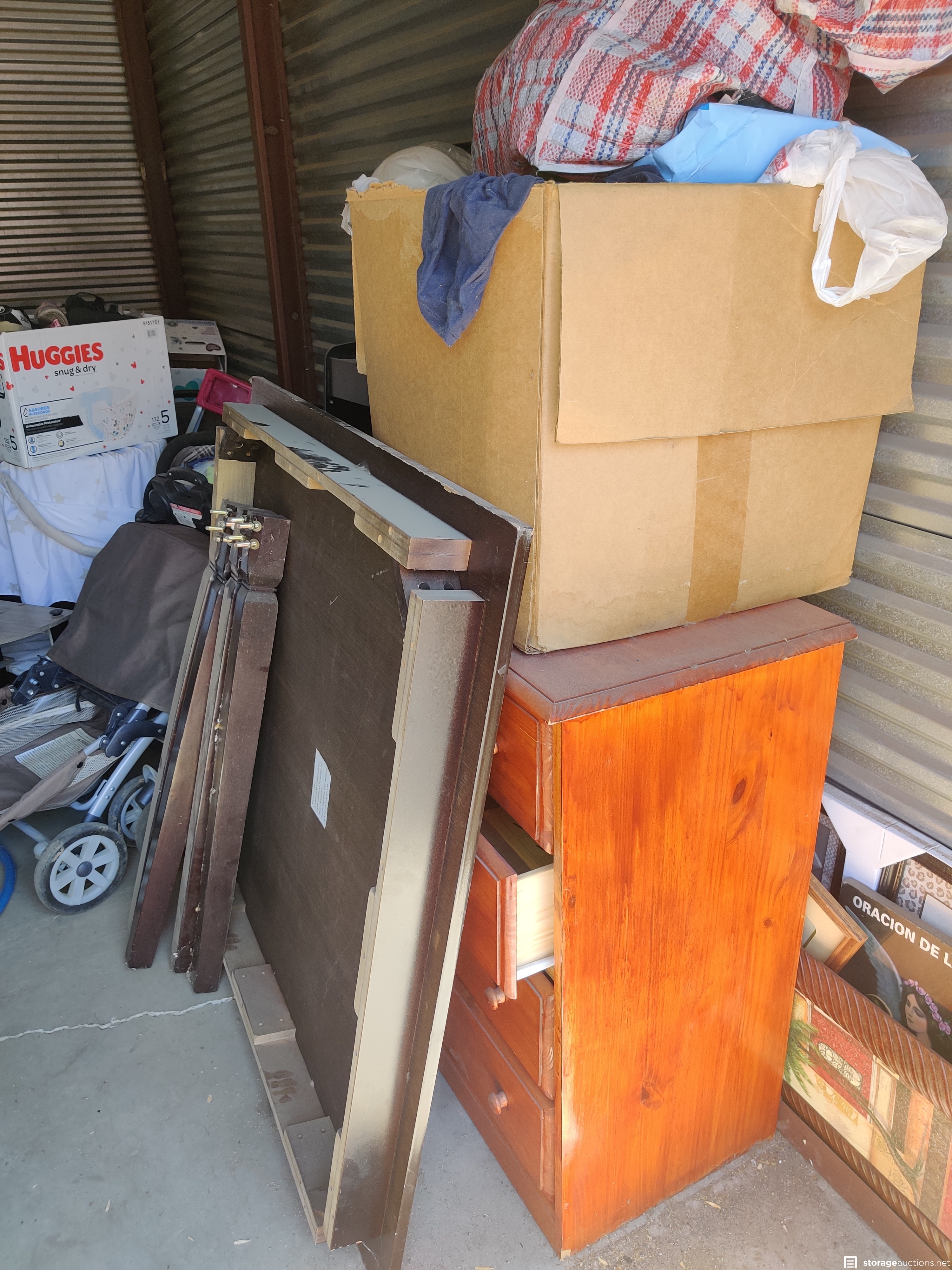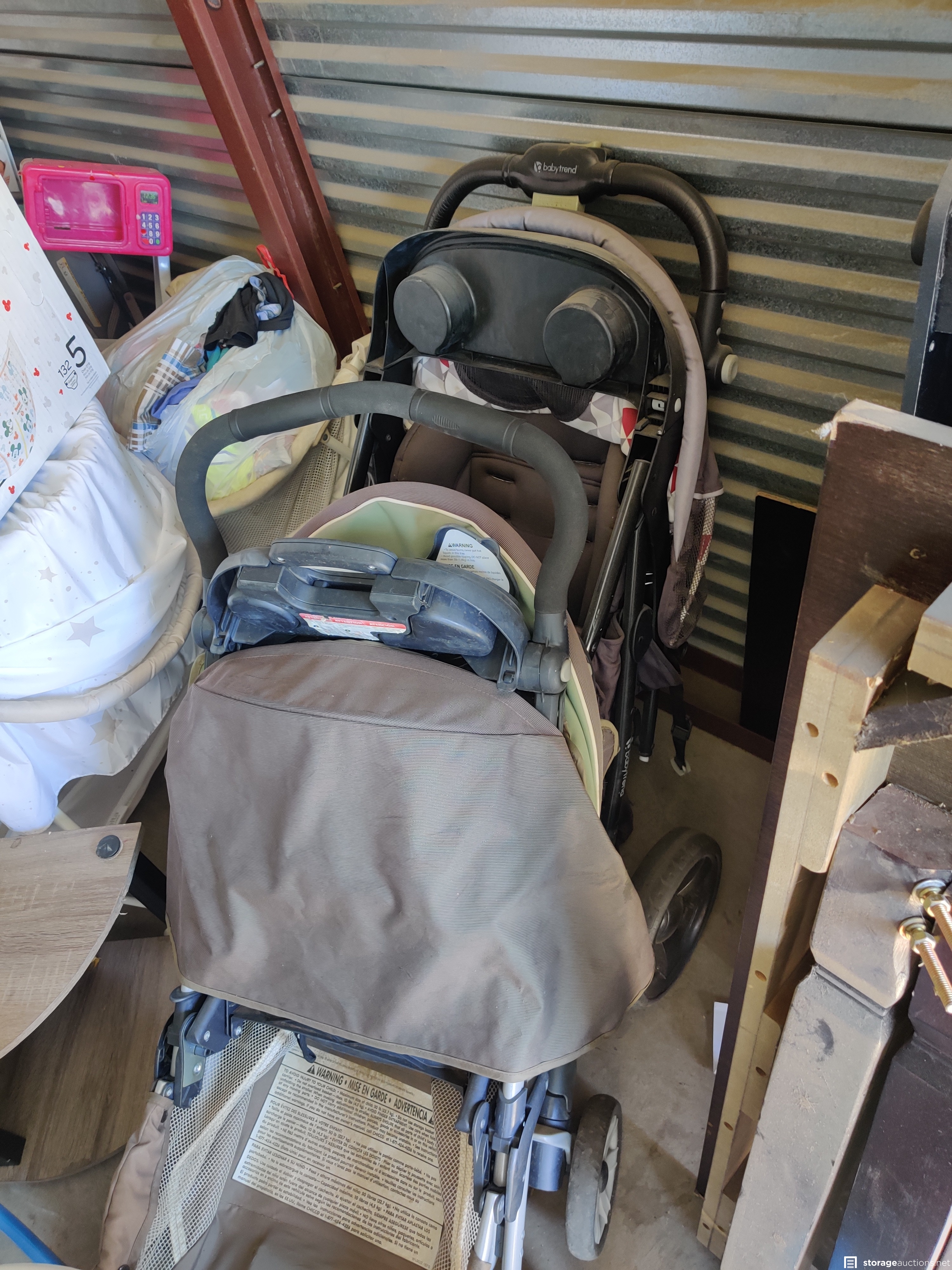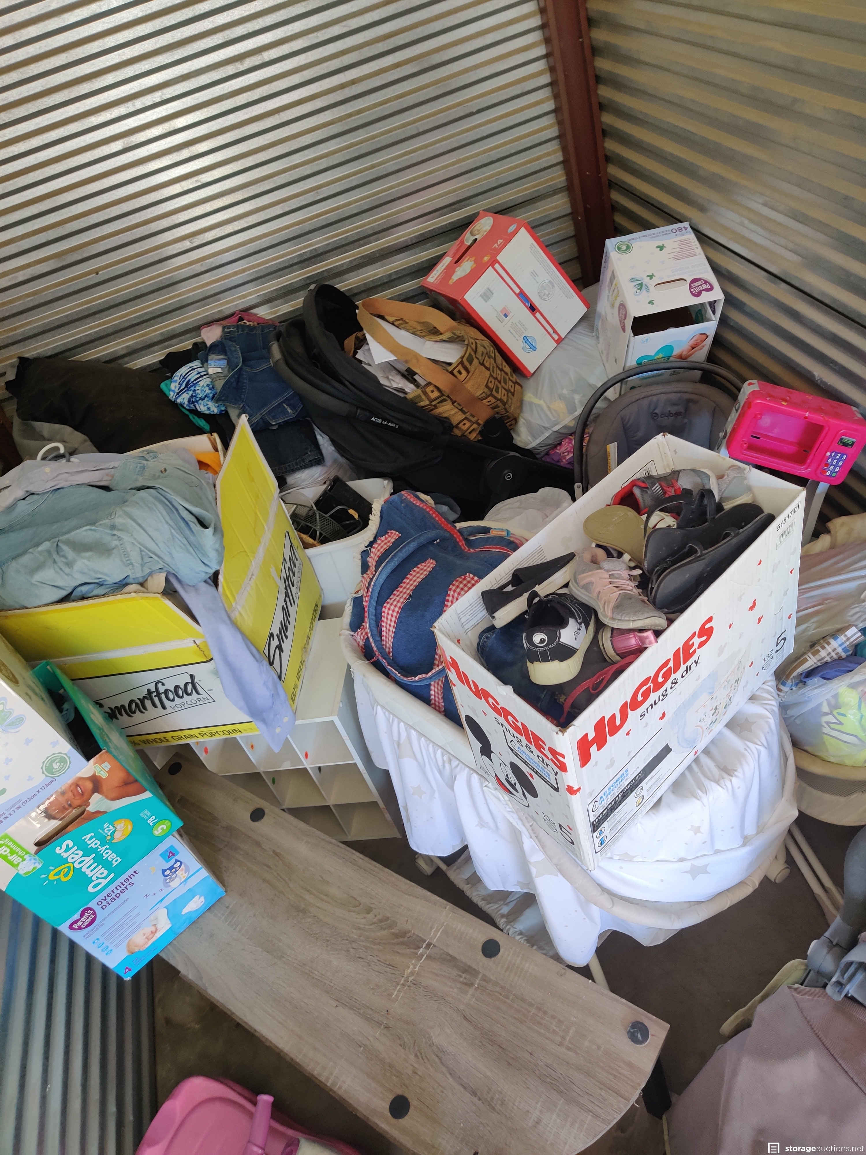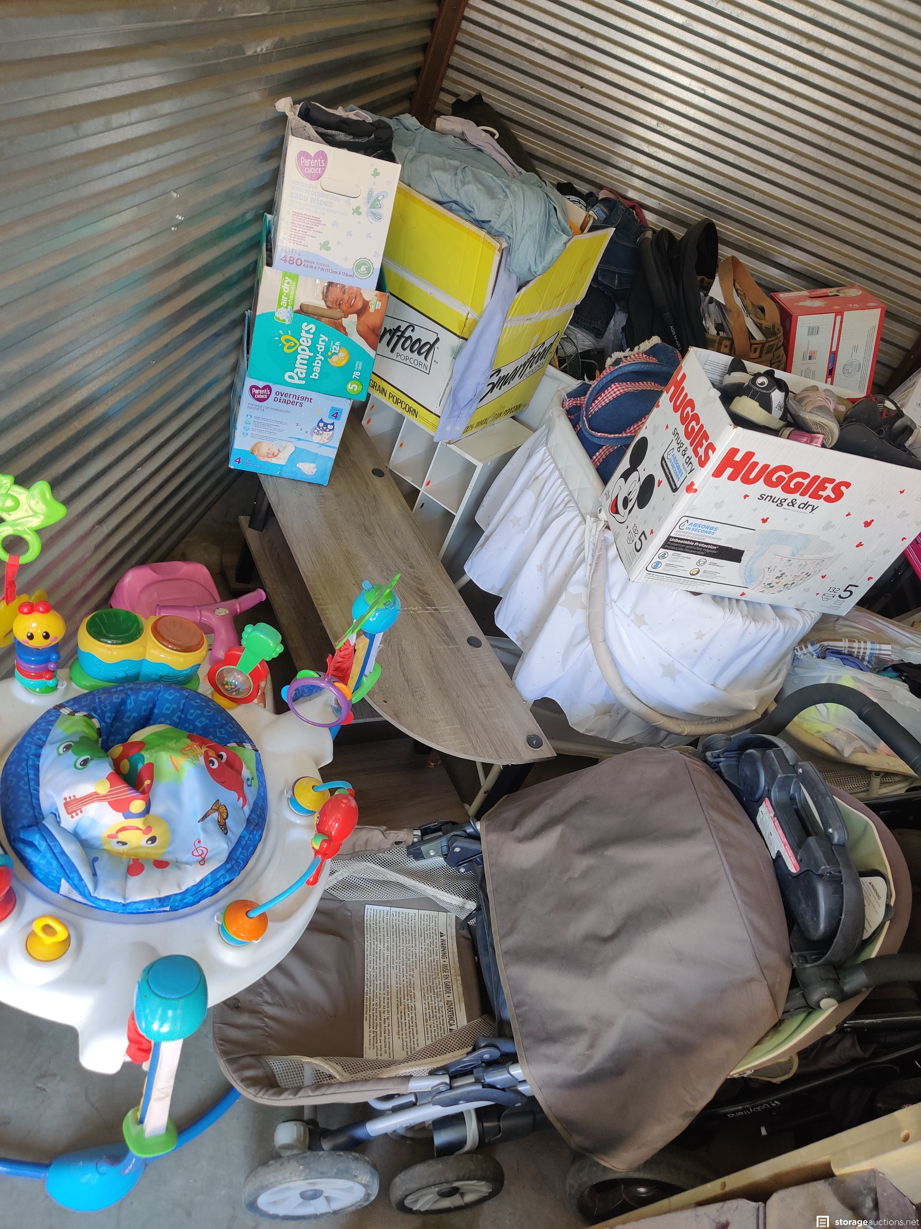 unit appears to contain; baby strollers, boxes, clothes, shoes, bags, tv stand, shelf organizer, wall decor, cabinet, cook pots, baby car seat, electric vacuum, electric mop, computer desk, baby clothes.