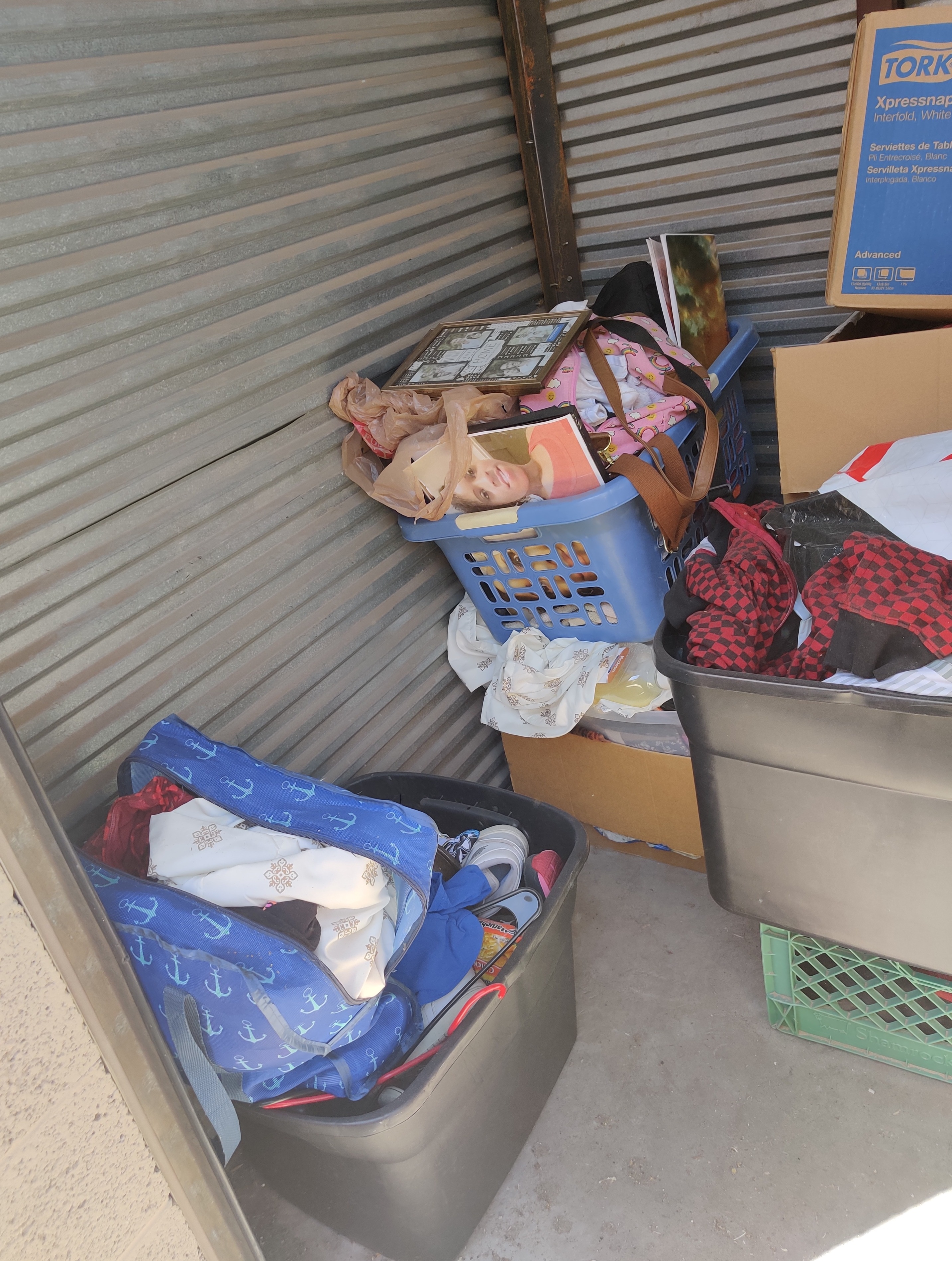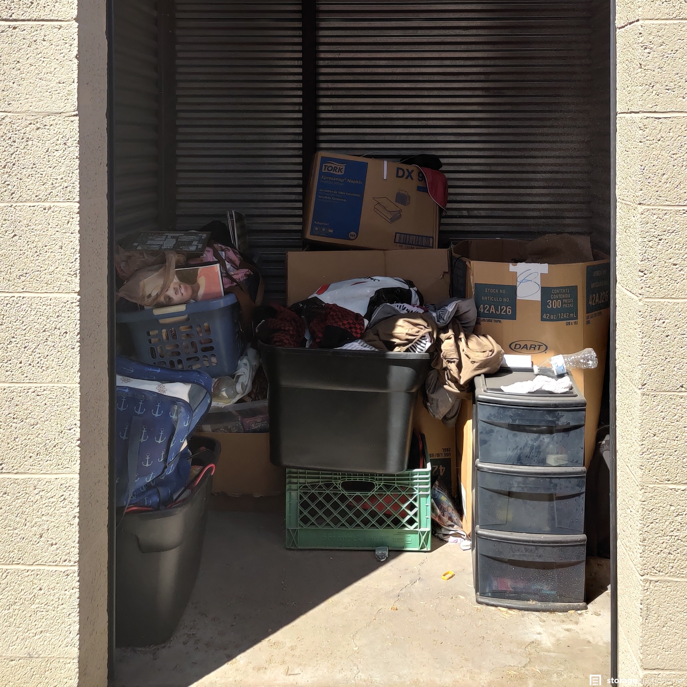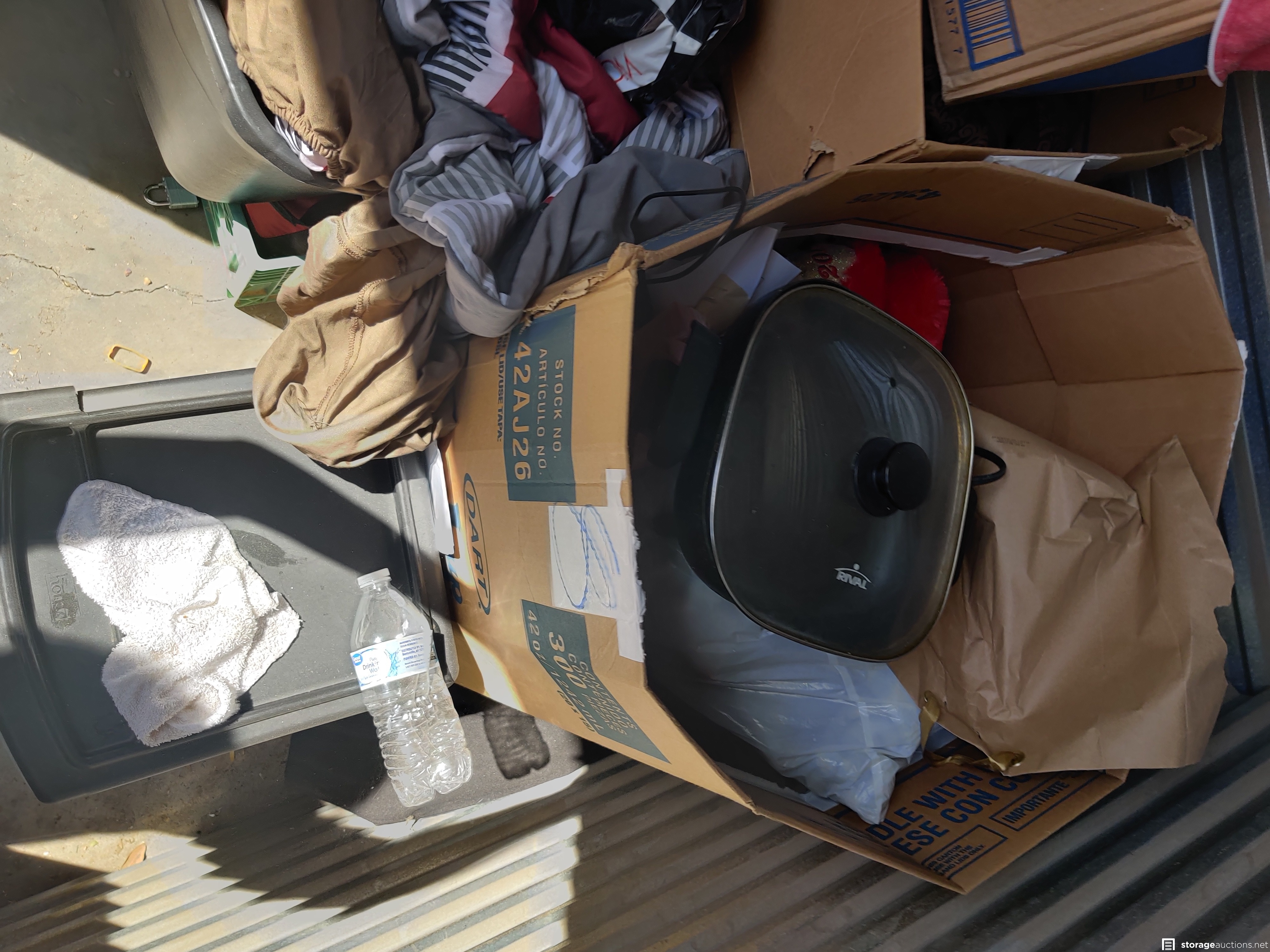 unit appears to contains; boxes, totes, clothes, bags, cook dishes