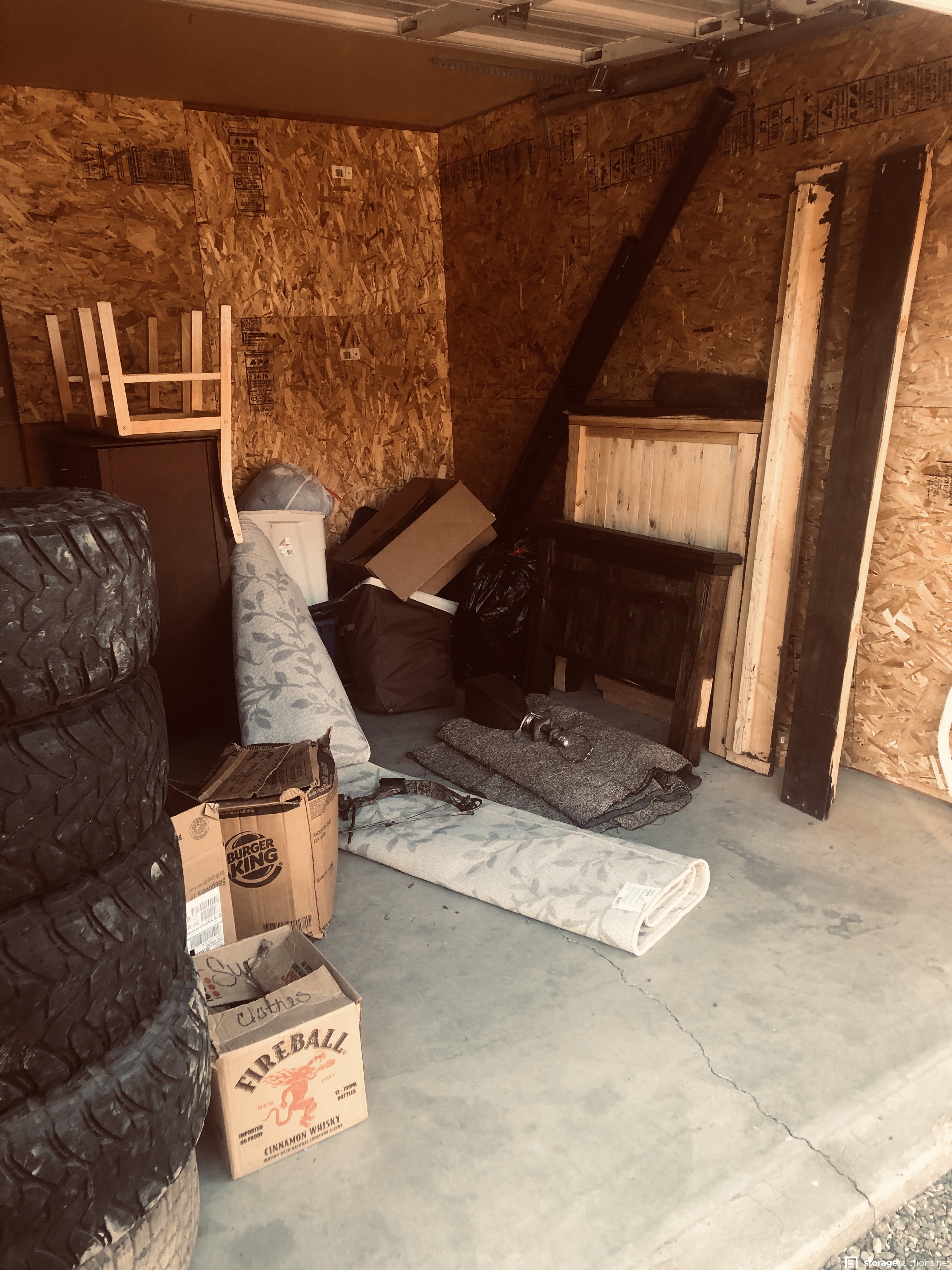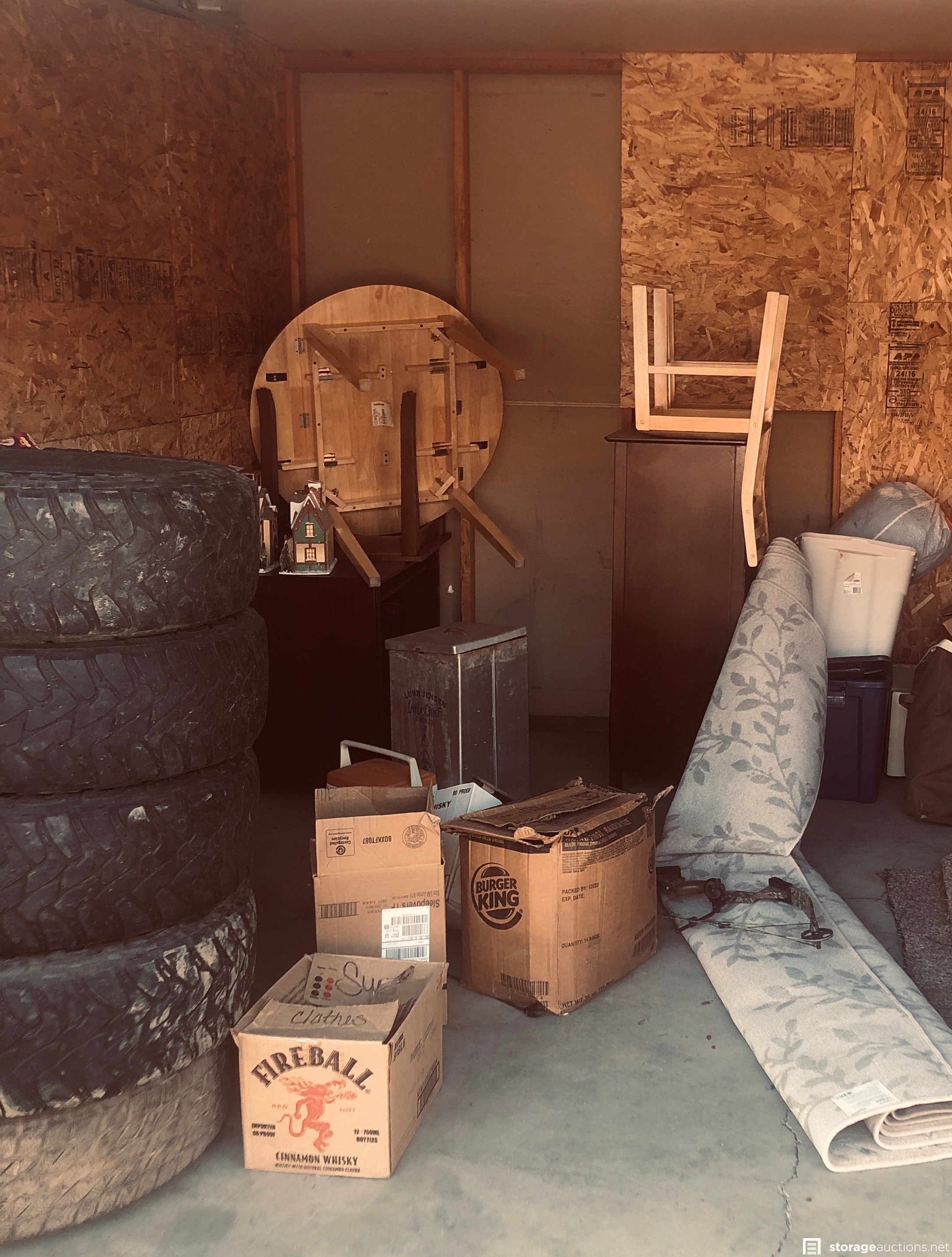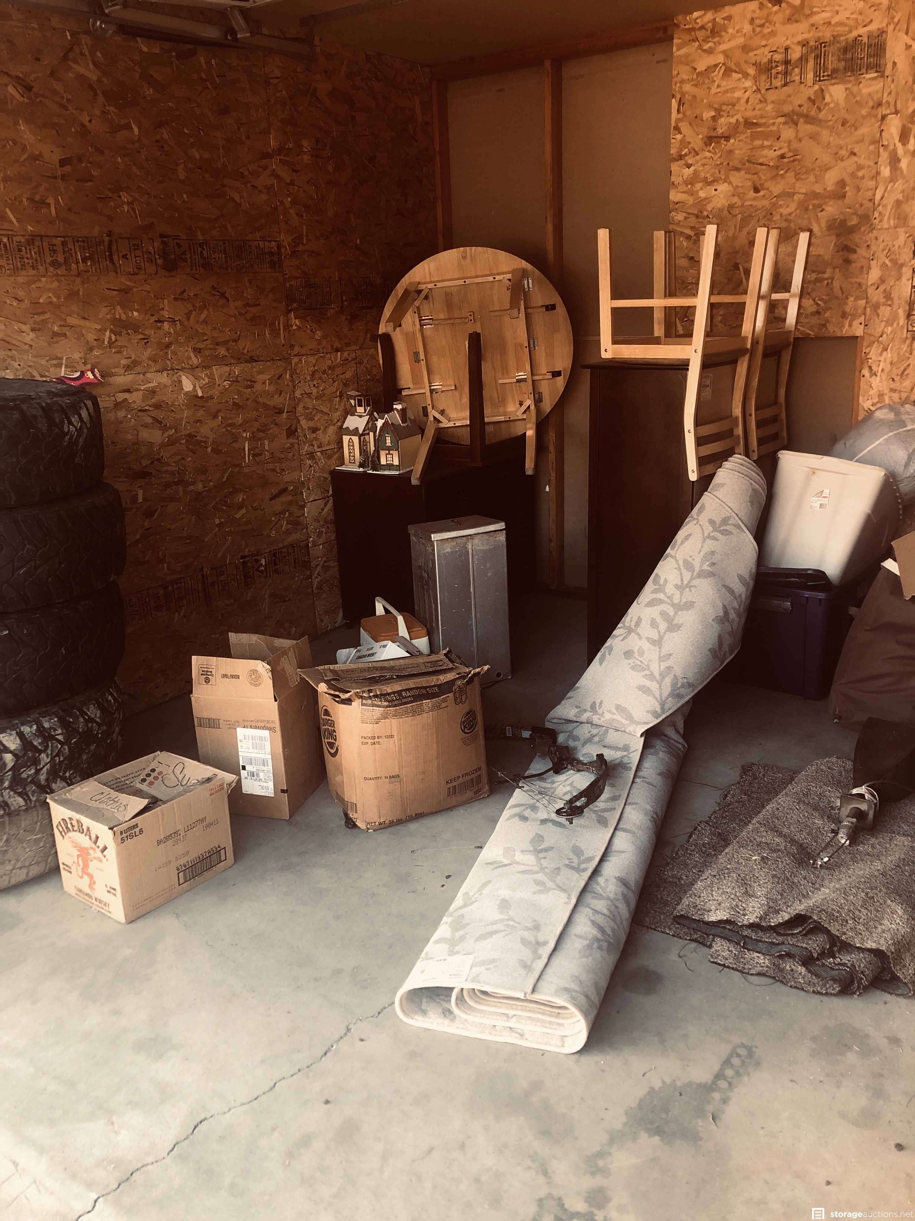 This unit has been inventoried from the entrance. Items that can be visibly seen, but not guaranteed include the following: tires, large floor rug, table and two chairs, dresser, DVD's bow, light fixture, bed headboard and rails, miscellaneous boxes and bags..