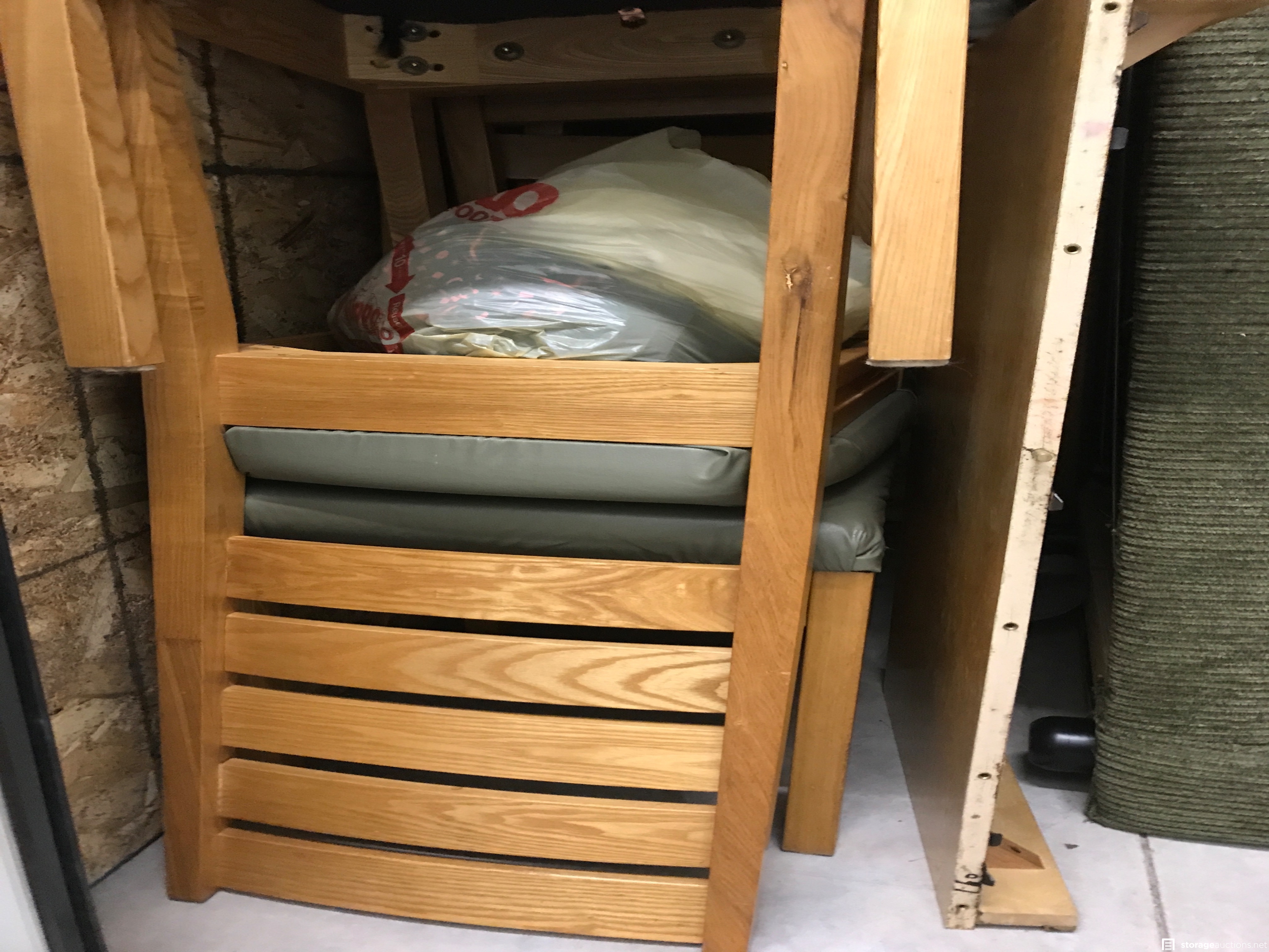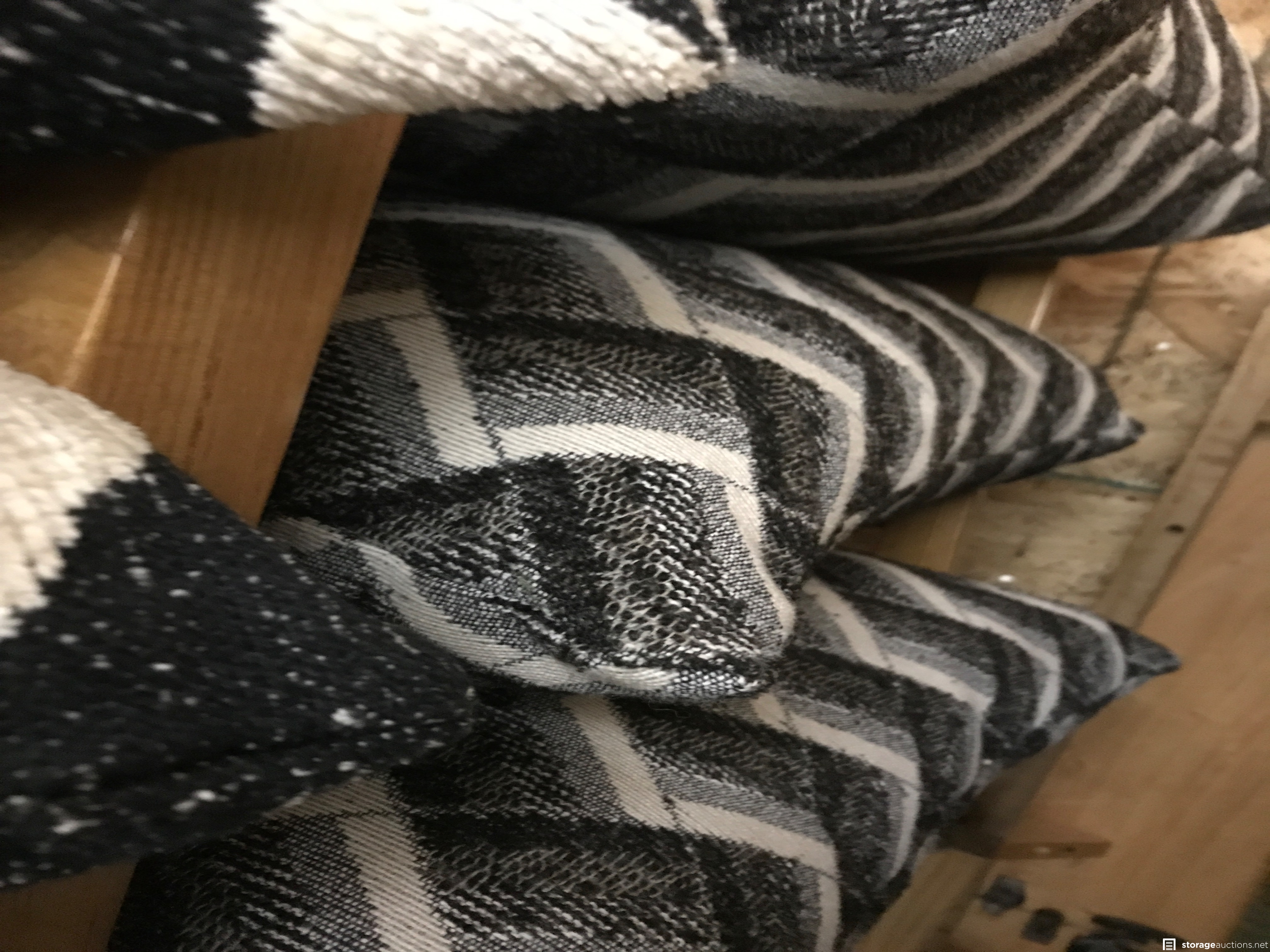 This unit appears to contain a wood Dining table, 6 cushioned dining chairs, pull-out couch, space heater, black and white throw pillows, clothing.