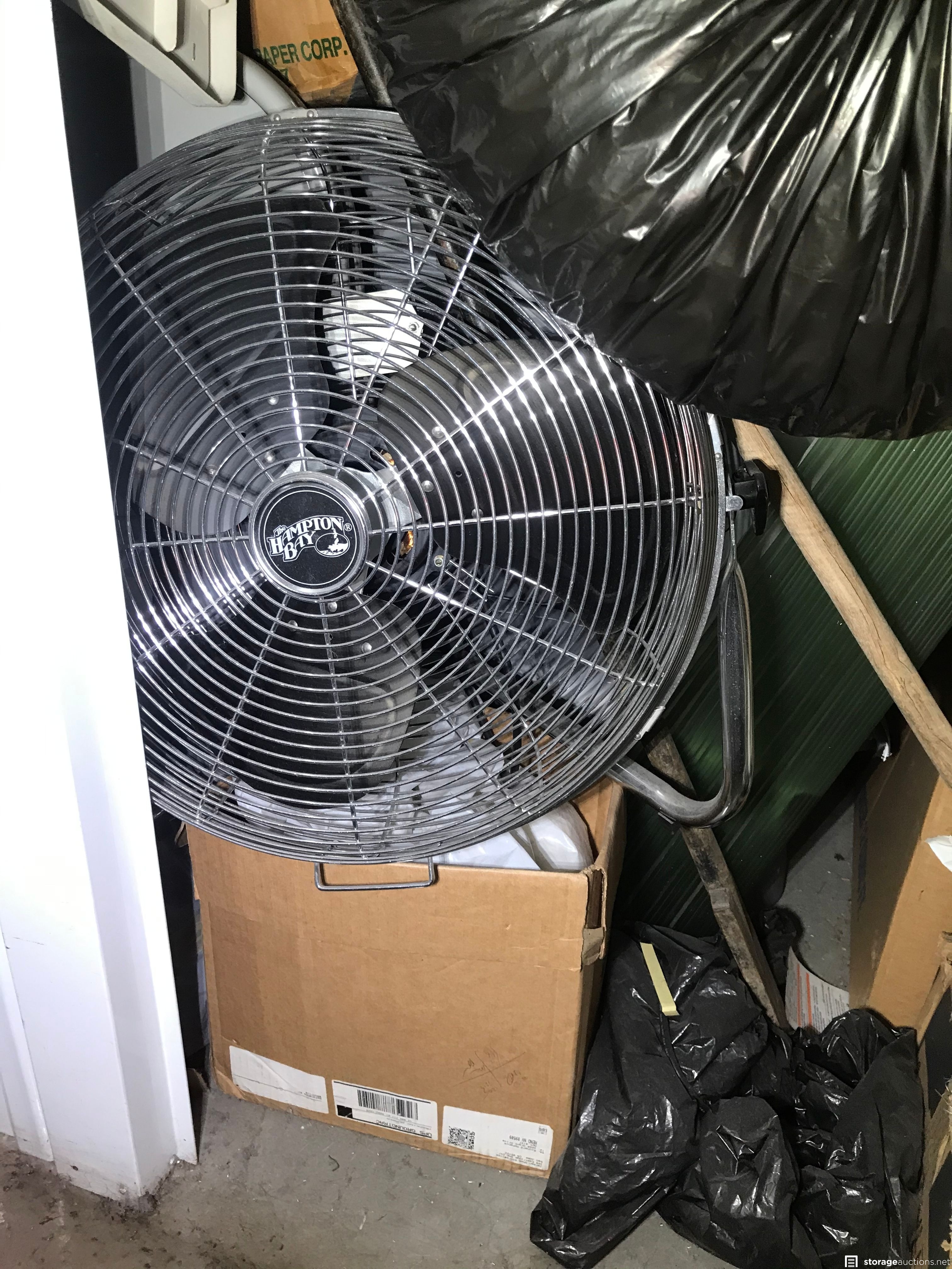 fan, misc totes, bags, boxes, garden tools, animal trap