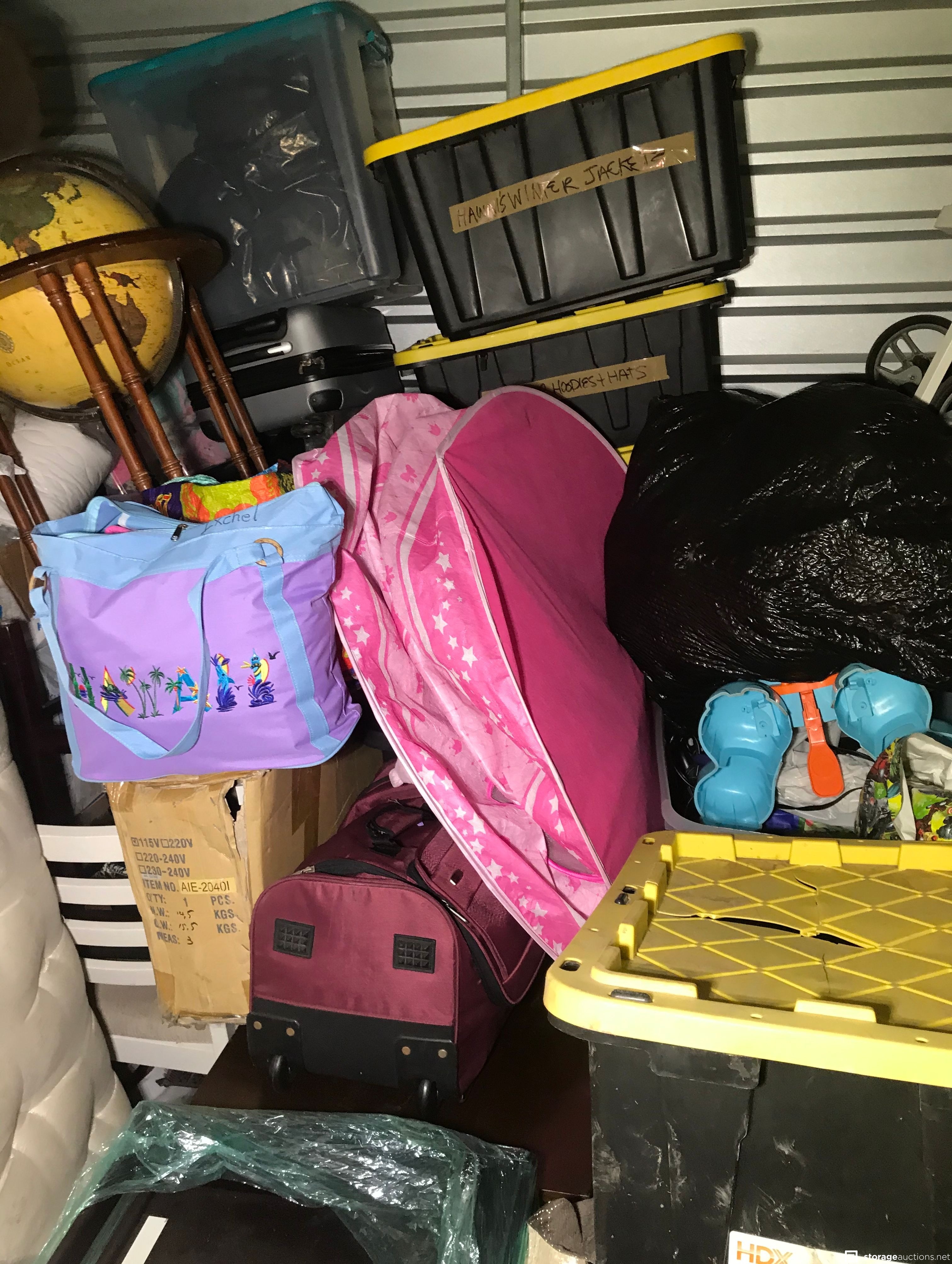 suit cases, mattress, changing table, fan, kids toy, crib