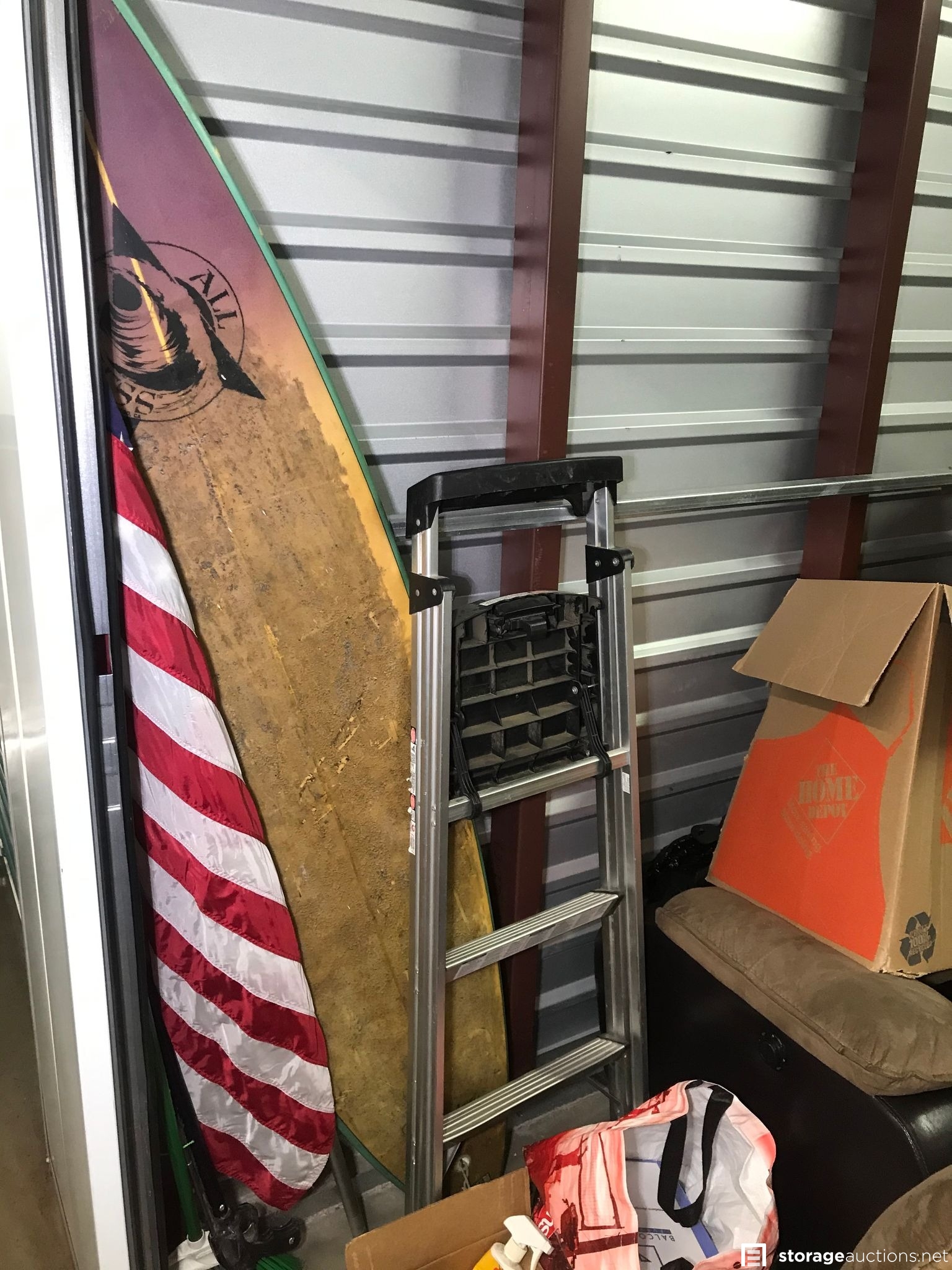 mini fridge, ladder, surfboard, snow boots, washer/dryer, office chair, lights fishing nets