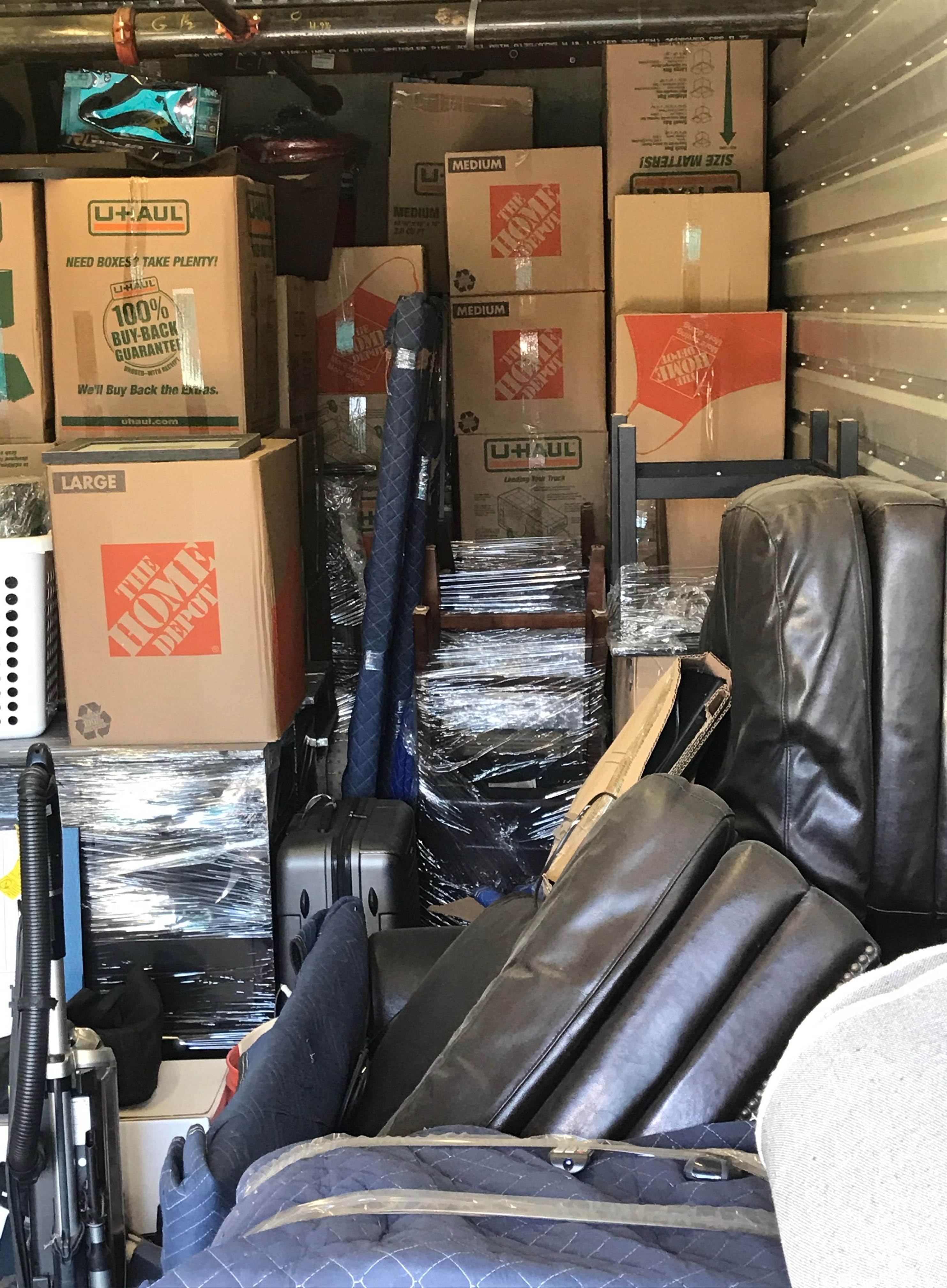 counter top, misc boxes and totes, couch, camping gear, easy up, tent, table