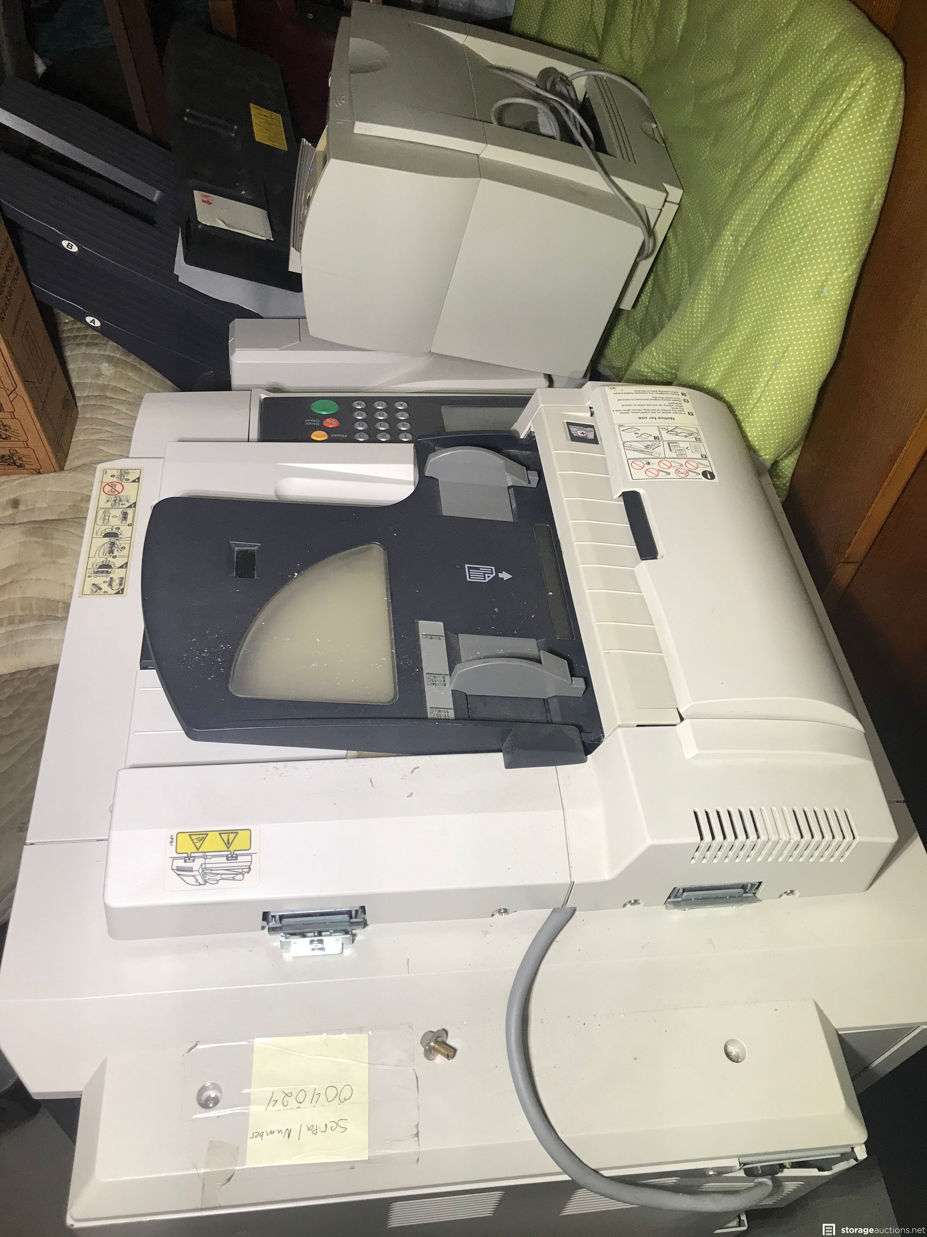 office printer, home printer, hutch, dresser, misc boxes and totes, table, chairs, rugs