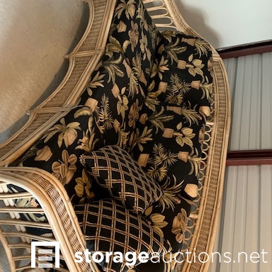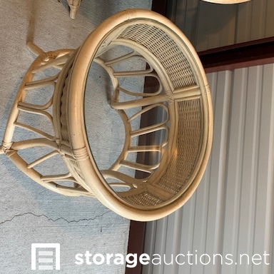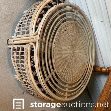 Dinning table and wickers furniture including a sofa, chair, side table and coffee table that has four stools that fit under it.