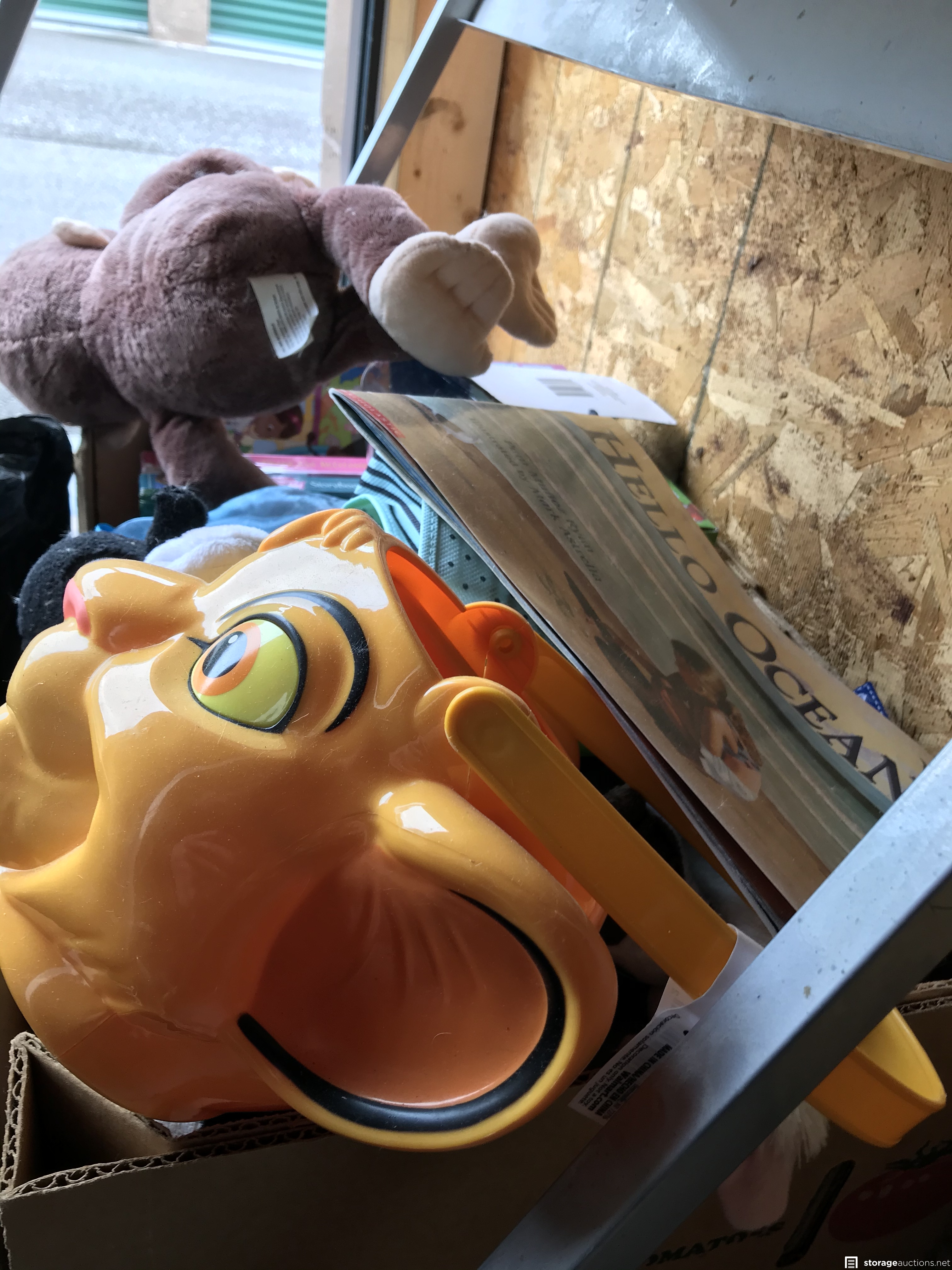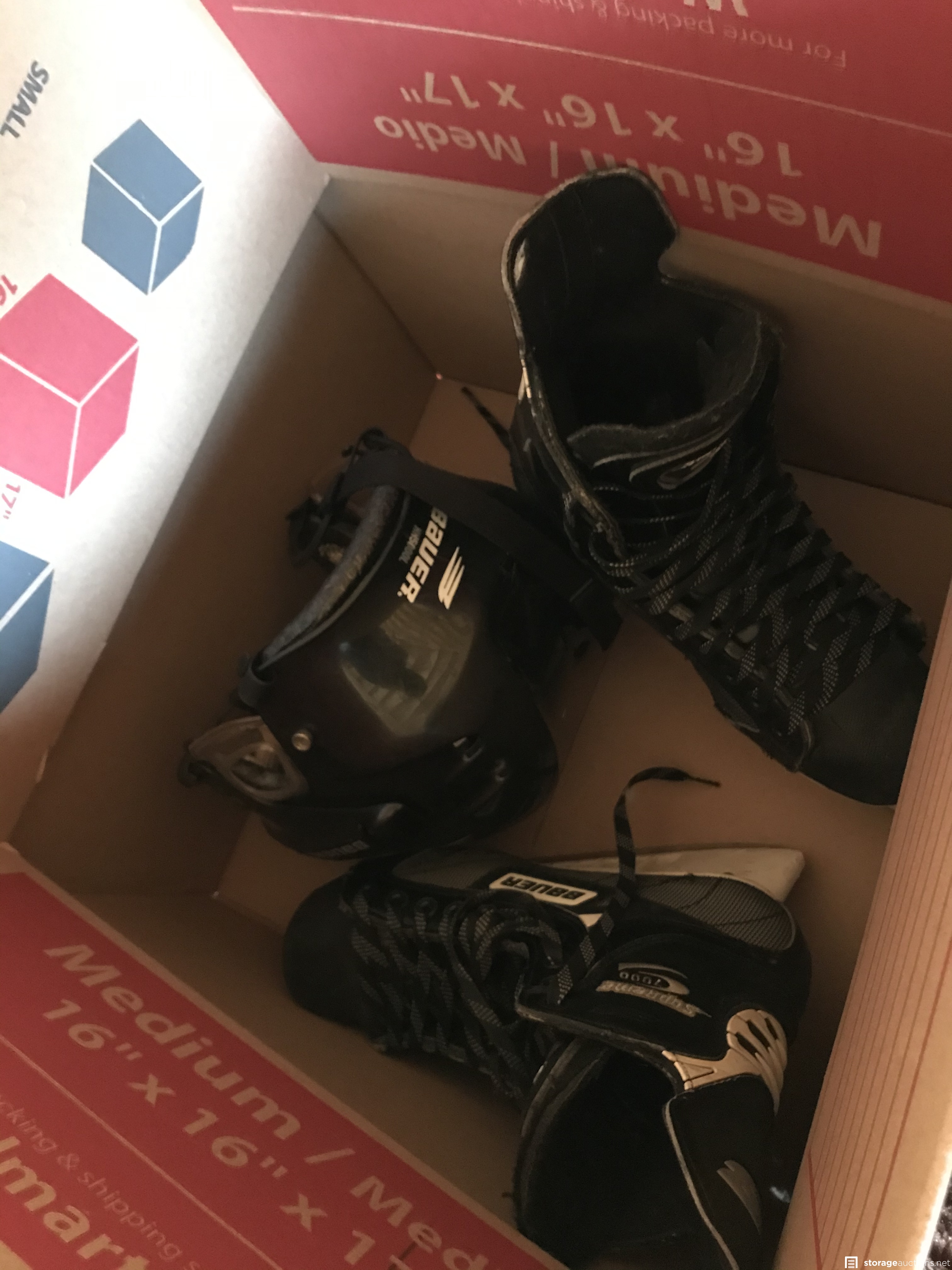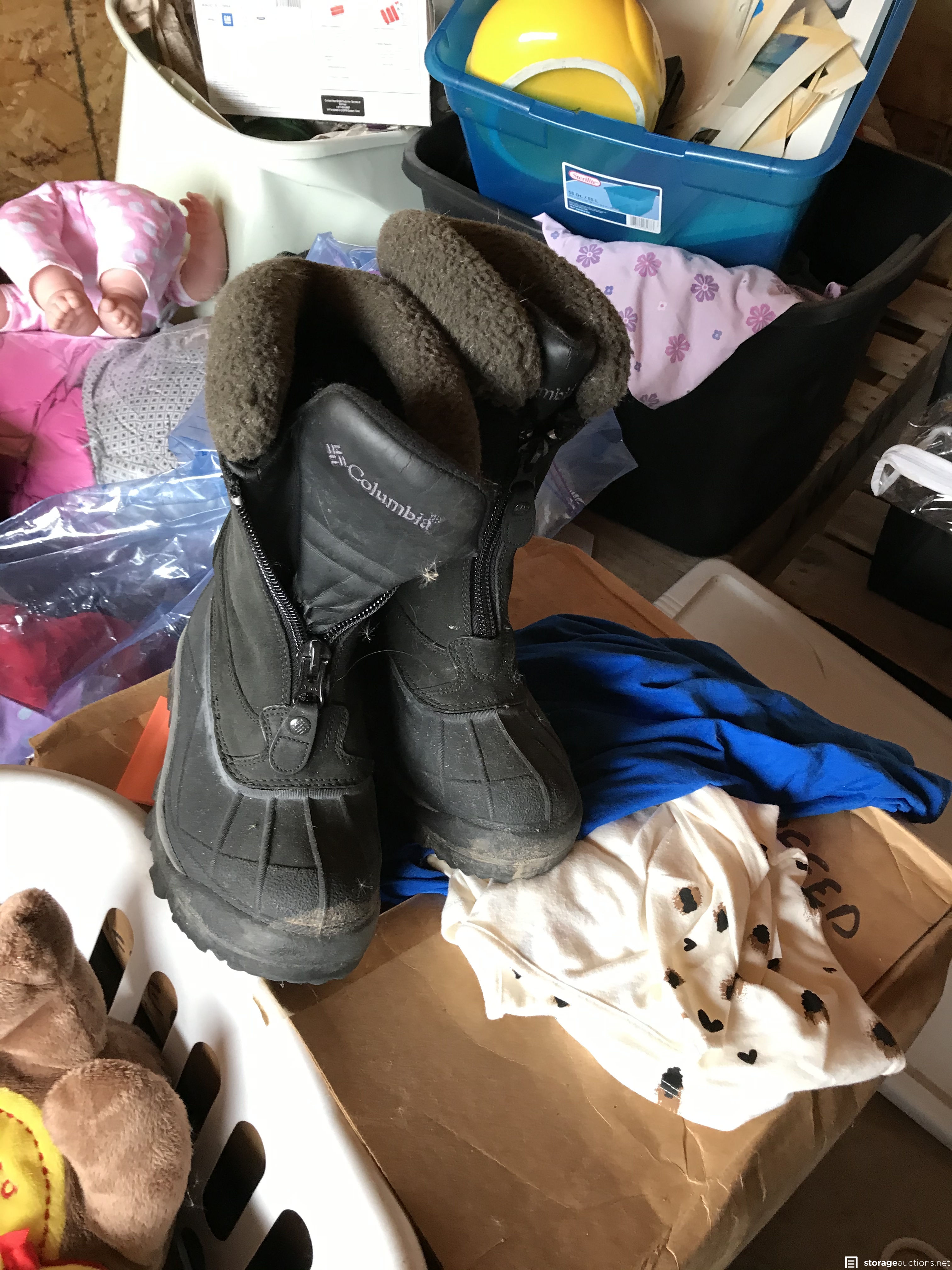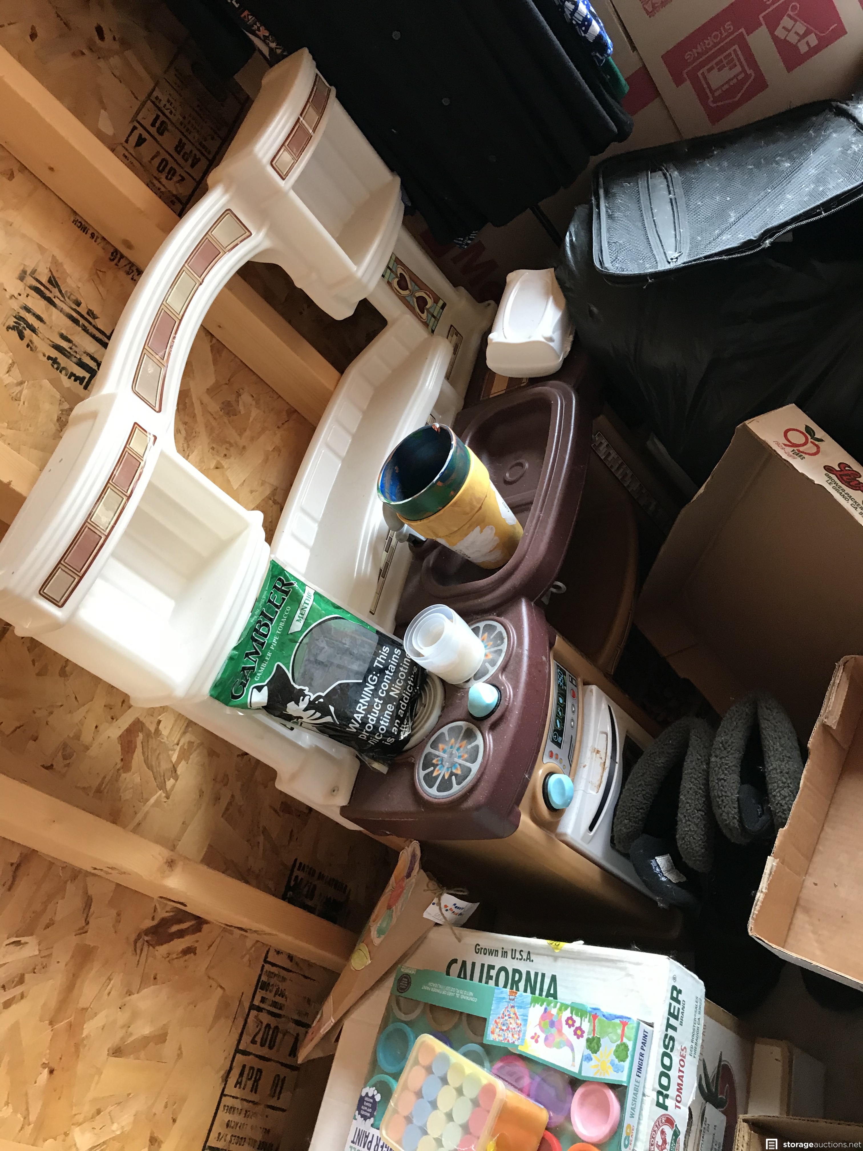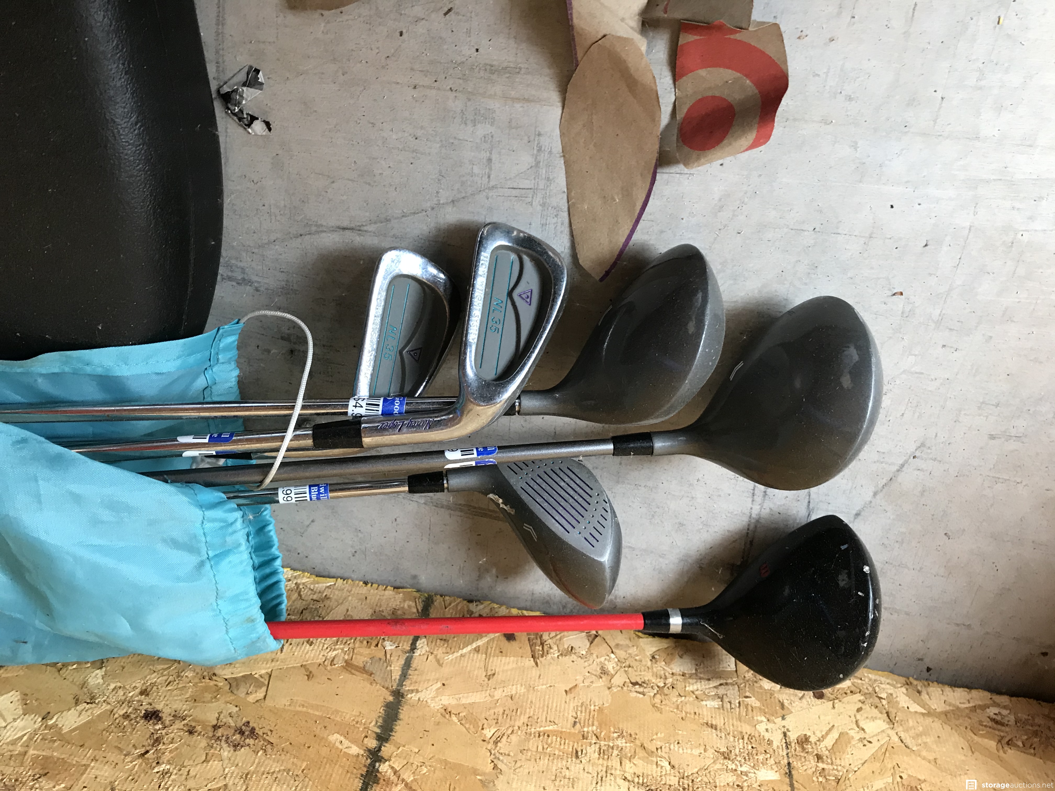 This unit appears to contain Bauer hockey skates, golf clubs, Columbia boots, small rolling desk, clothes hanger, clothing, games, crafting items, toy kitchen
