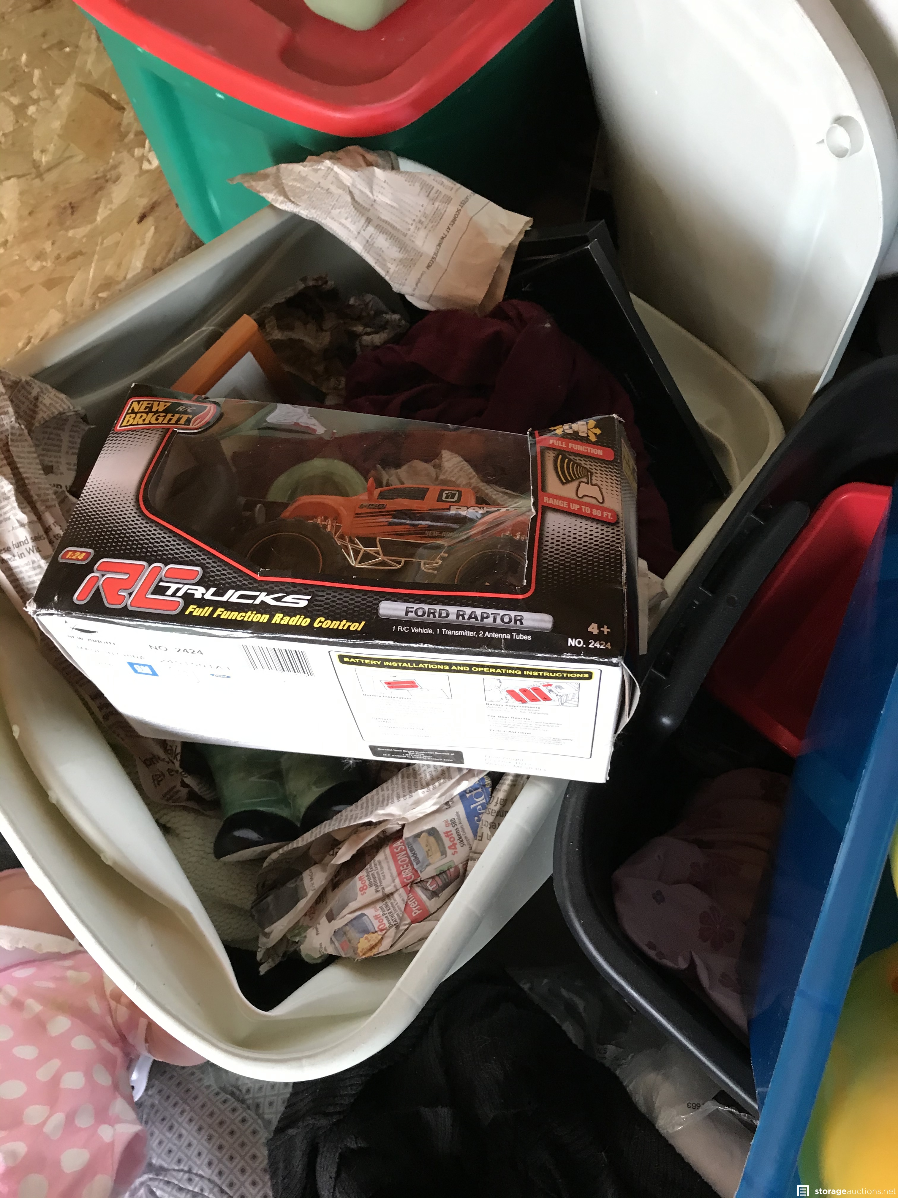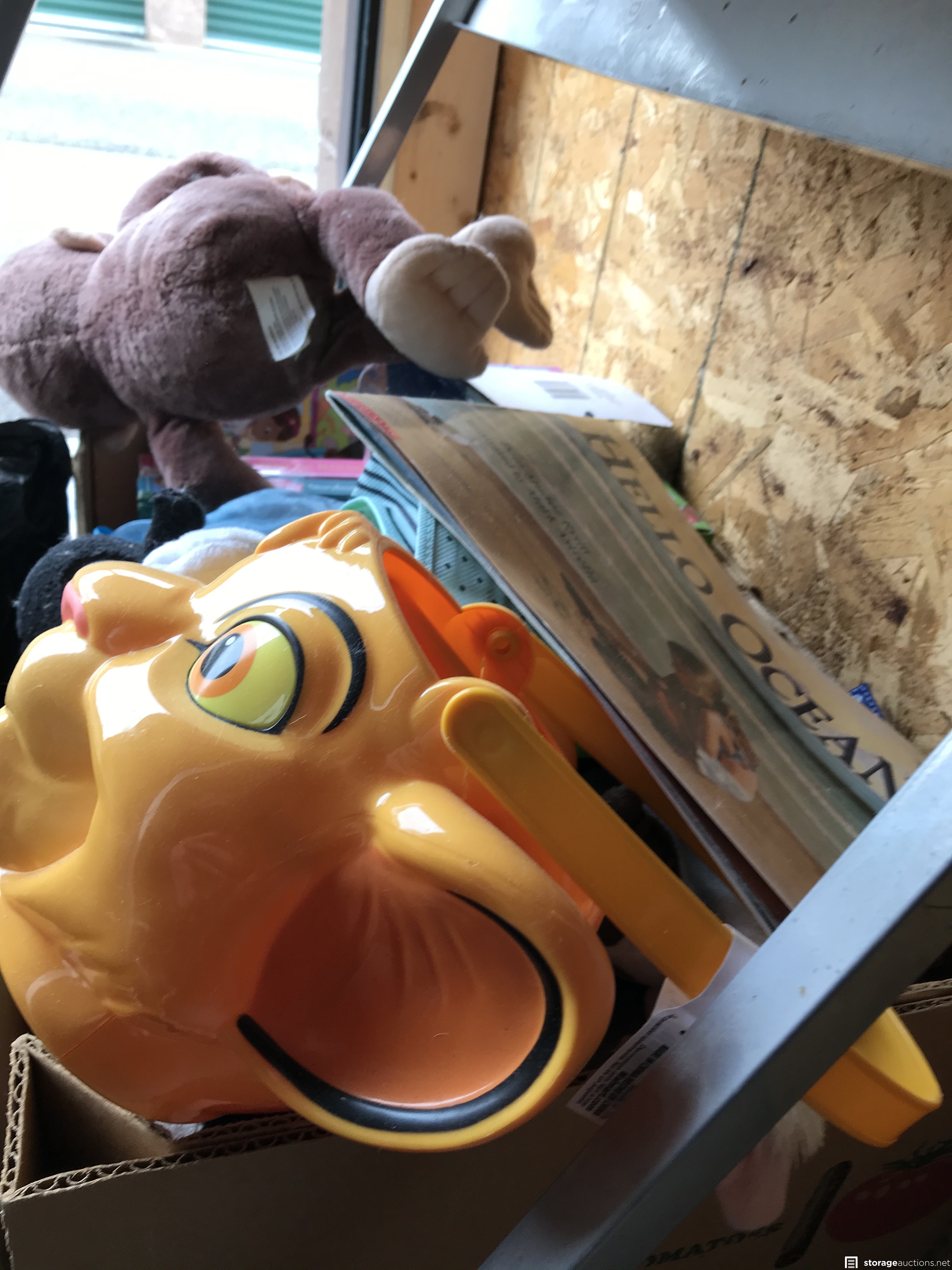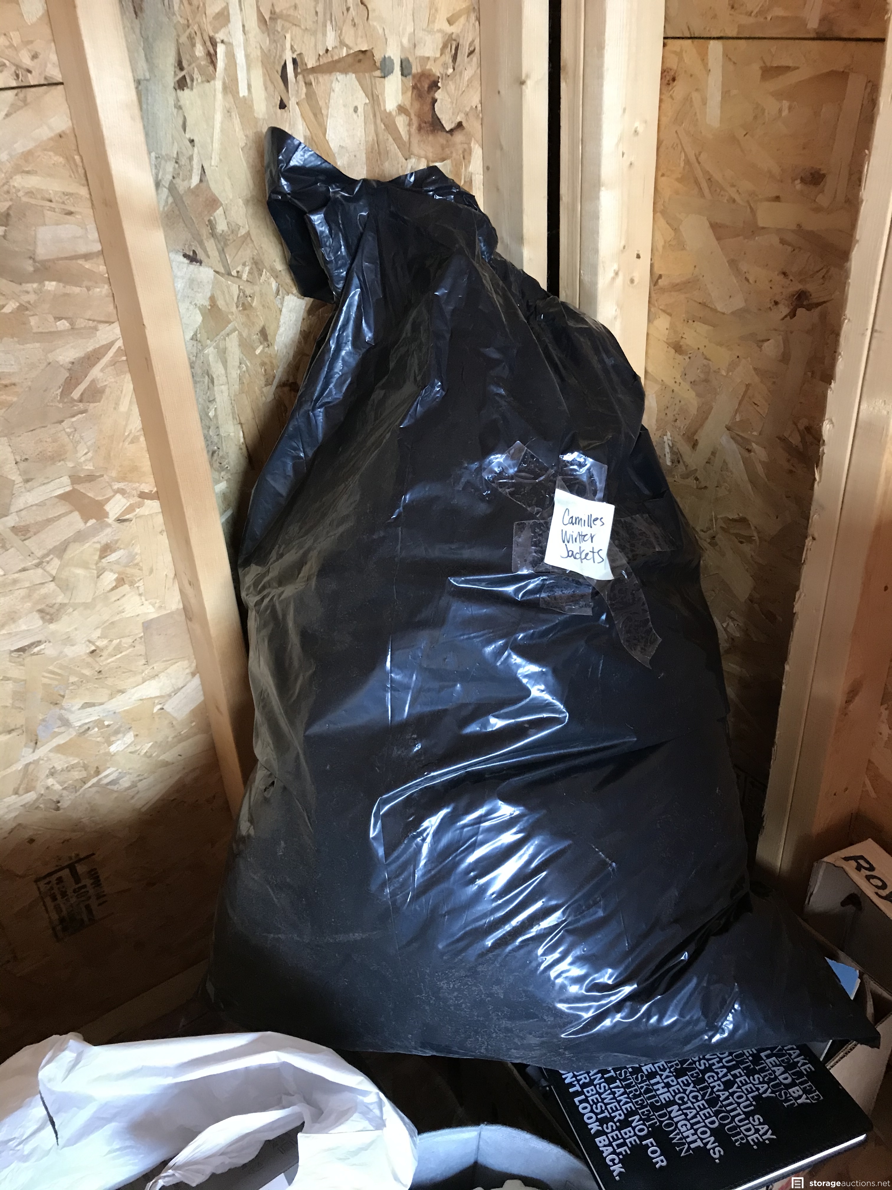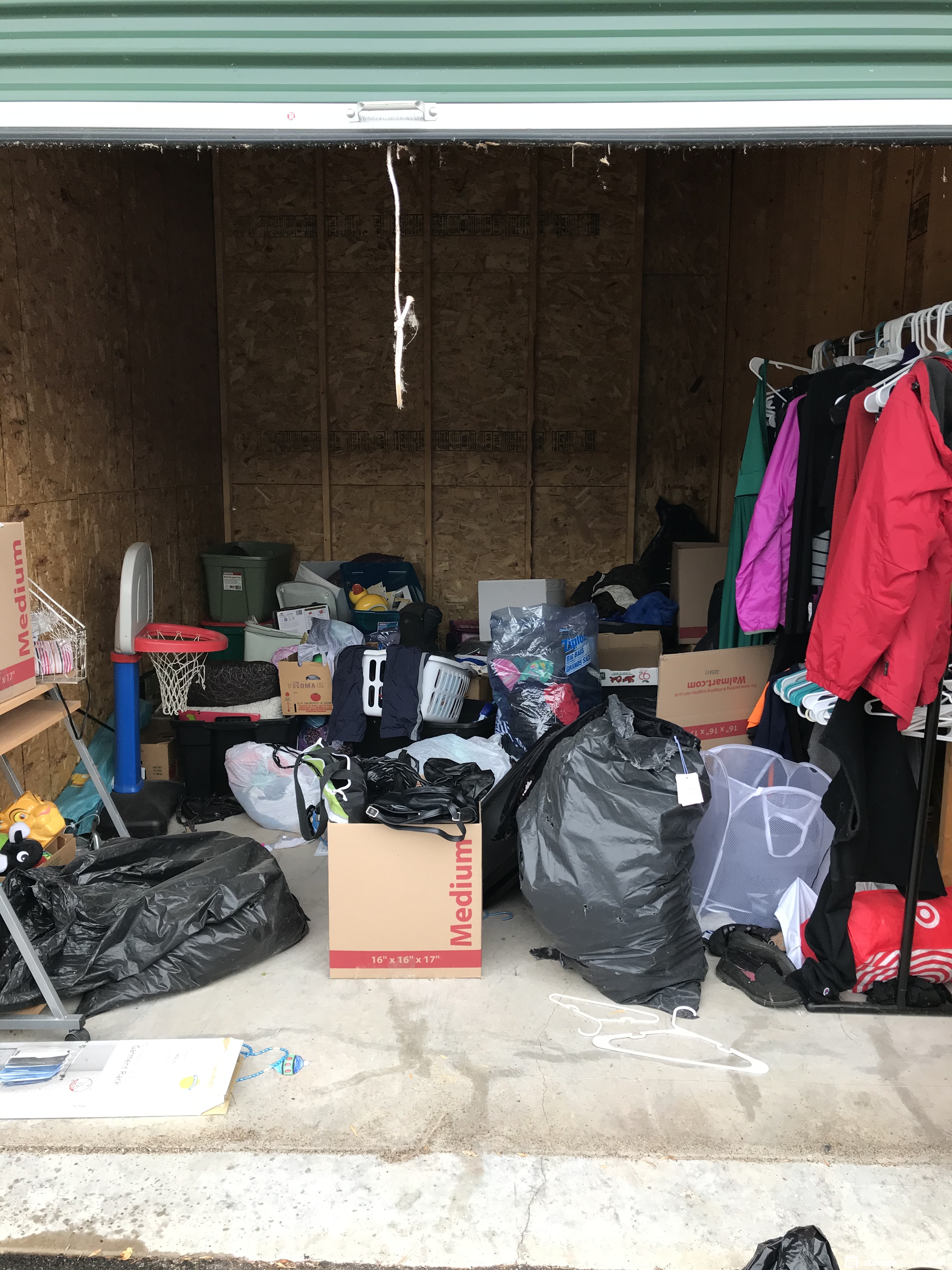 This unit appears to contain Bauer hockey skates, golf clubs, Columbia boots, small rolling desk, clothes hanger, clothing, games, crafting items, toy kitchen