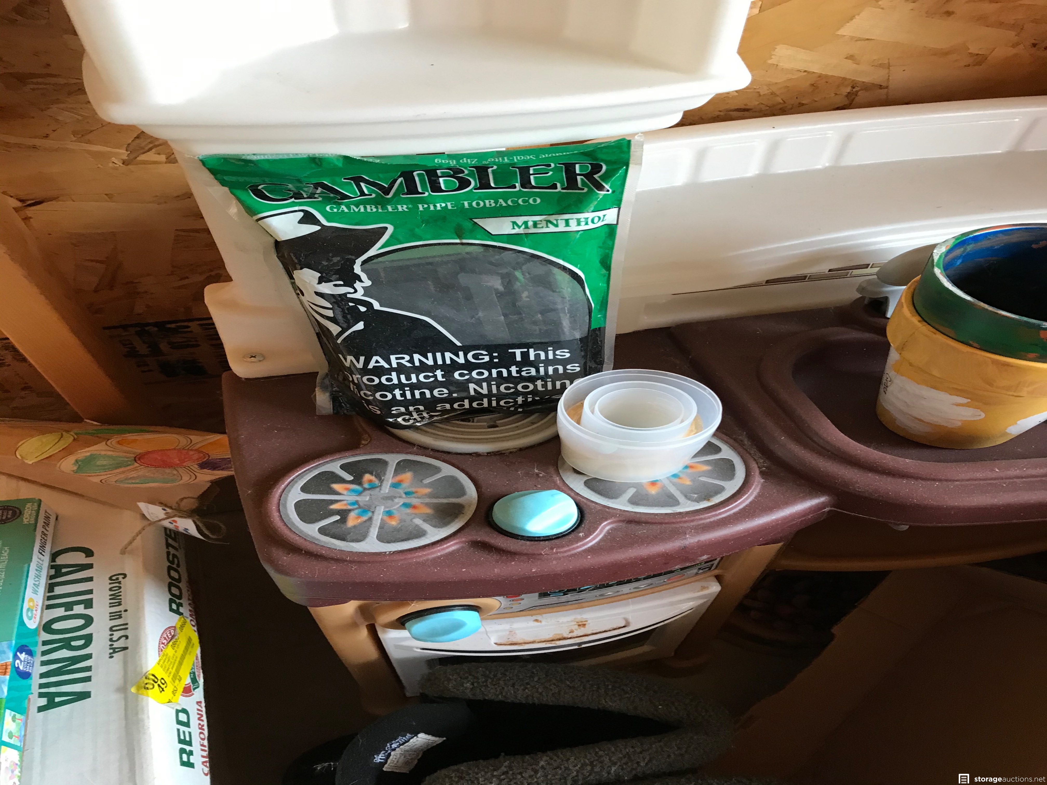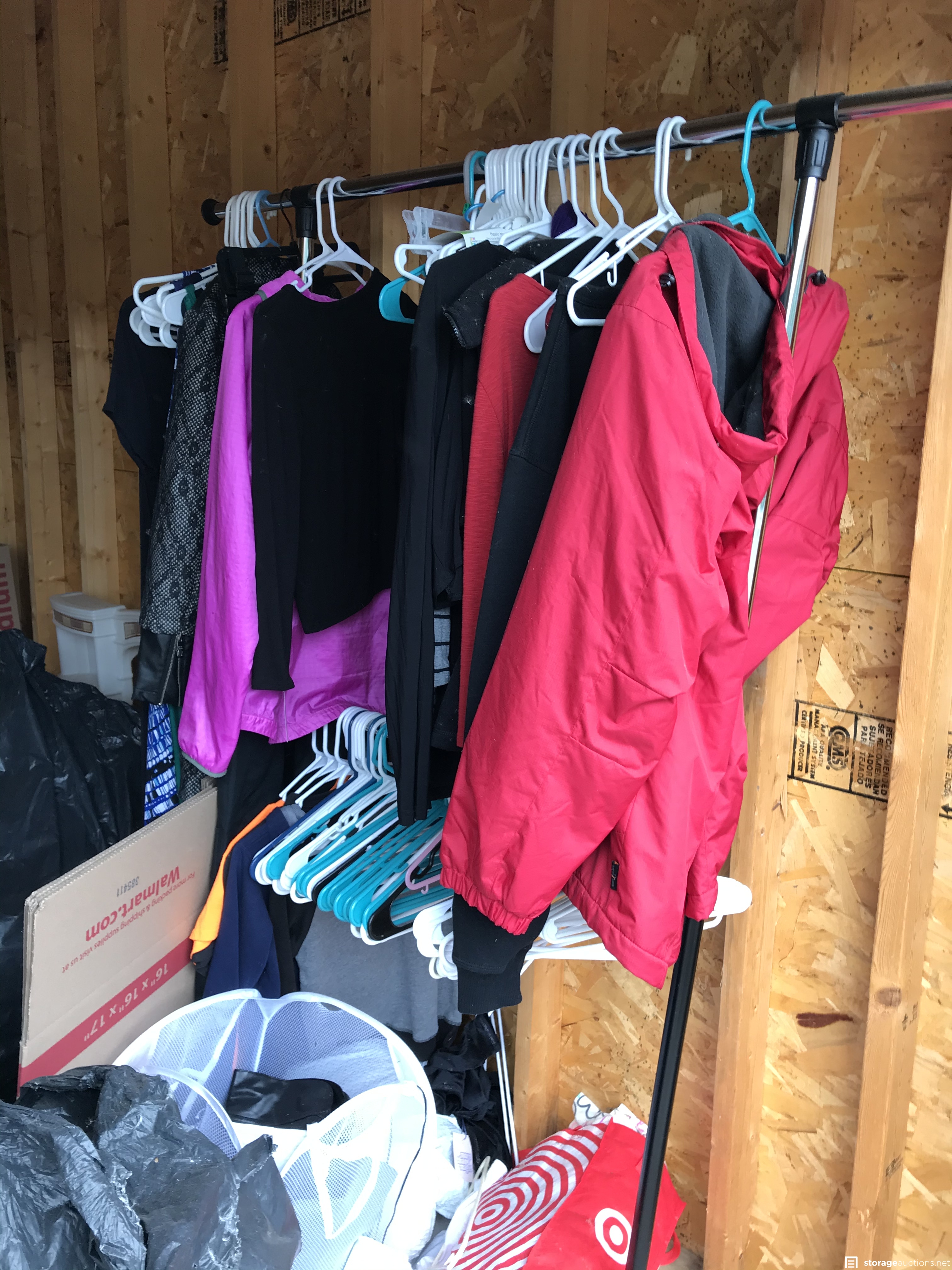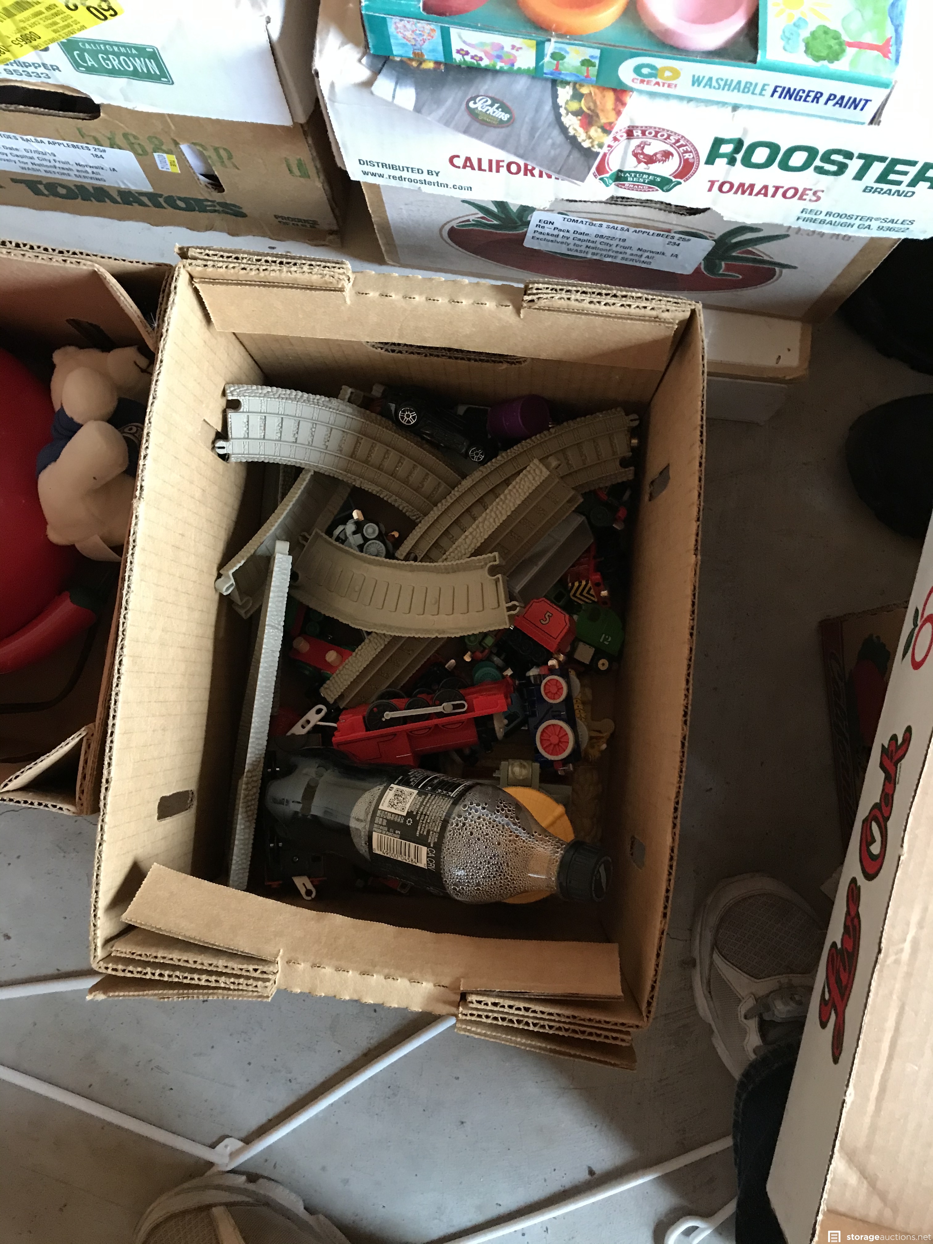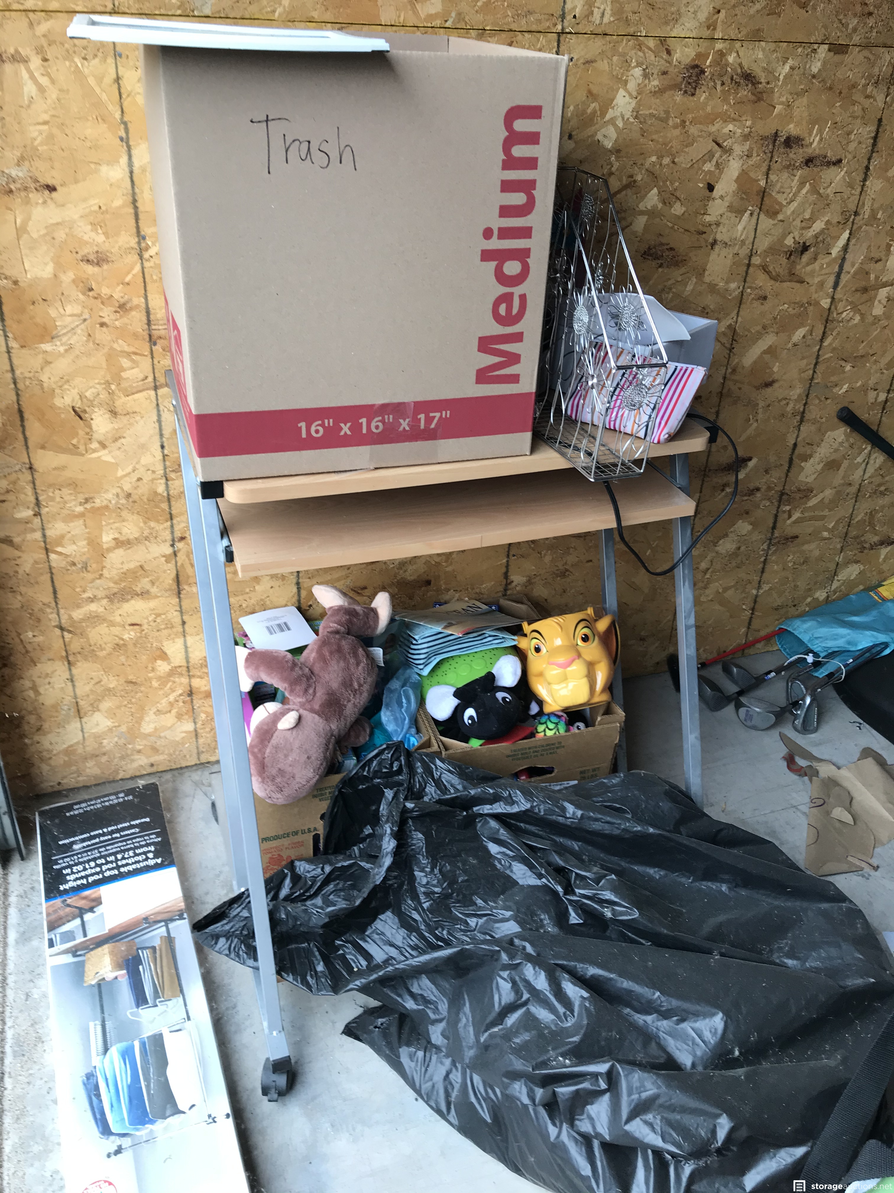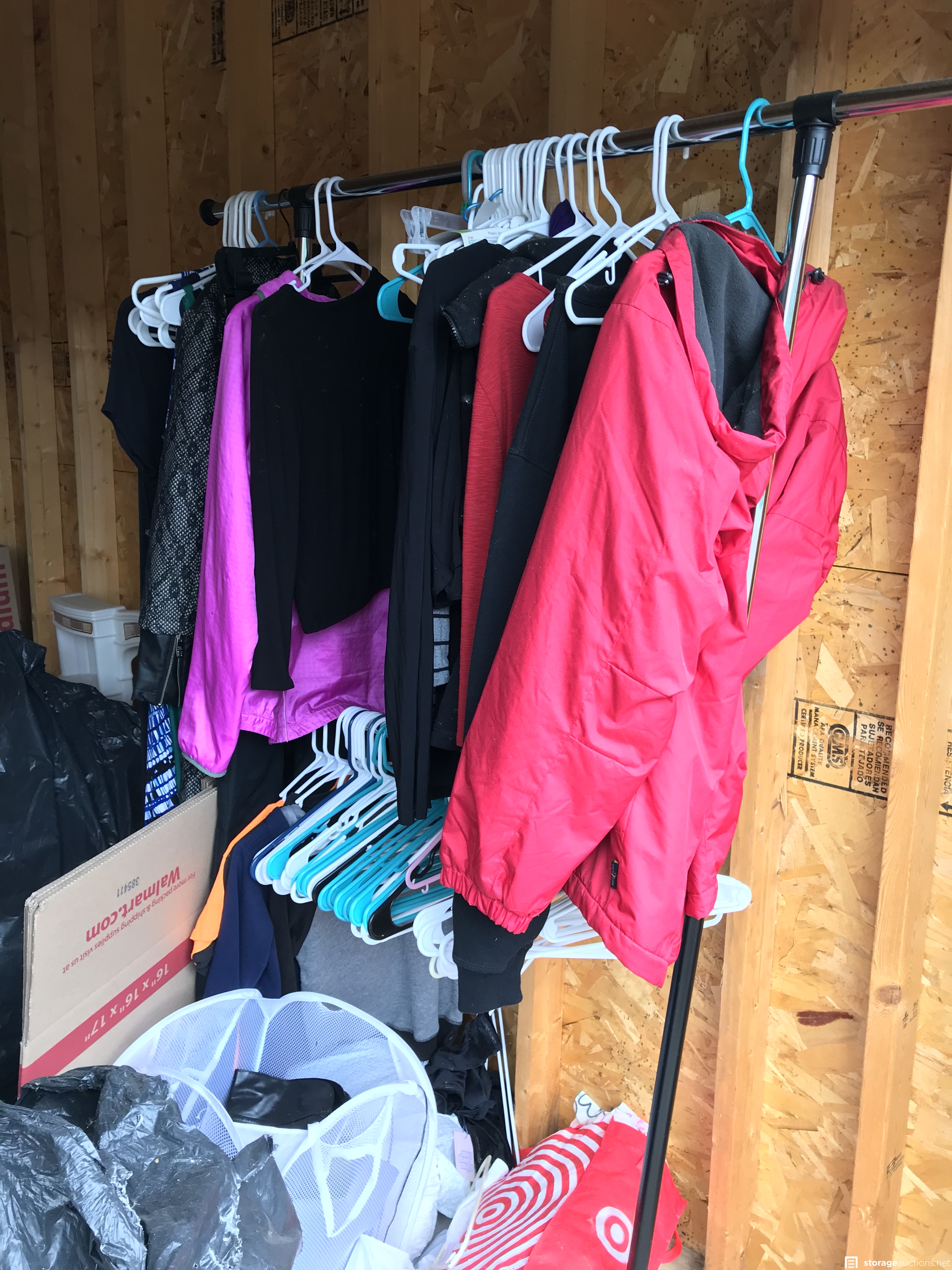 This unit appears to contain Bauer hockey skates, golf clubs, Columbia boots, small rolling desk, clothes hanger, clothing, games, crafting items, toy kitchen