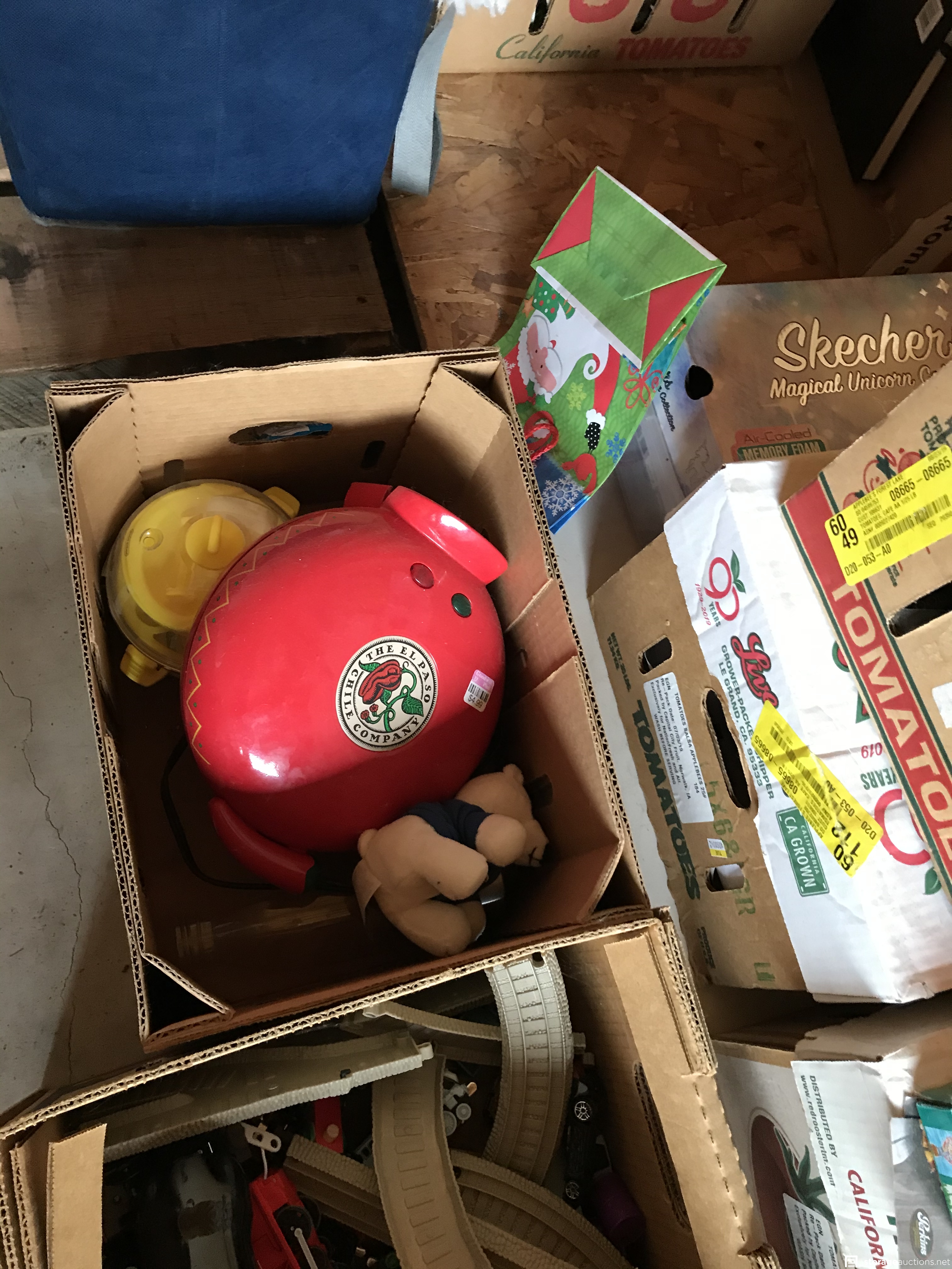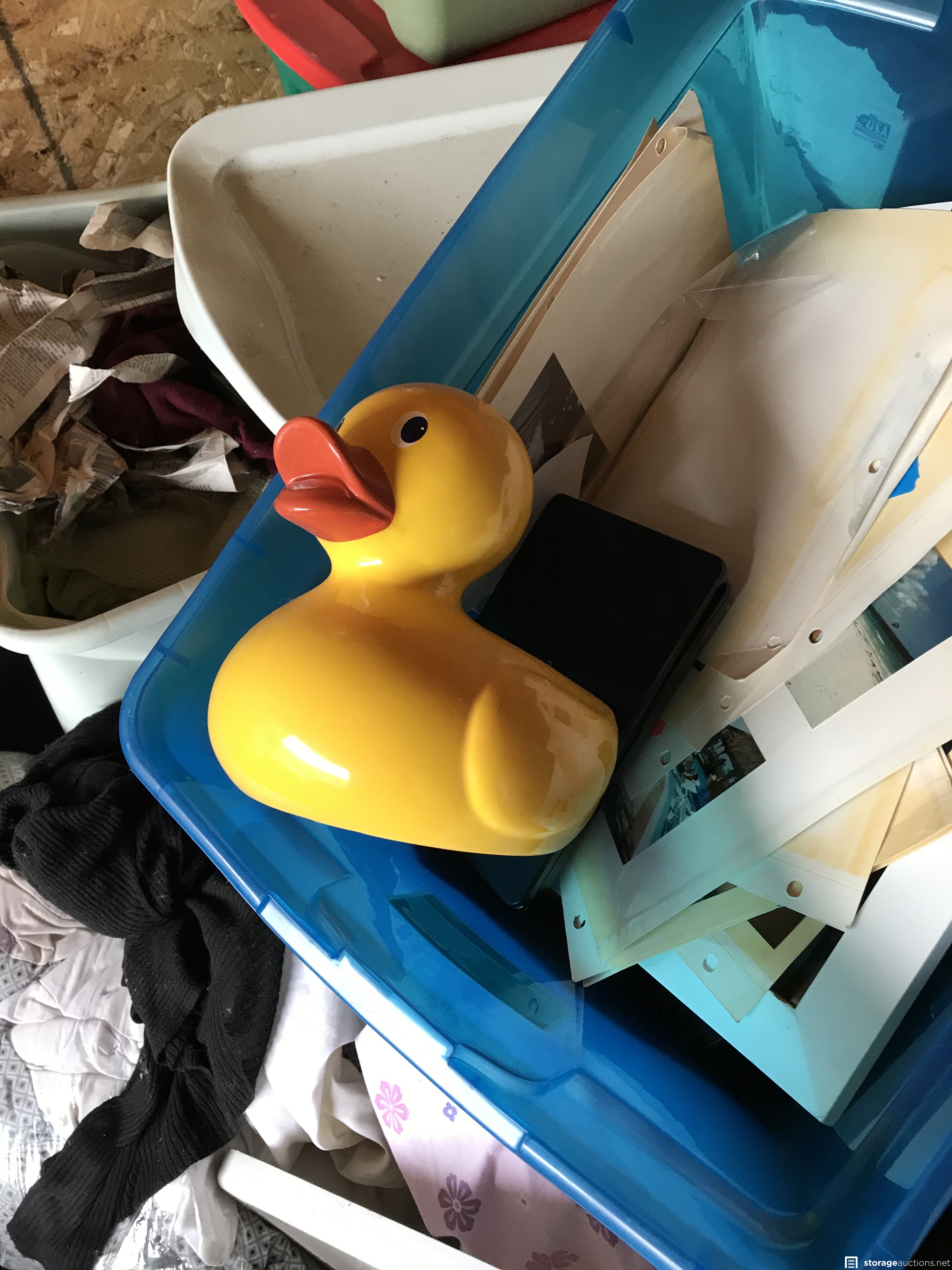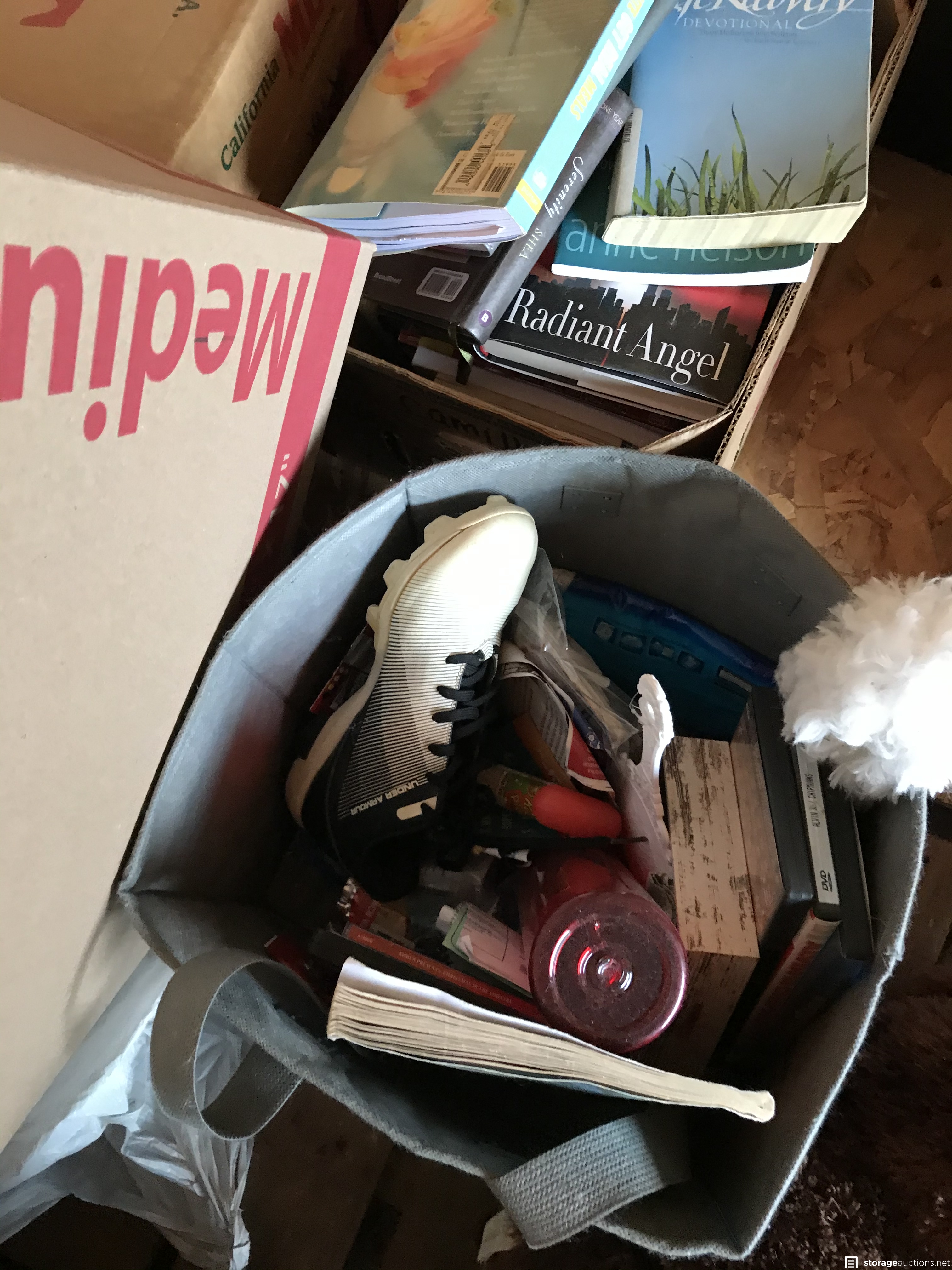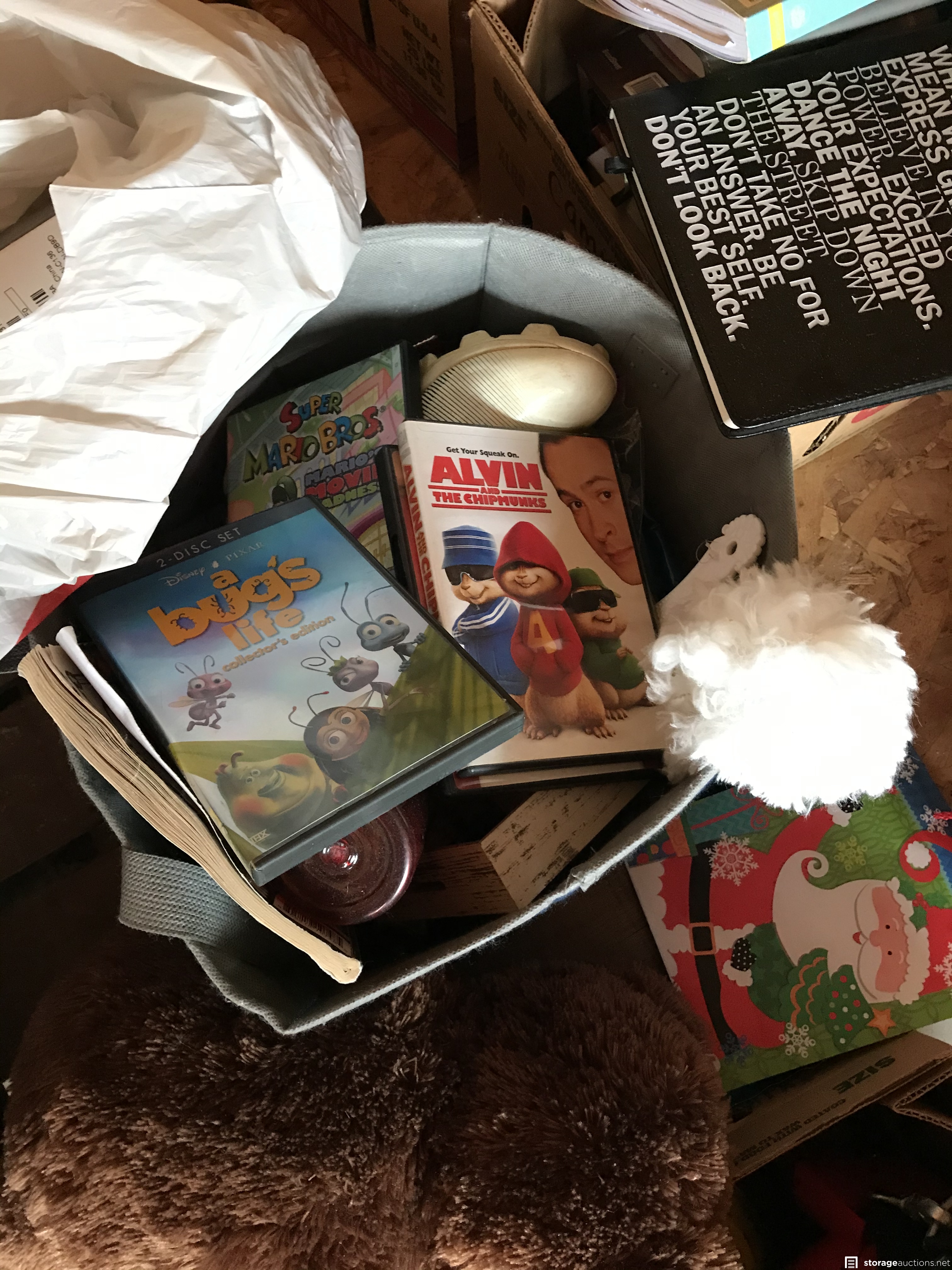This unit appears to contain Bauer hockey skates, golf clubs, Columbia boots, small rolling desk, clothes hanger, clothing, games, crafting items, toy kitchen