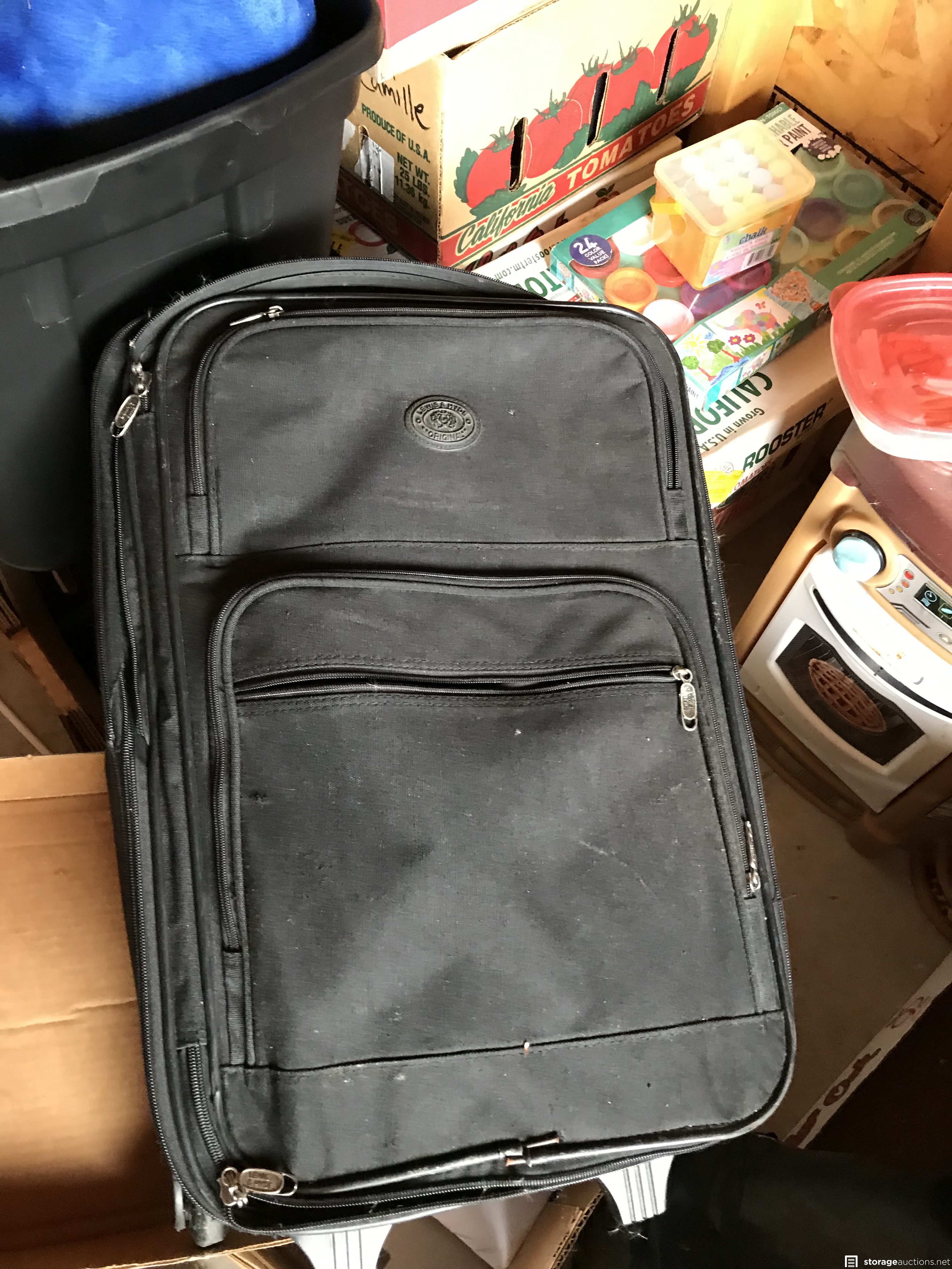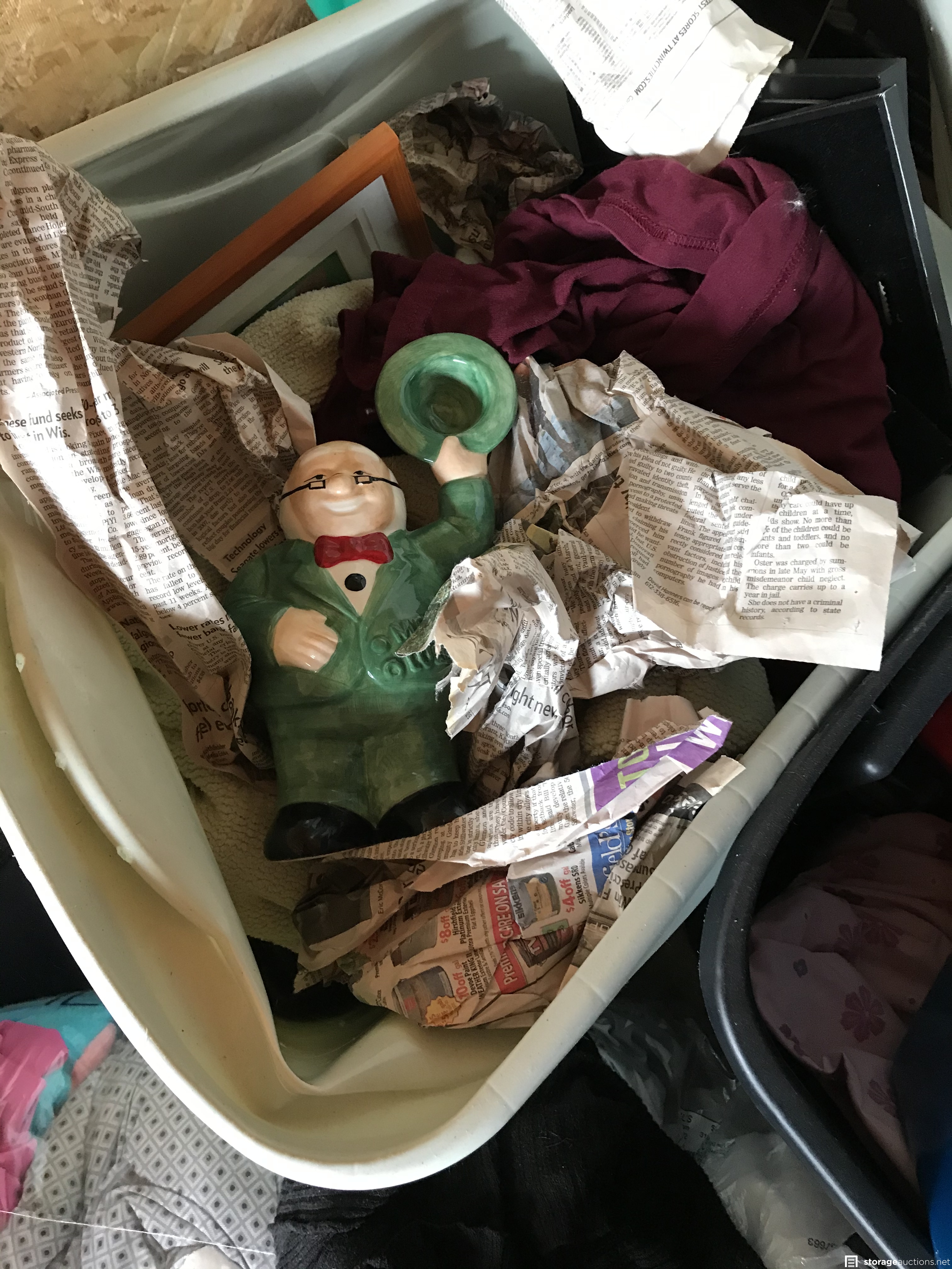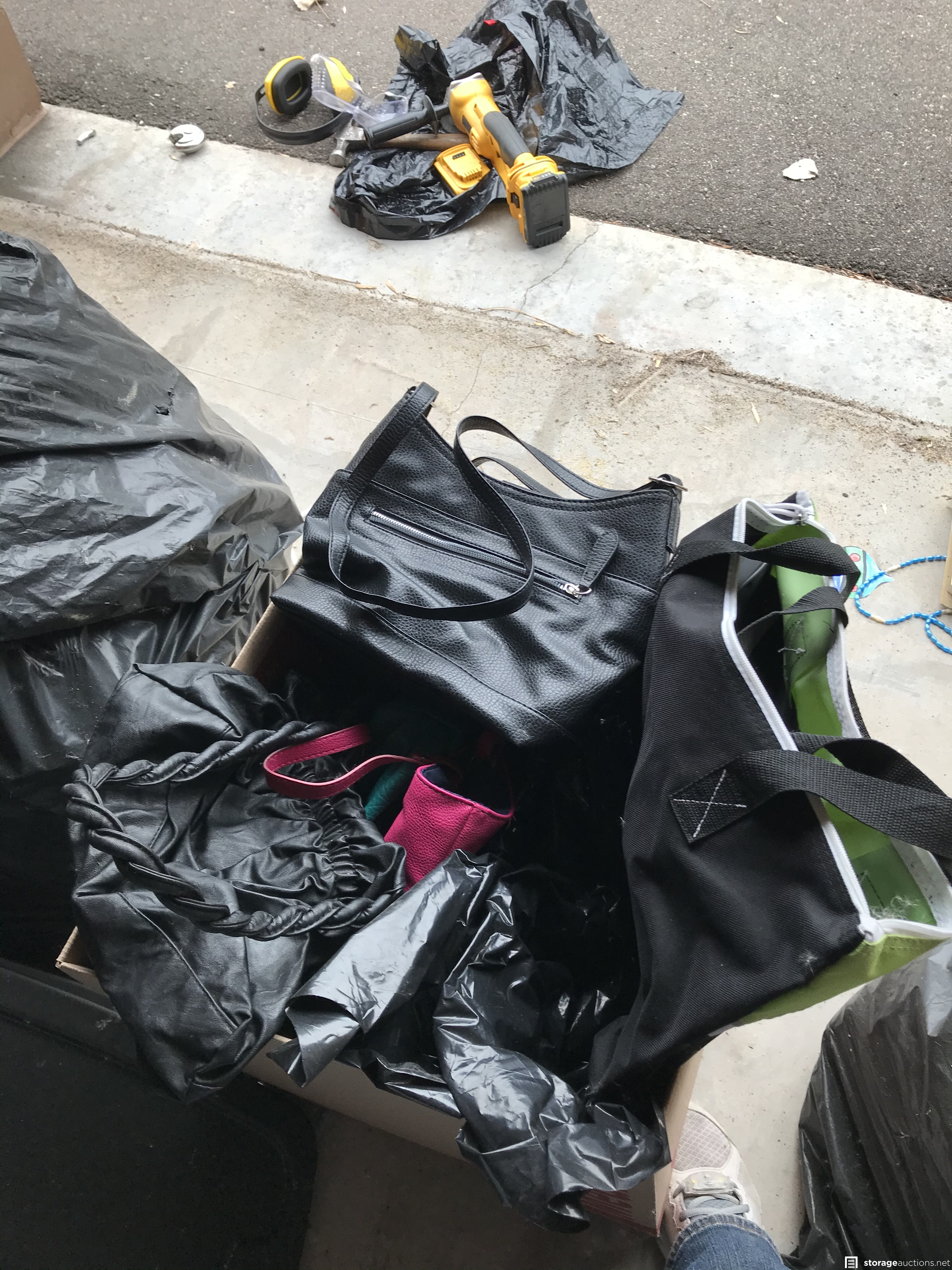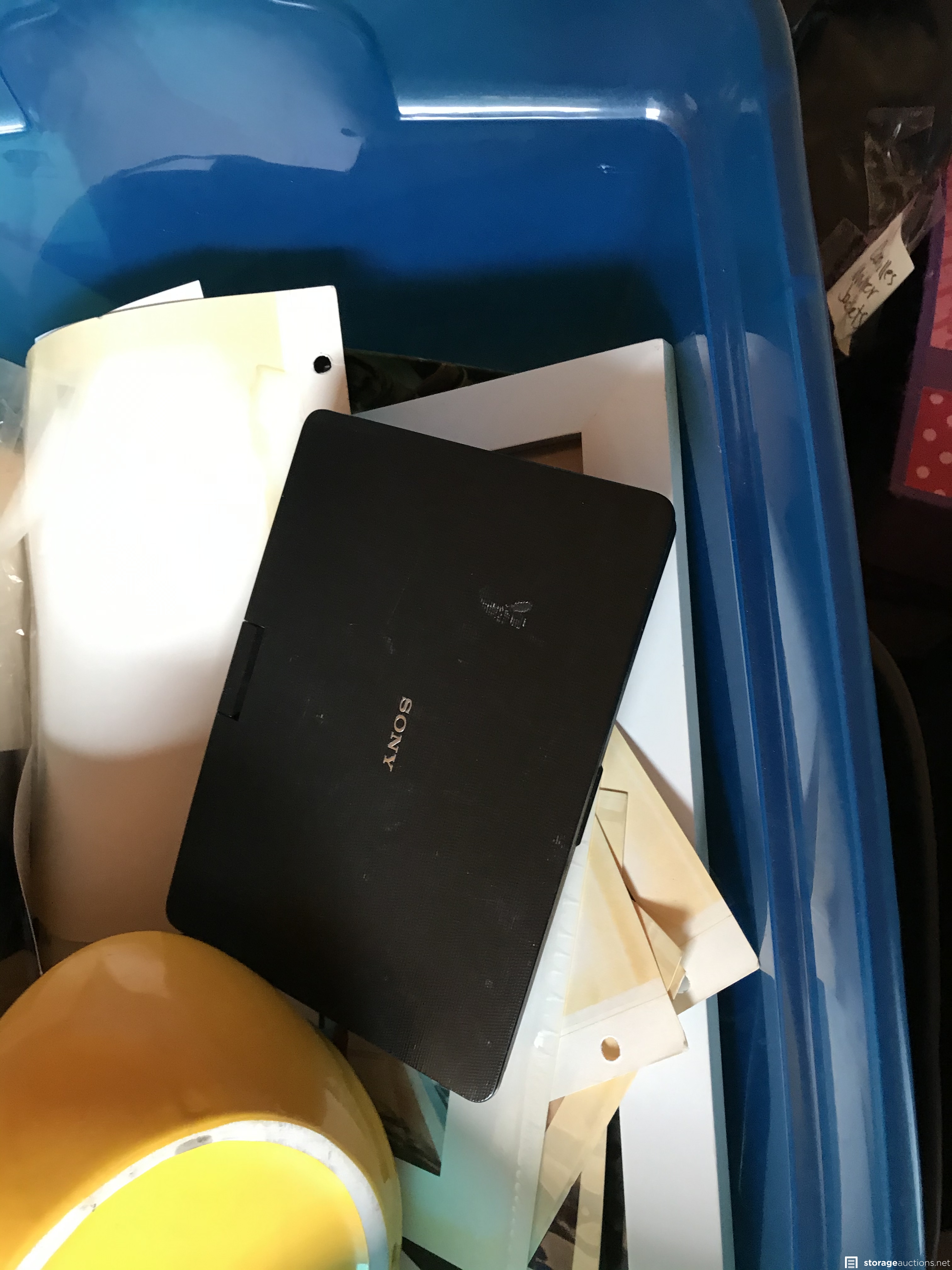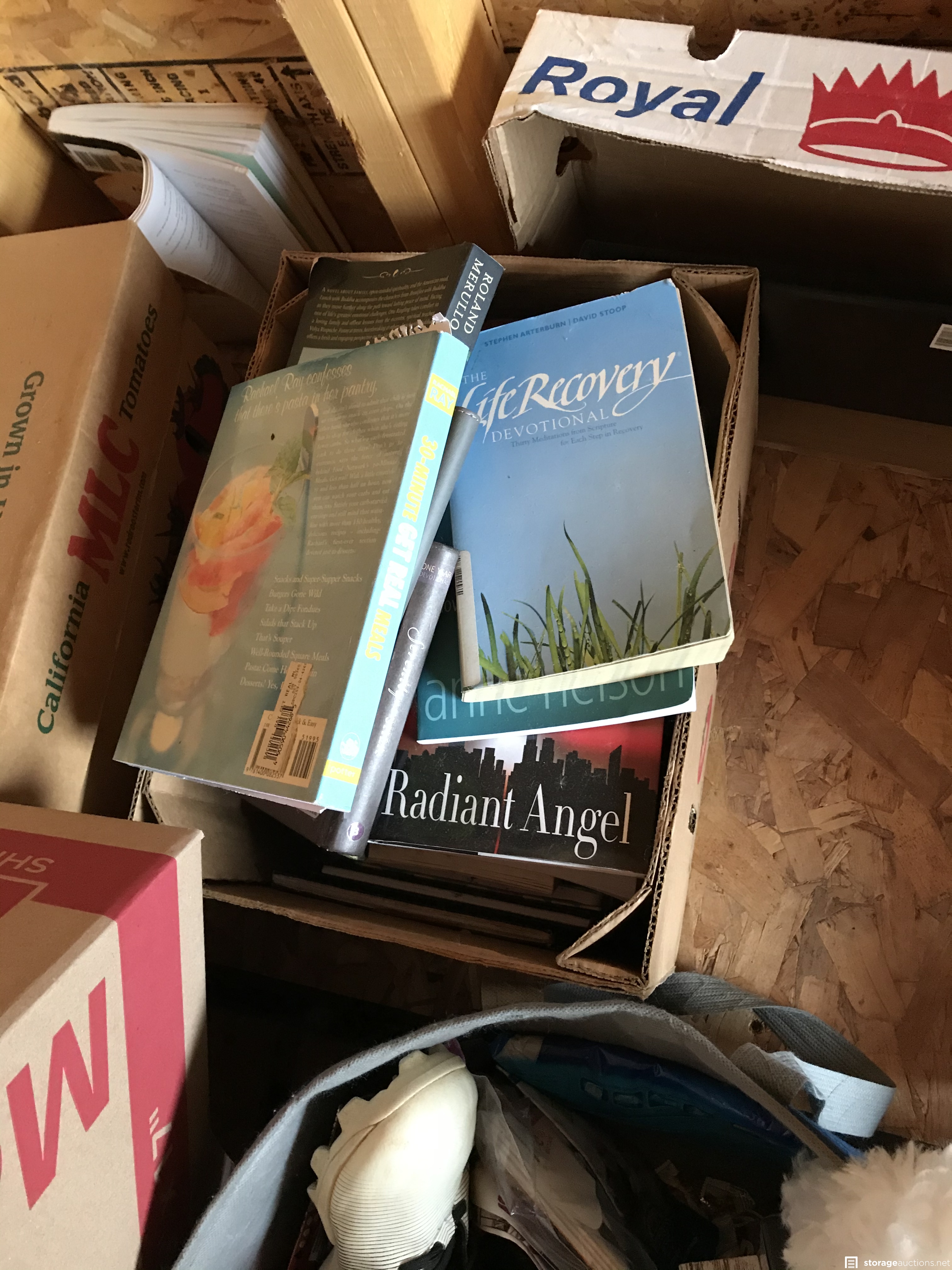 This unit appears to contain Bauer hockey skates, golf clubs, Columbia boots, small rolling desk, clothes hanger, clothing, games, crafting items, toy kitchen