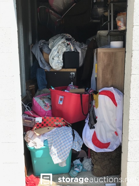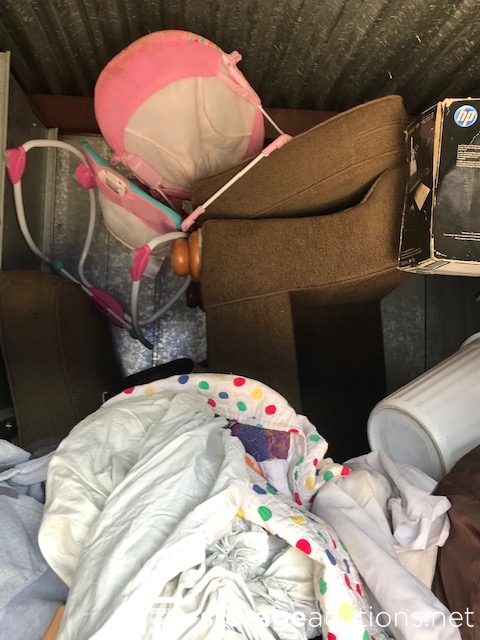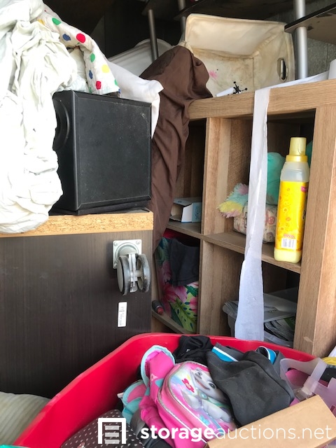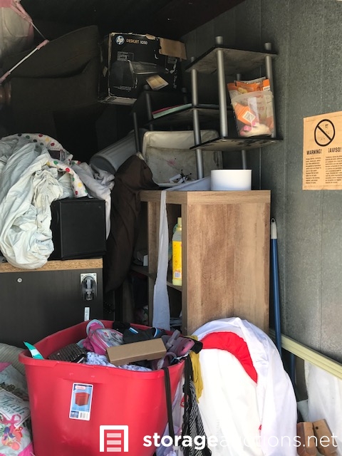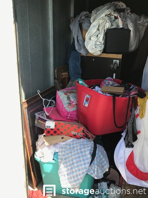This unit appears to contain 2 boxes, clothing, bedding, mirror, entertainment center, table, 3 totes, book shelf, sofa, wall art, baby rockers, misc items.
