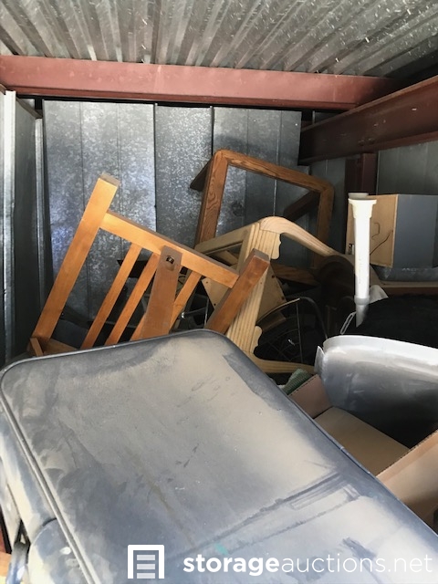 This unit appears to contain air conditioner, hboard, 2+ boxes, clothing, speakers, suitcases, table, kitchen cabinet, cart, back packs, 2 plastic containers, disability shower chair, misc items.