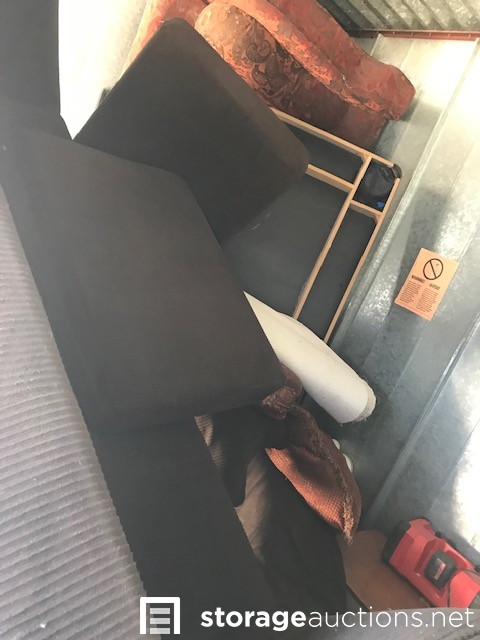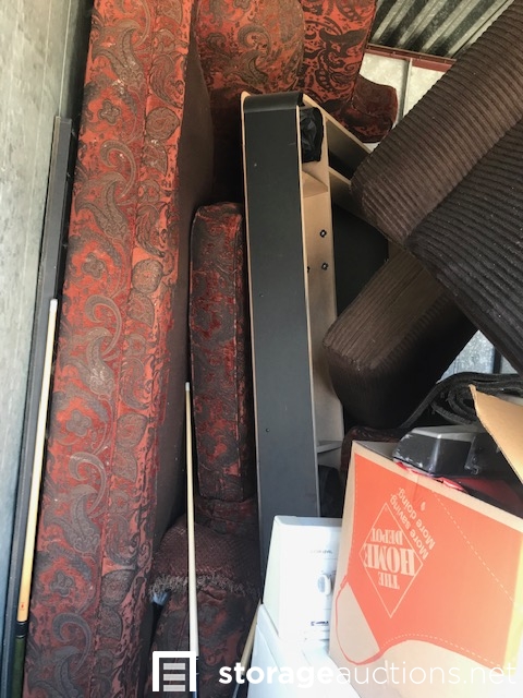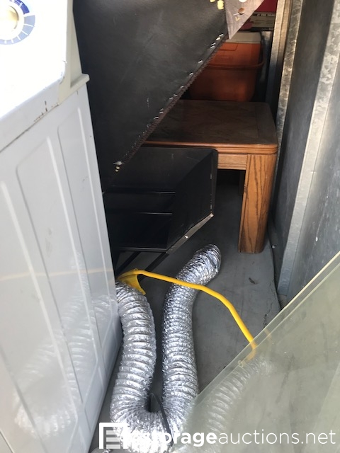 This unit appears to contain 4 boxes, entertainment center, ice chest, table, washer, dryer, 2 sofas, pipe benders, pool sticks, pool, table, oven, tool bag, beer light frame.