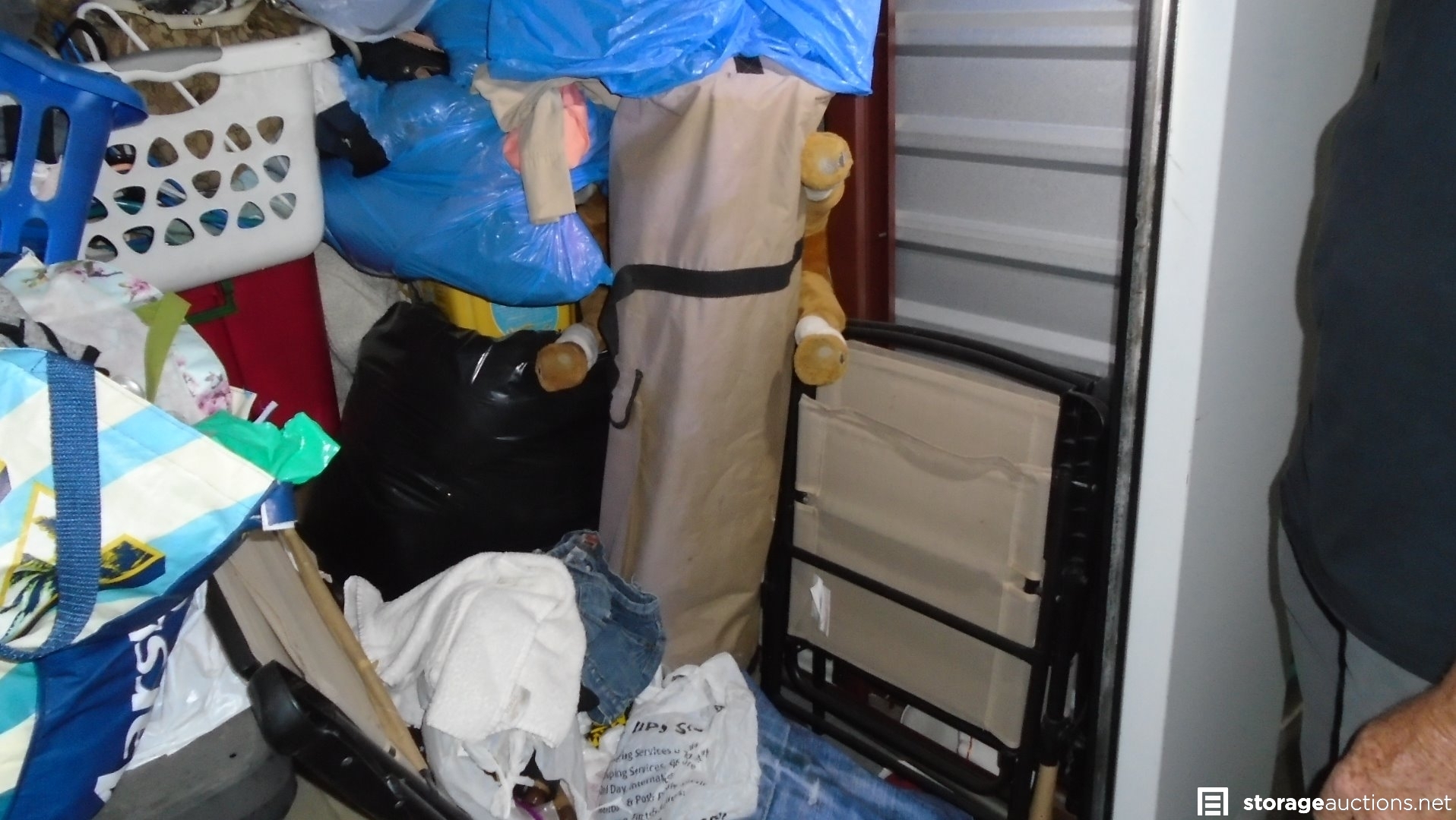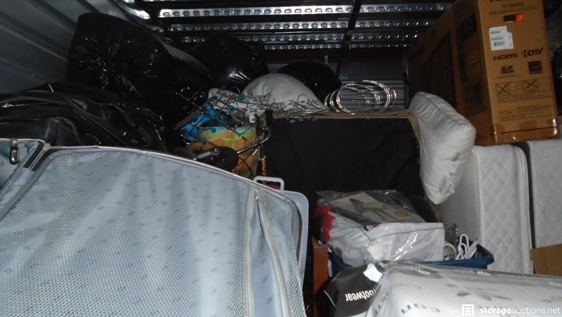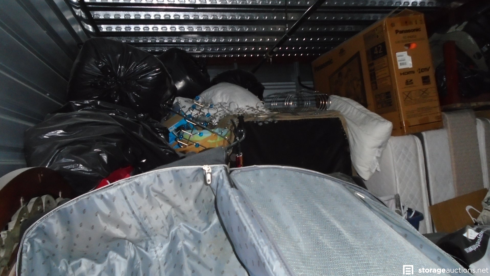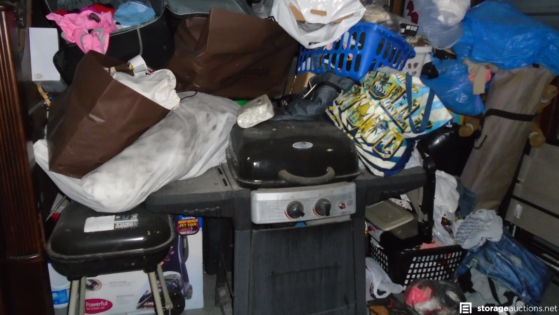 IT APPREARS THIS UNIT HAS: gas bbq grill, charcoal grill, head board and foot board , mattresses and box springs, bicycle , lots of clothing, miscellaneous bags and boxes and bins, coffee table, sofa or love seat, house décor, electric scooter, cooler, lawn chairs, possible easy up, chairs