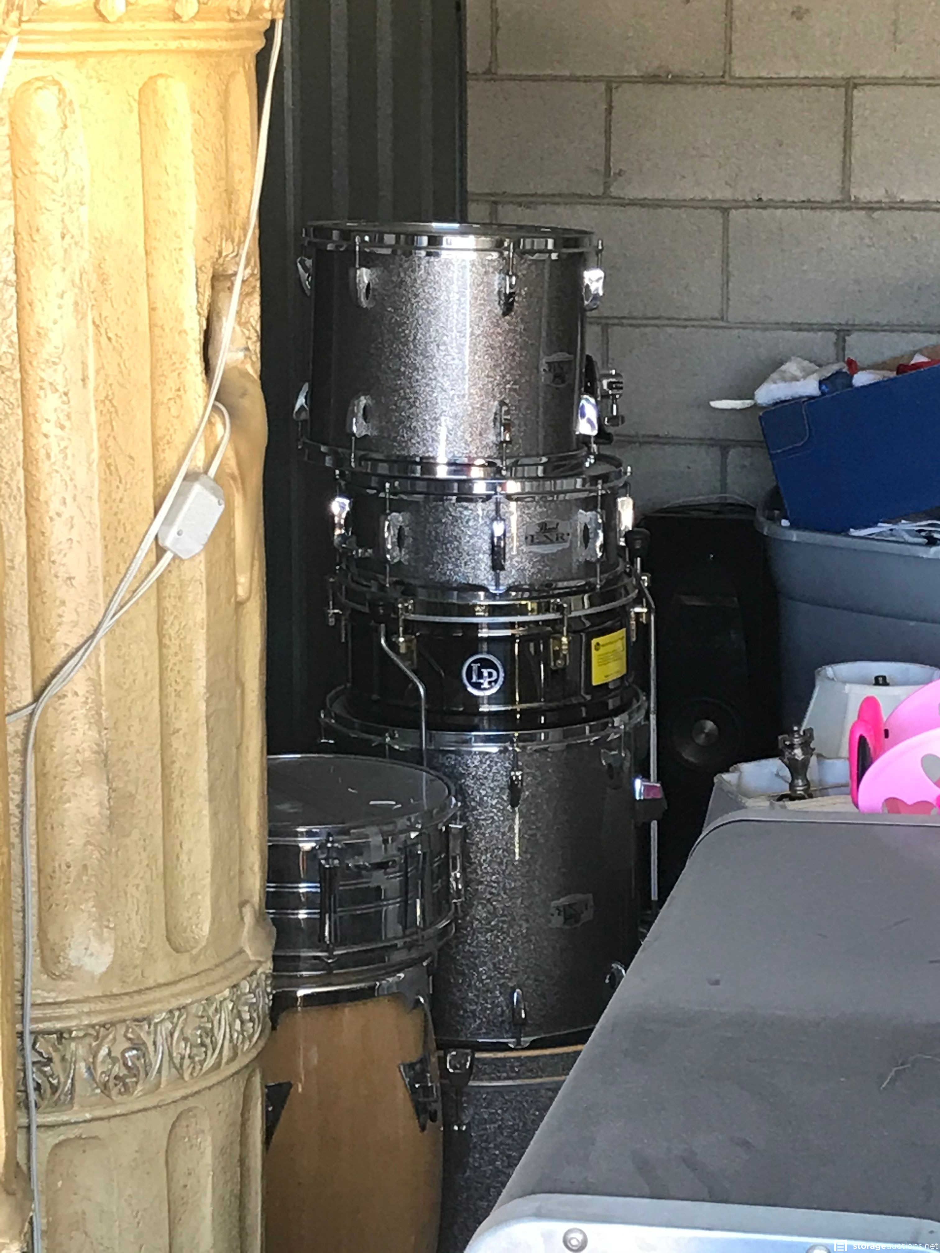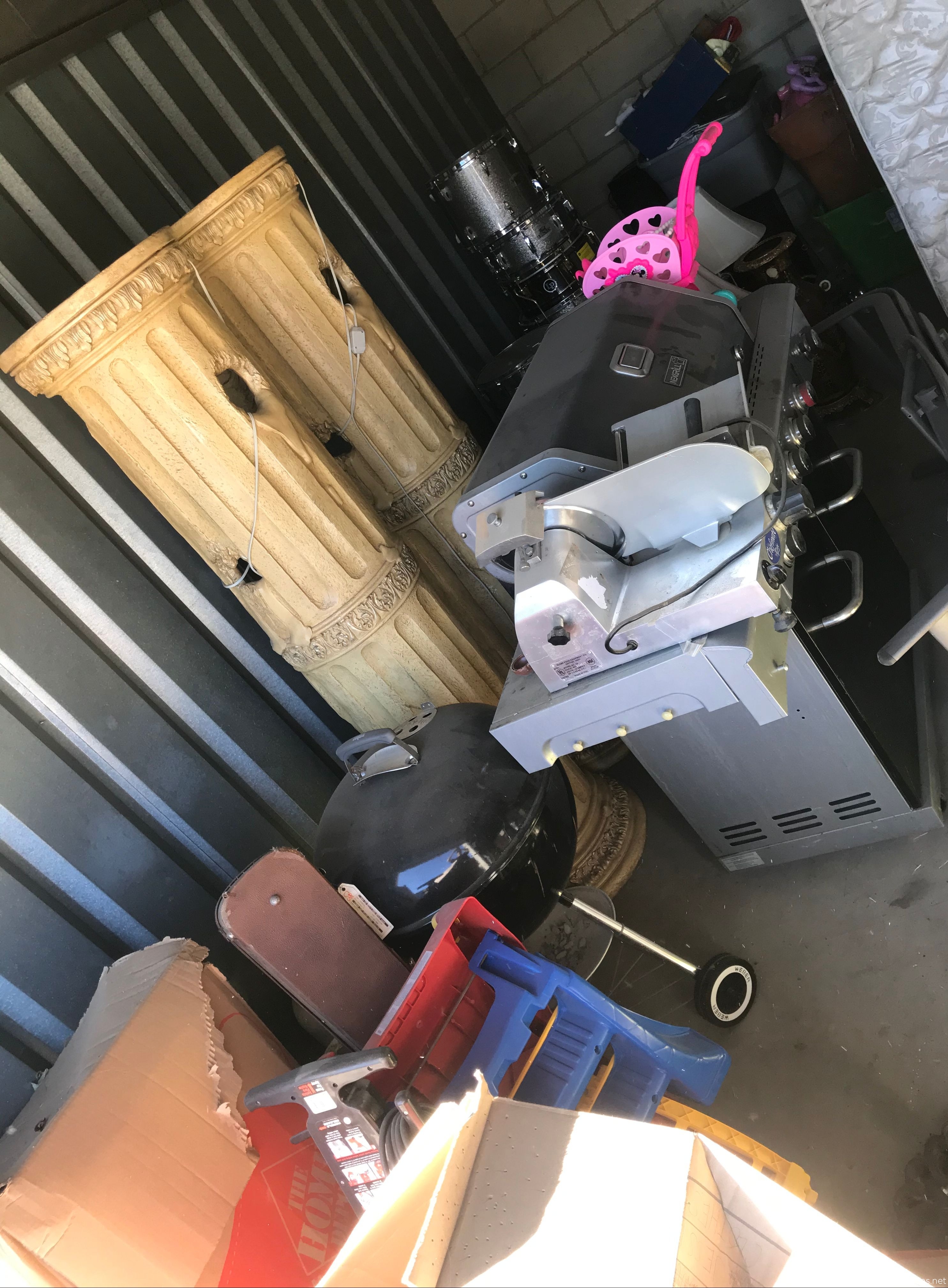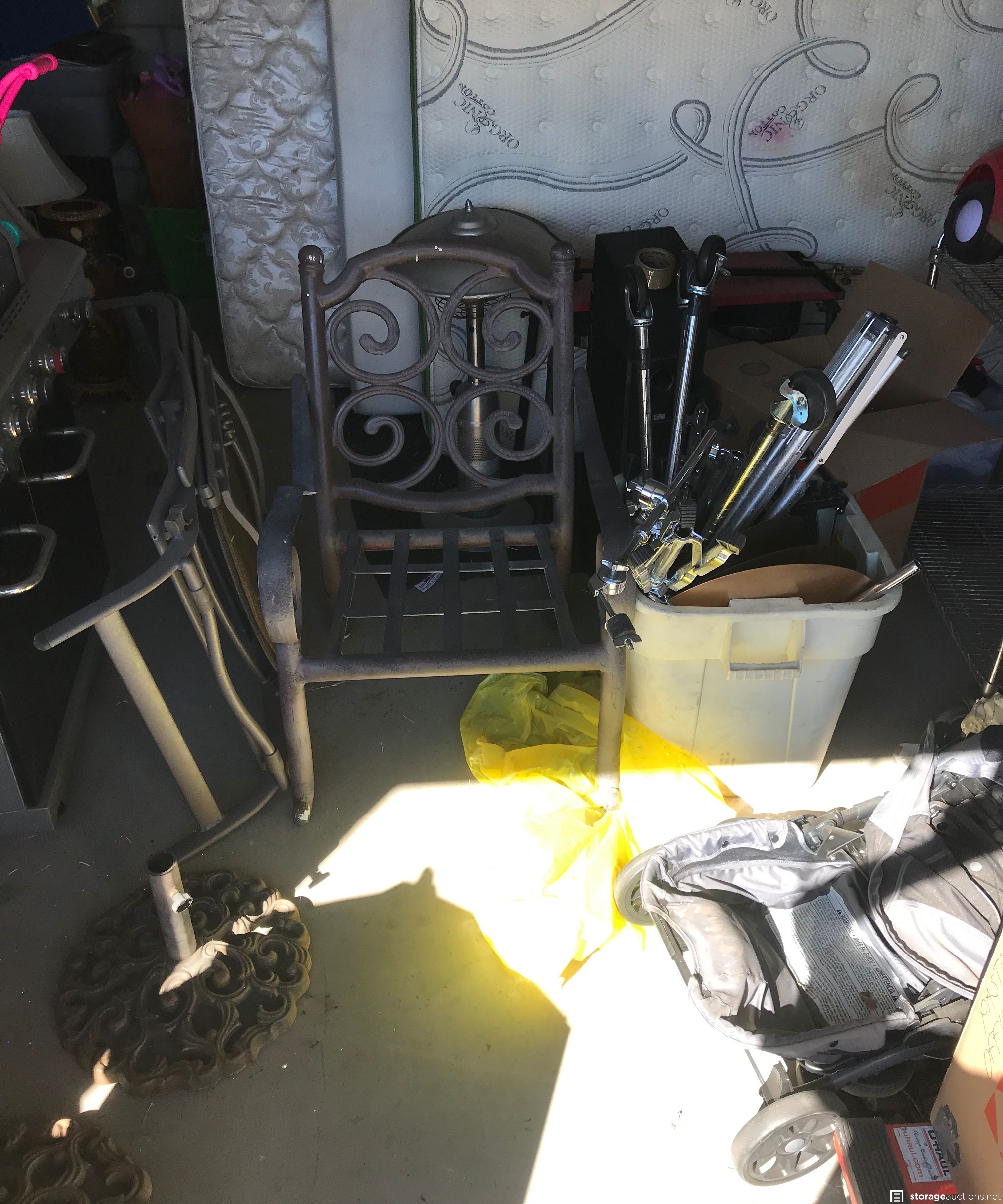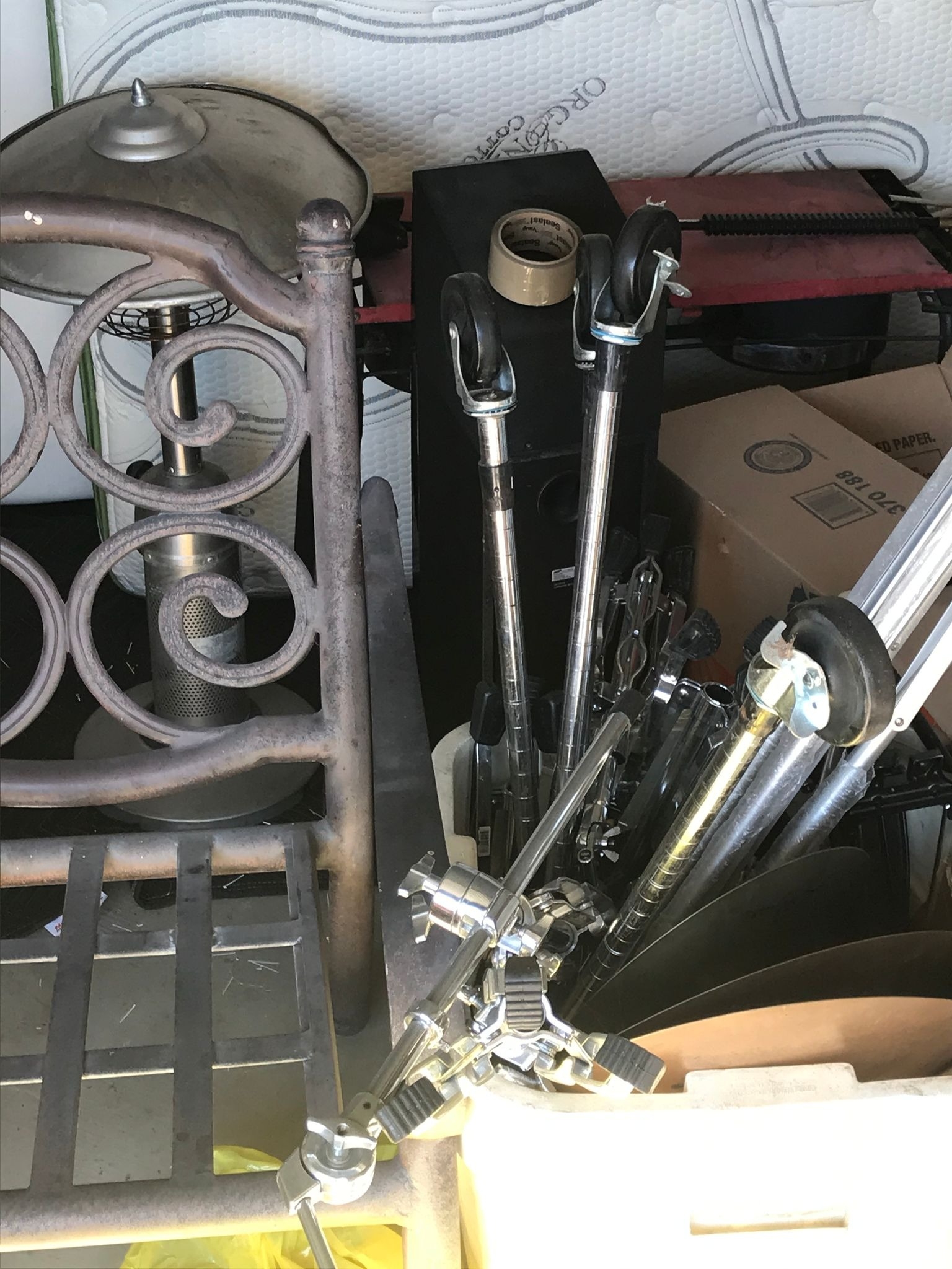 Carpet cleaner, stroller, speaker, barbecues, drums, lamp, mattress, chairs