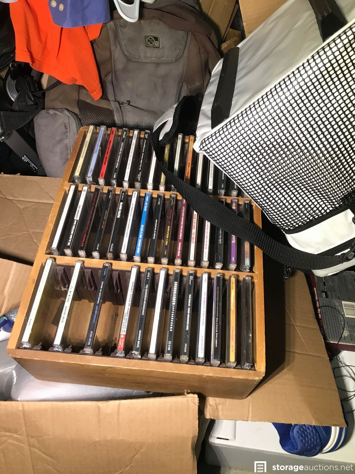 misc boxes, cds, suit cases, tool box, tent, extension cord