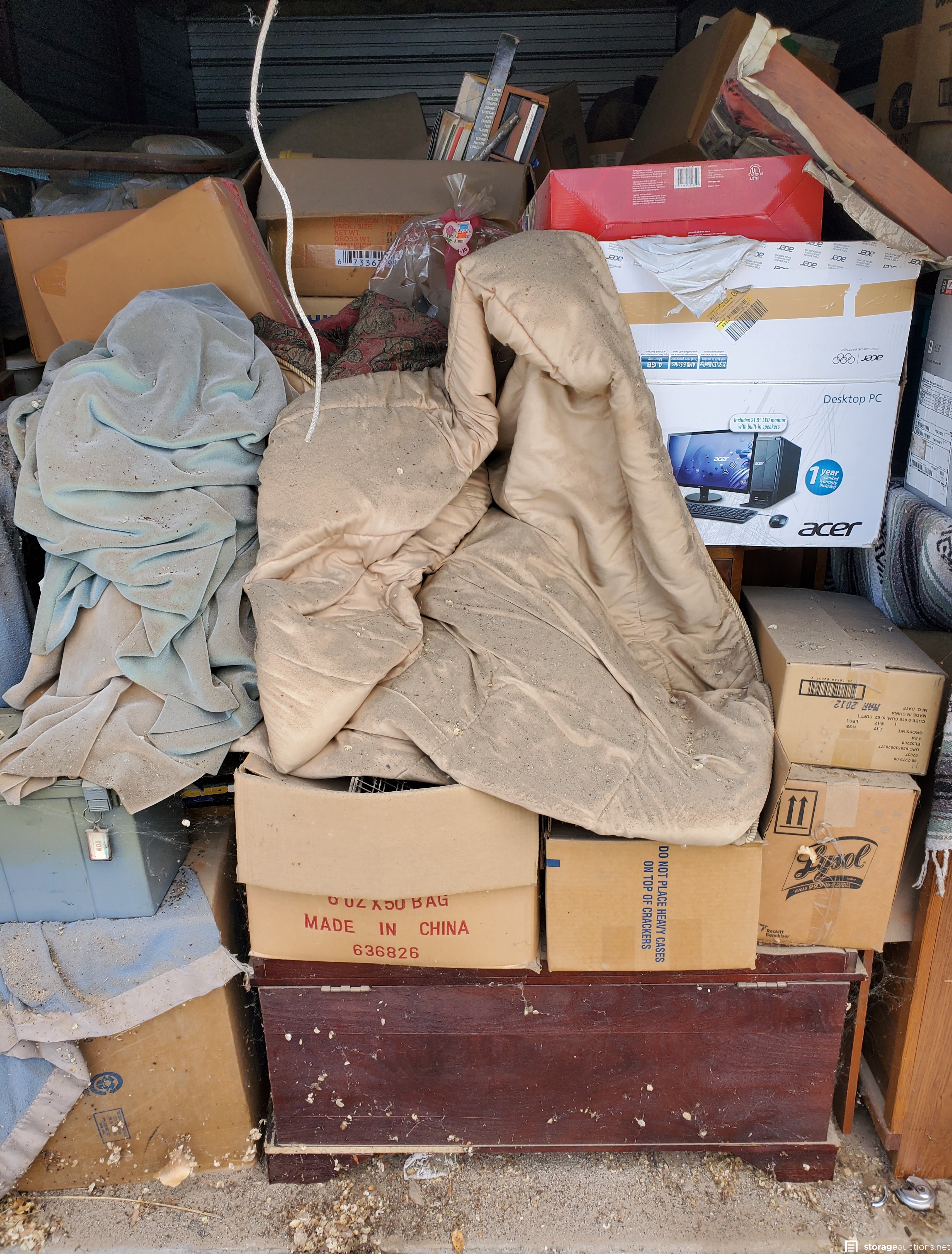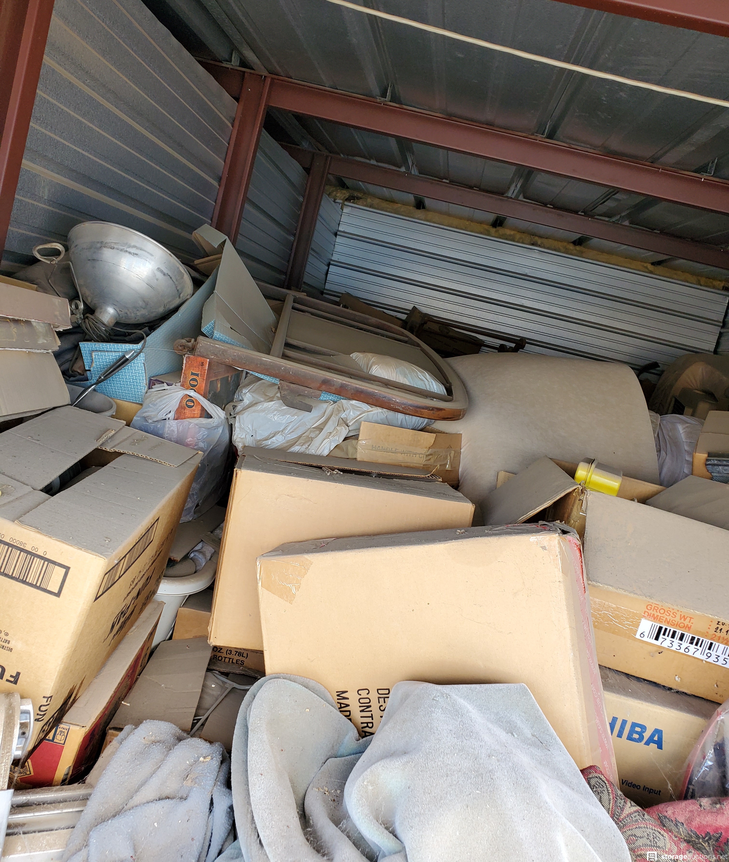 Blankets, metal shelving, boxes, cabinet, Headboard