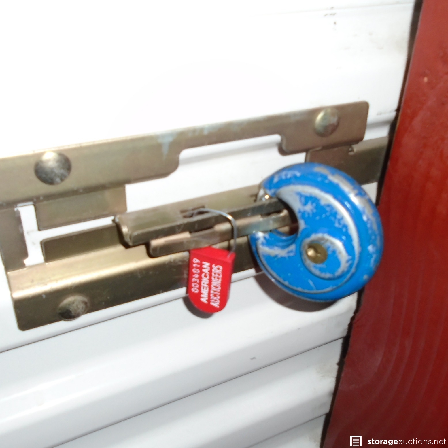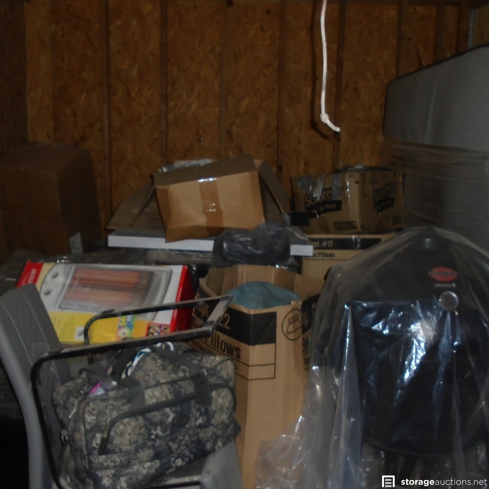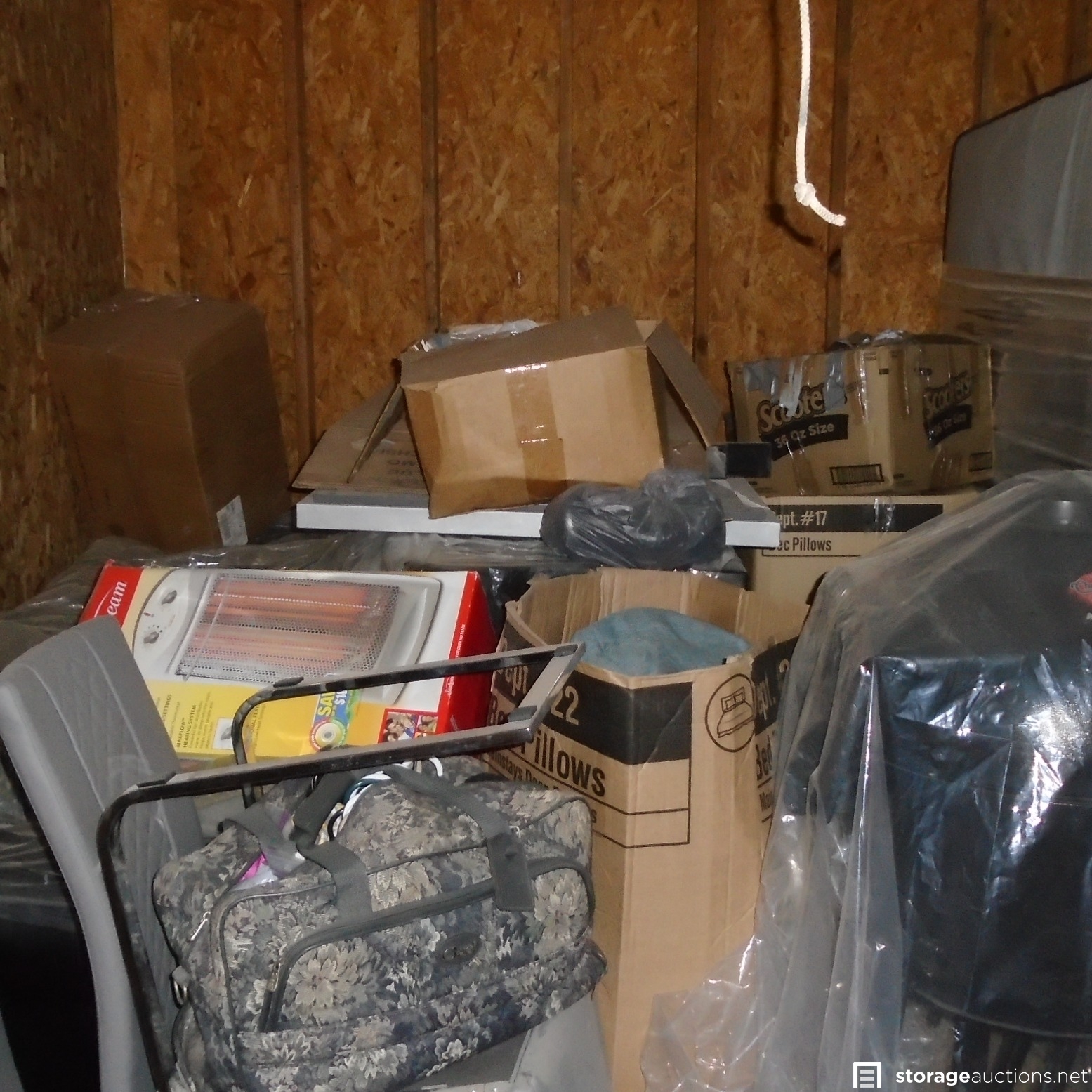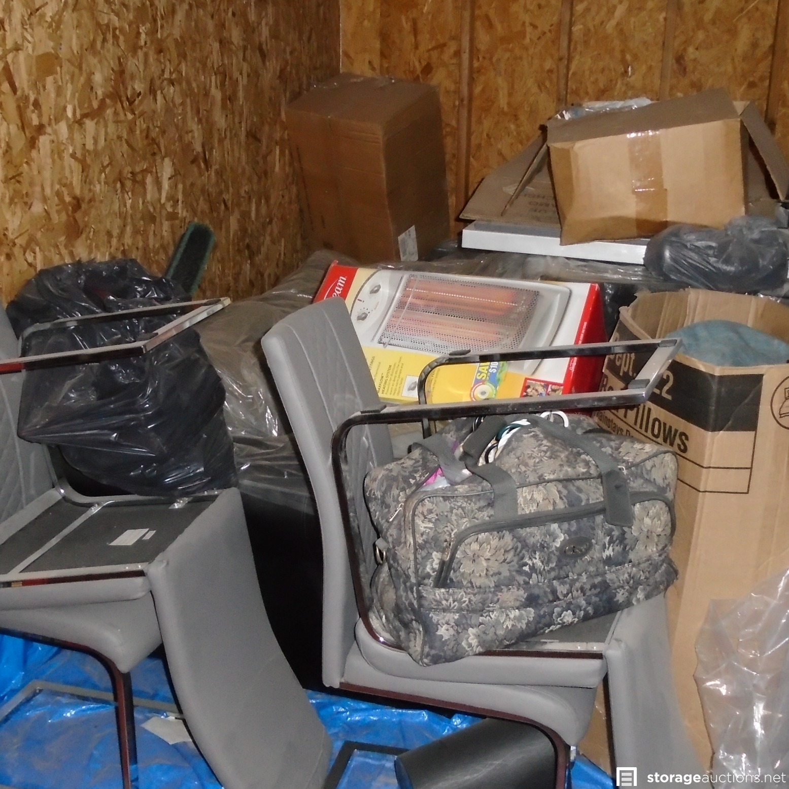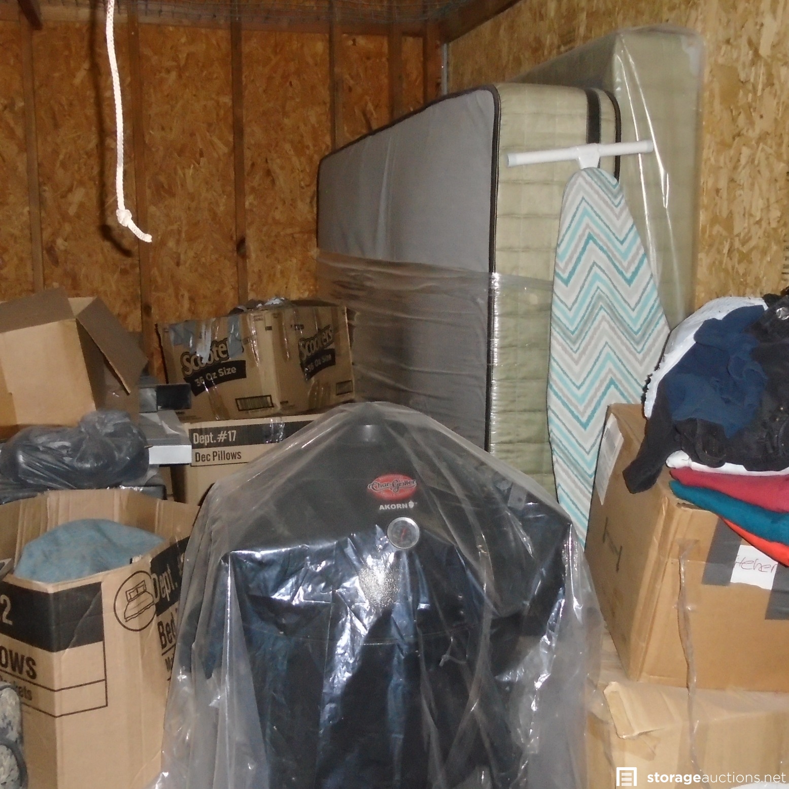 Unit appears to contain BBQ grill, mattress & box springs, desk, dining table & chairs, sofa/loveseat, tools, ironing board, arm chair, bags, card table & 2 chairs, somewhat obstructed view