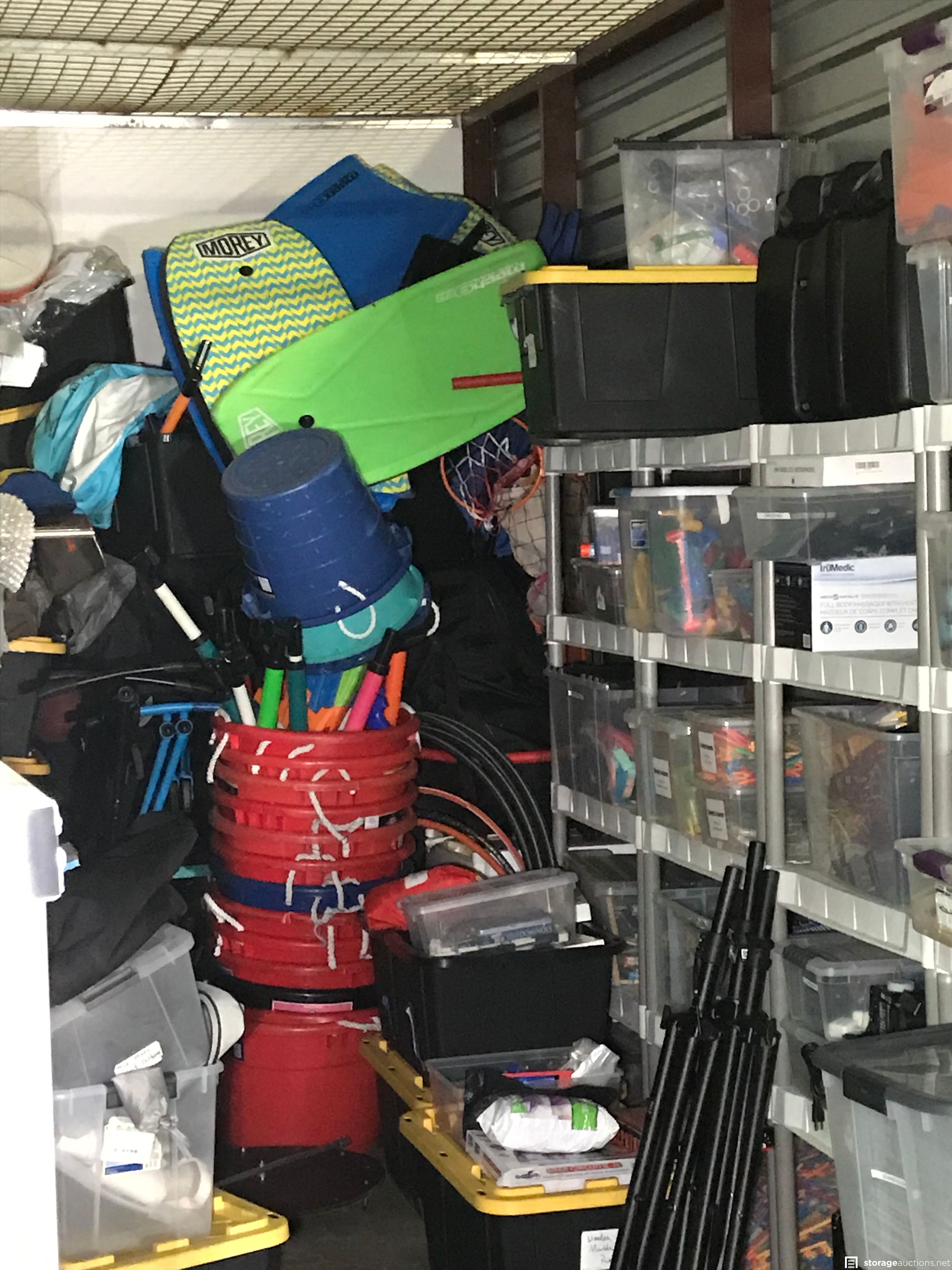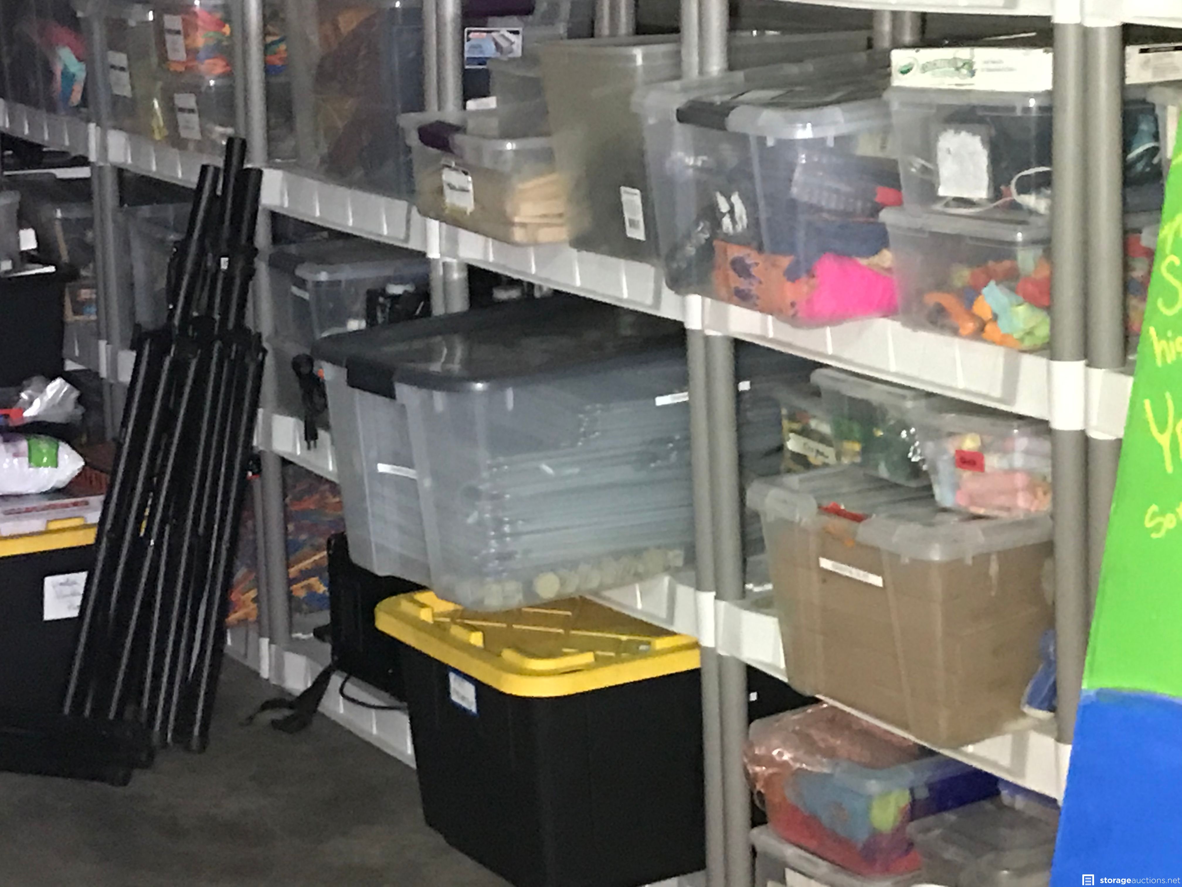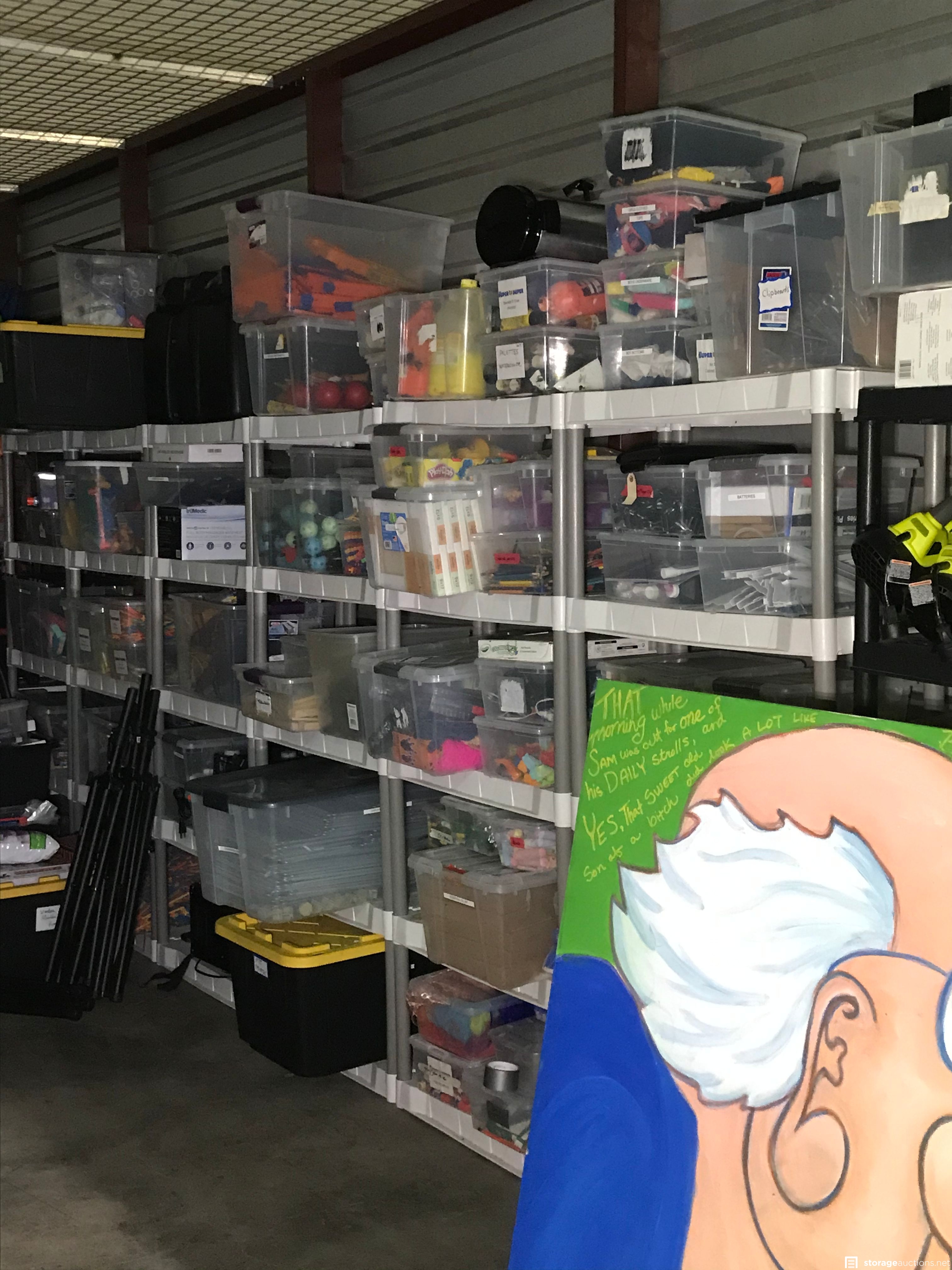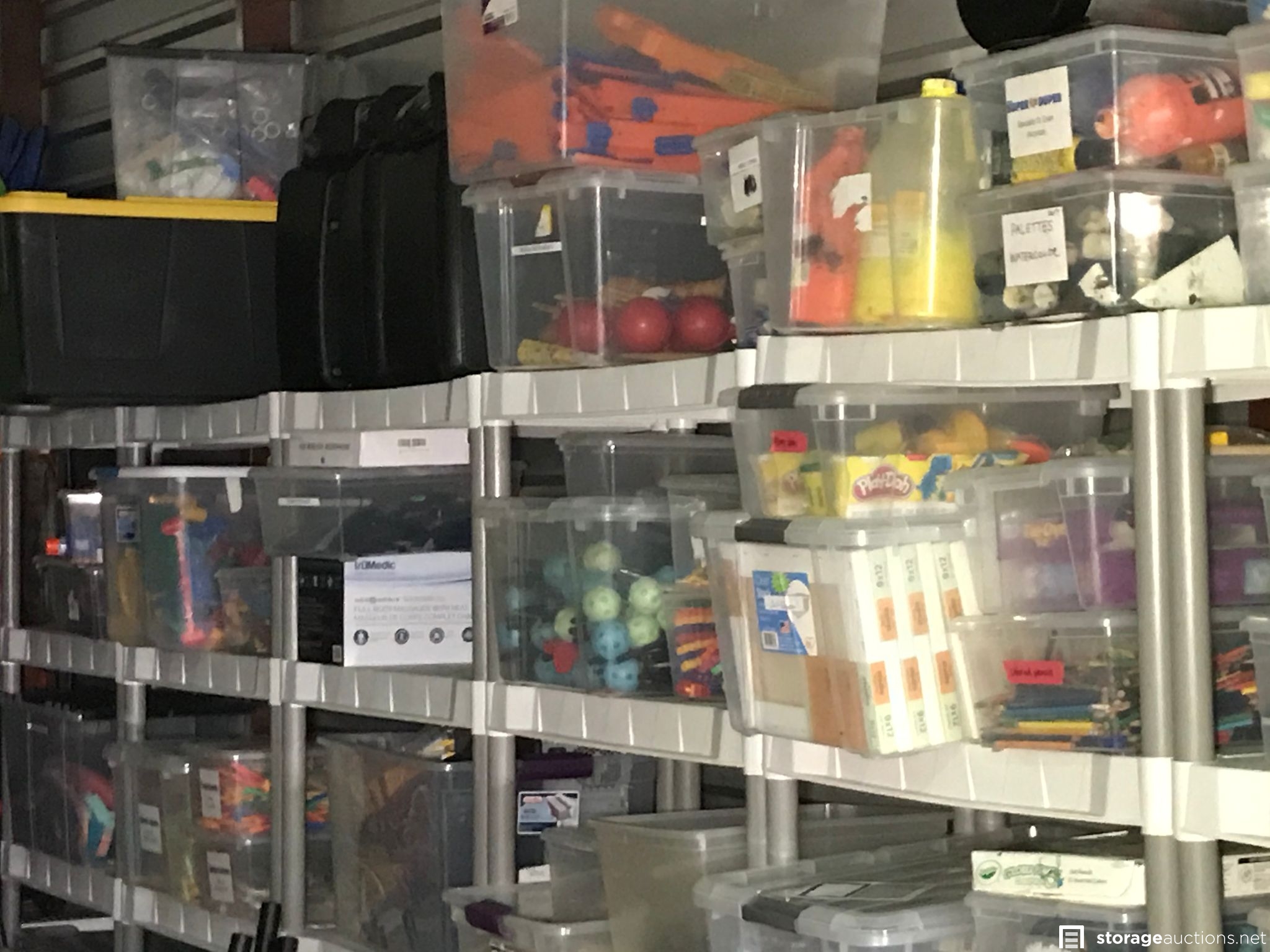 Storage Shelves full of plastic totes full of toys and school supplies, Gymnastics Equipment, Boogie Boards, Art, Power Tools, File Cabinet
