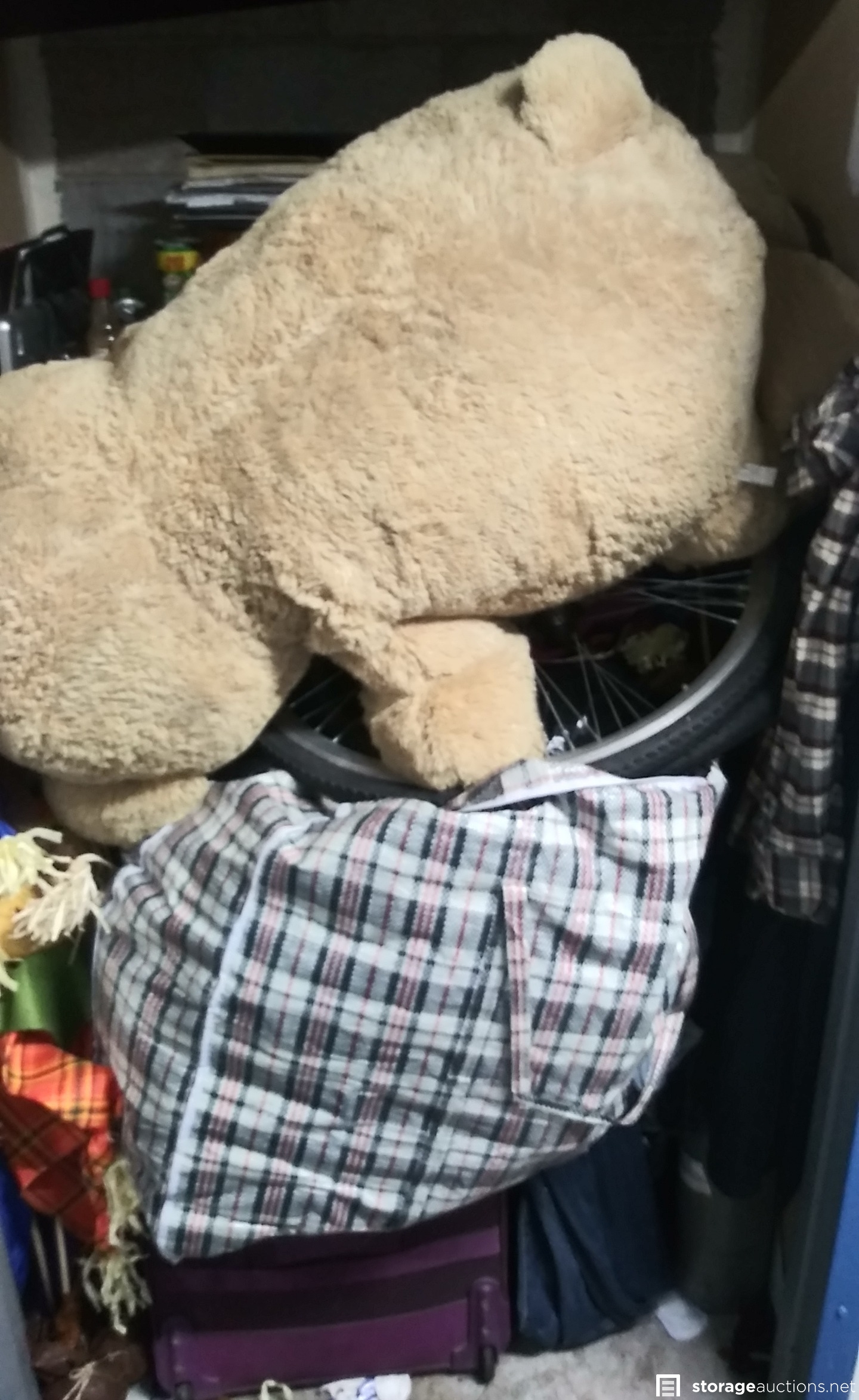 Unit appears to contain bicycle parts and wheel, EXTRA Large stuffed teddy bear, misc. totes with unknown contents, clothing, garbage bags and luggage/suitcases.