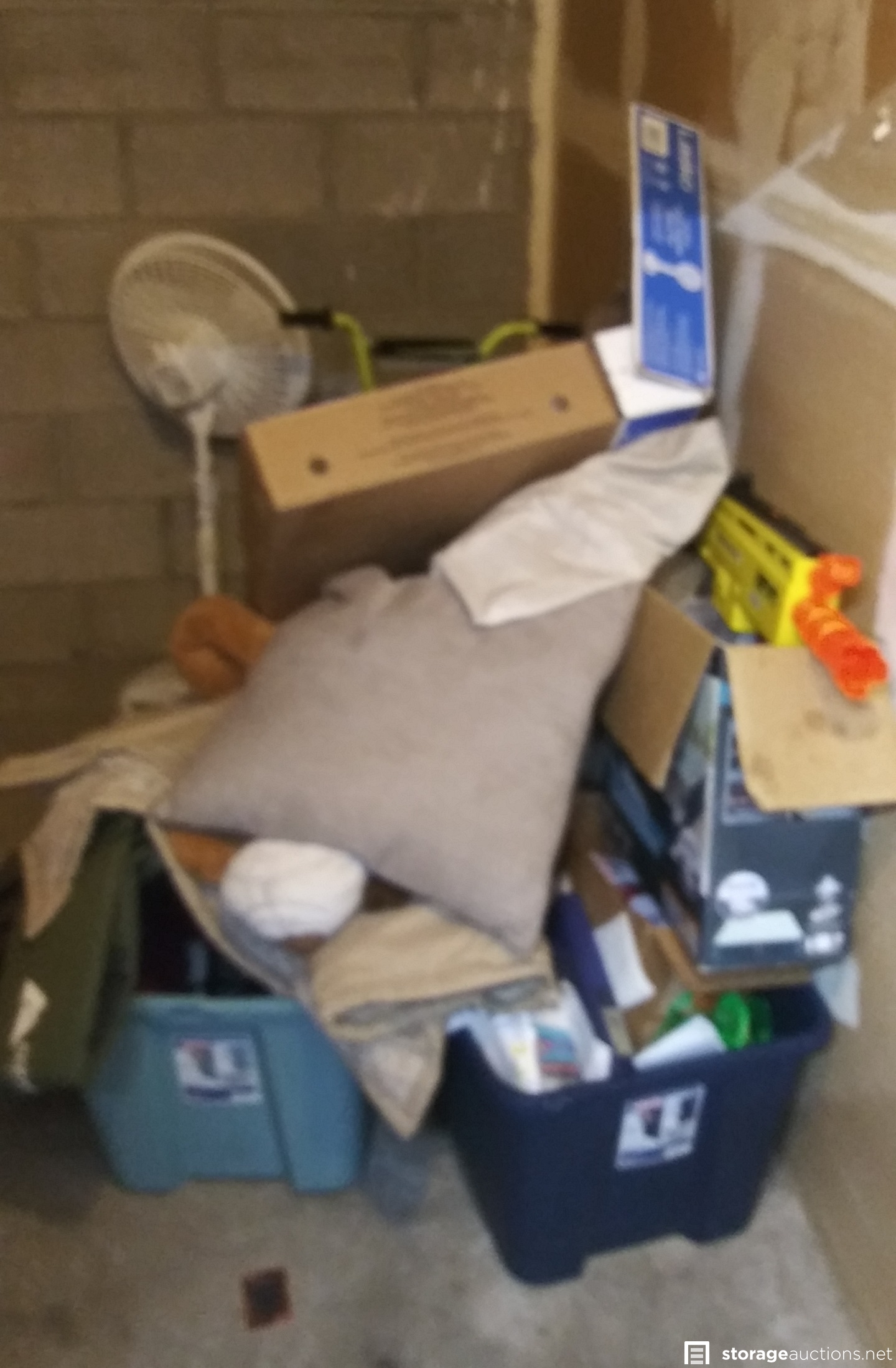 Unit appears to contain roughly a 1/2 dozen totes, bags, household goods, toys bike and clothing.
