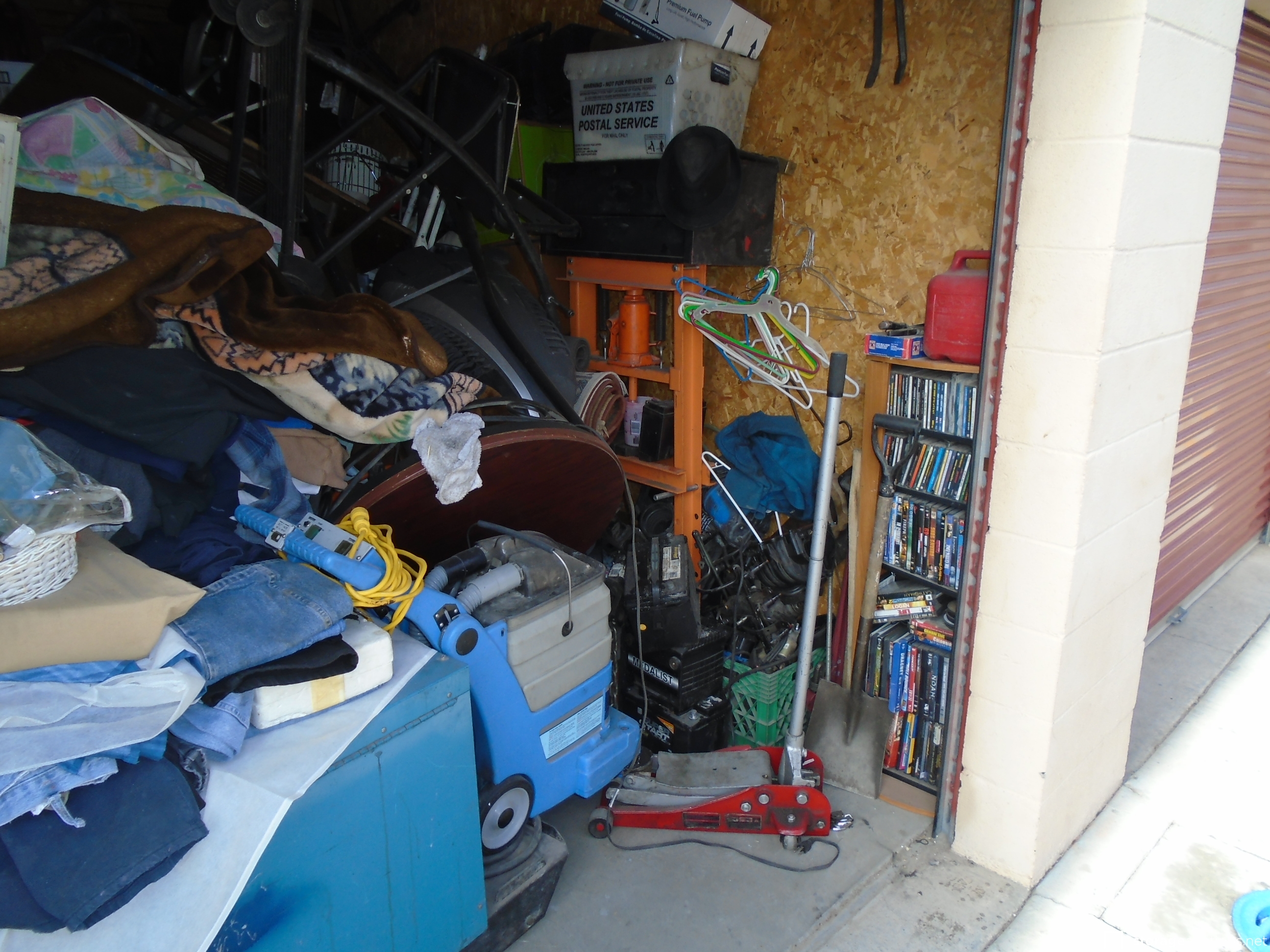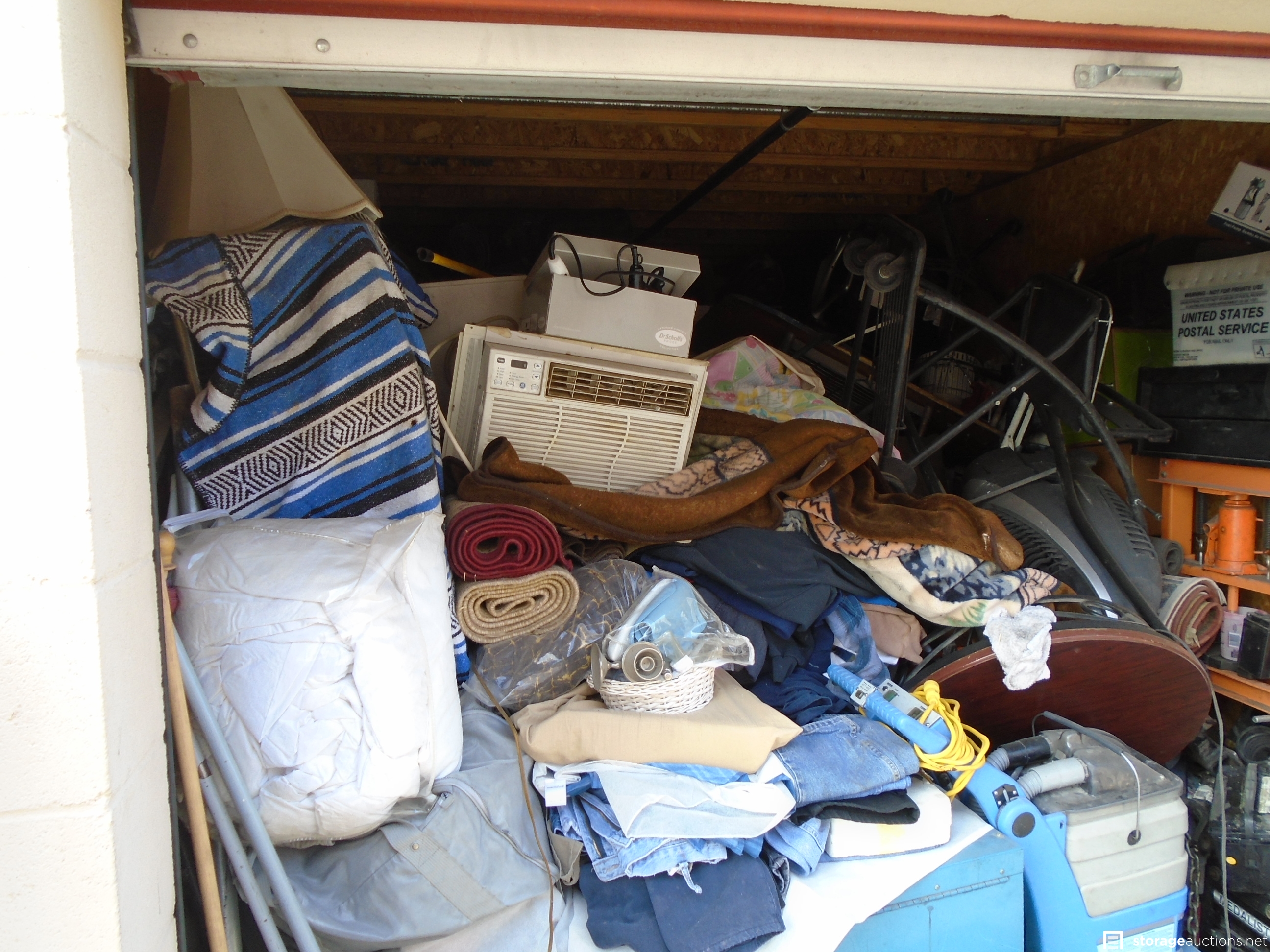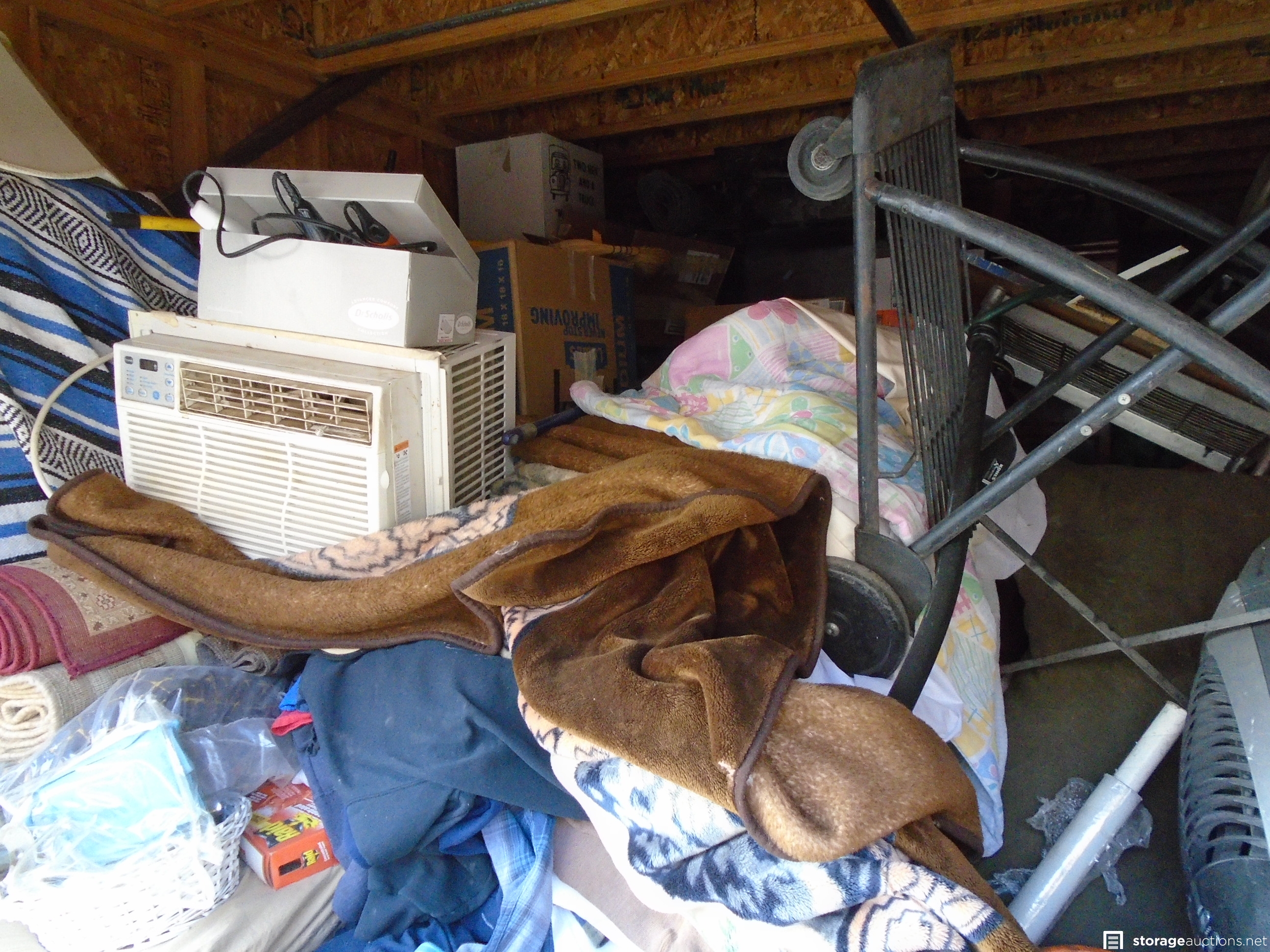 UNIT APPEARS TO CONTAIN: Welder, Car Jack, Carpet Cleaner, Clothes, Crow bar, Table, Totes, Several Area Rugs, Air Conditioner, Fan, Partially Obstructed View