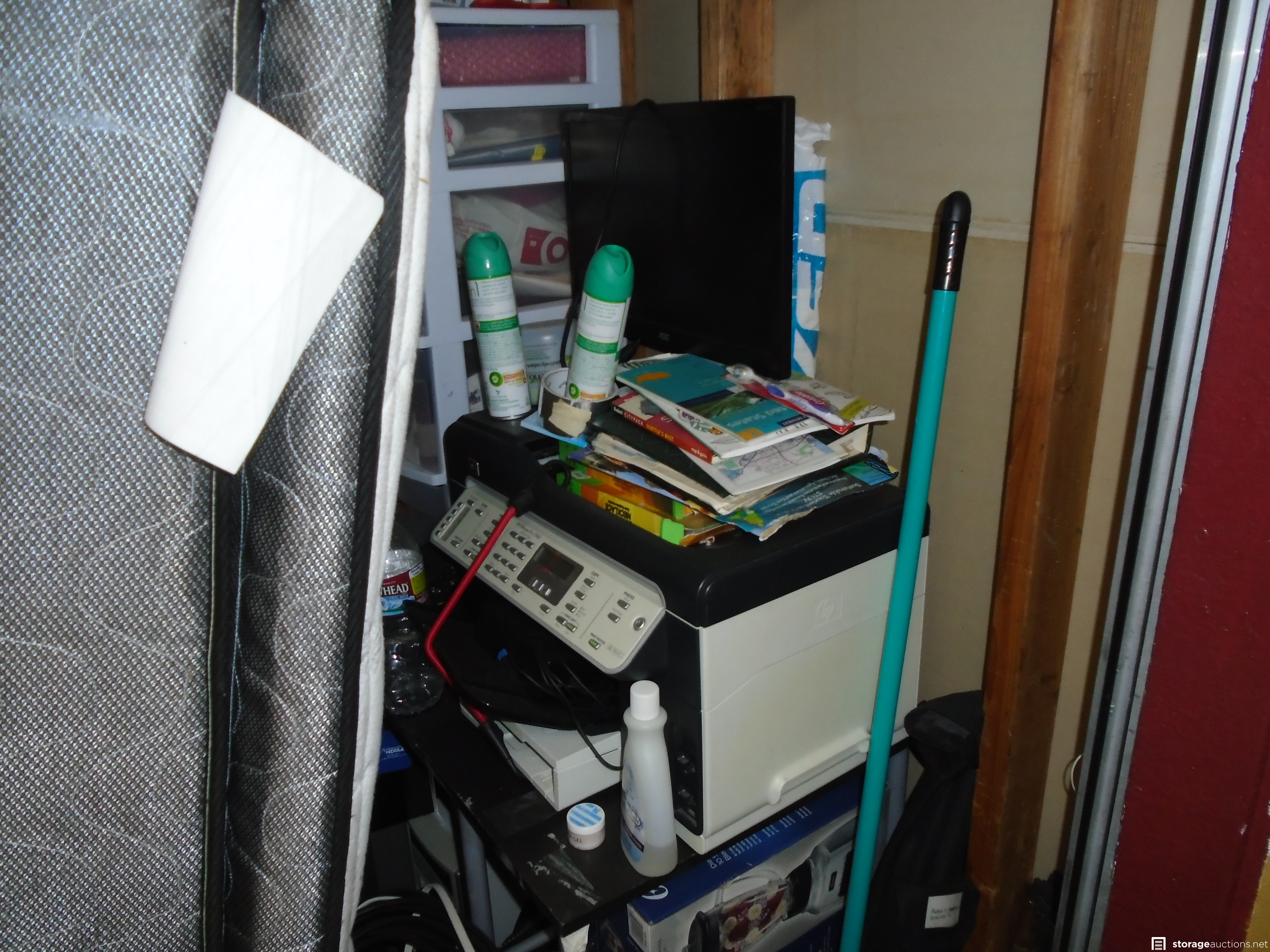 Shoes, Bags, monitor, computer parts, dvd/vhs, camping stuff, boxes,