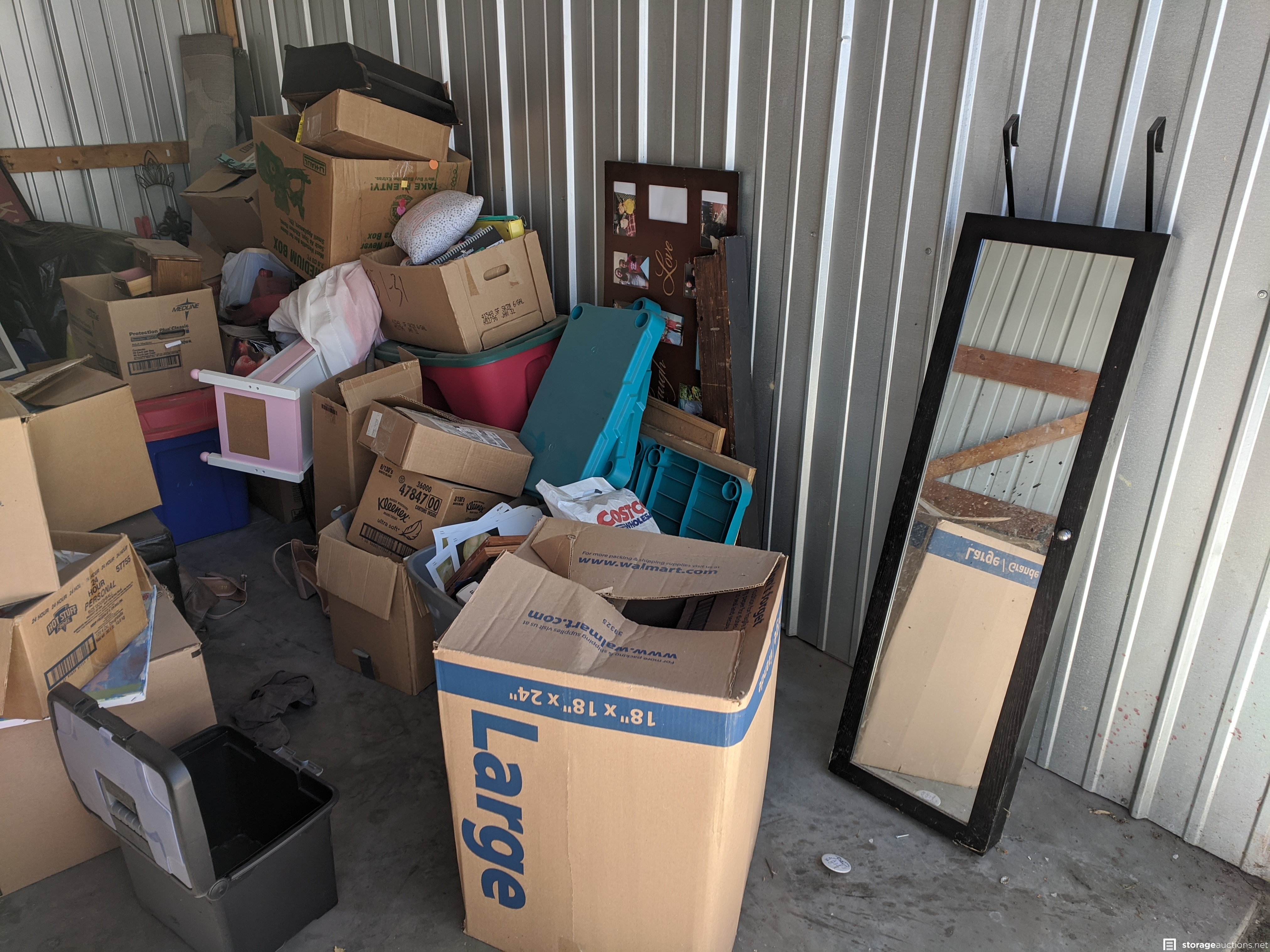Various boxes with personal items, mirrors, frames, storage totes, carpet, kids toys, what looks like a small wooden personal items box, nice metal wire shelf.
