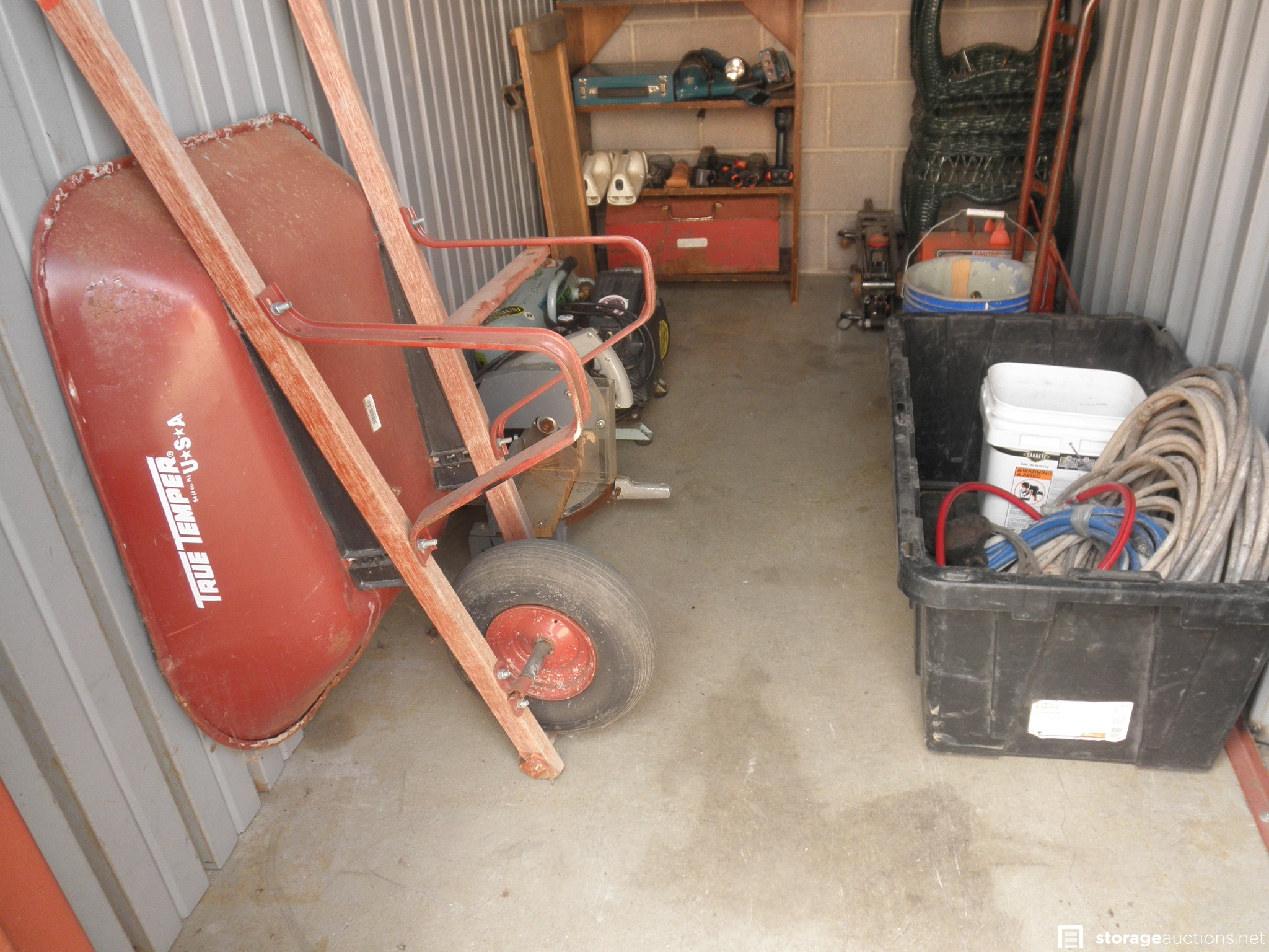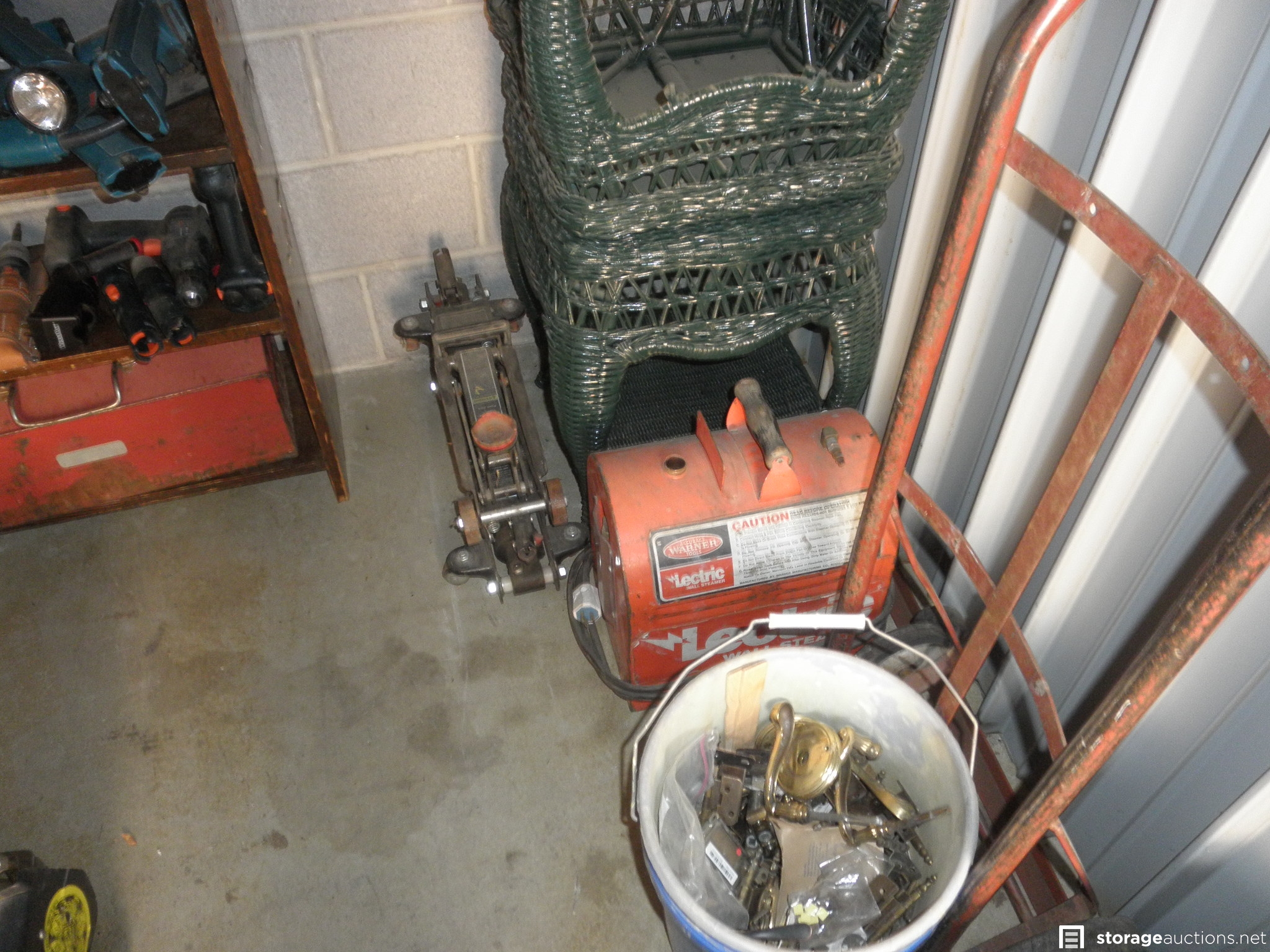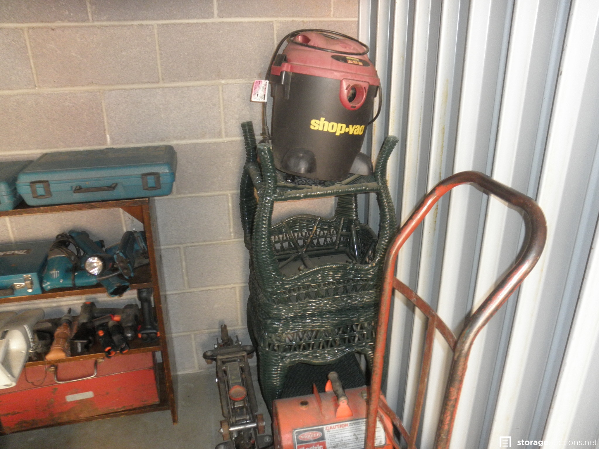 Tools- mostly Makita & B&D battery powered, Jacks, creeper, wheelbarrow, wall steamer, wicker end tables, Rockwell Miter box saw, Twin tank Air compressor, Paint gun & hoses, shop vac, Dolly-has a bad wheel