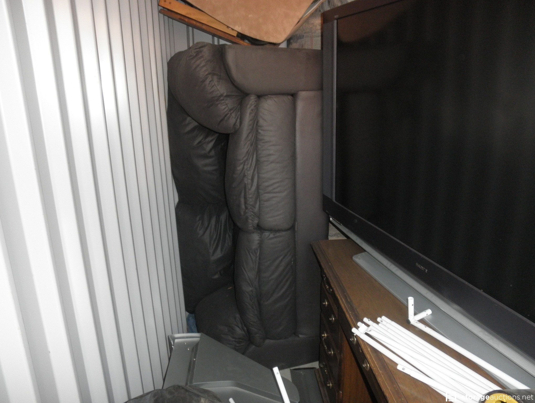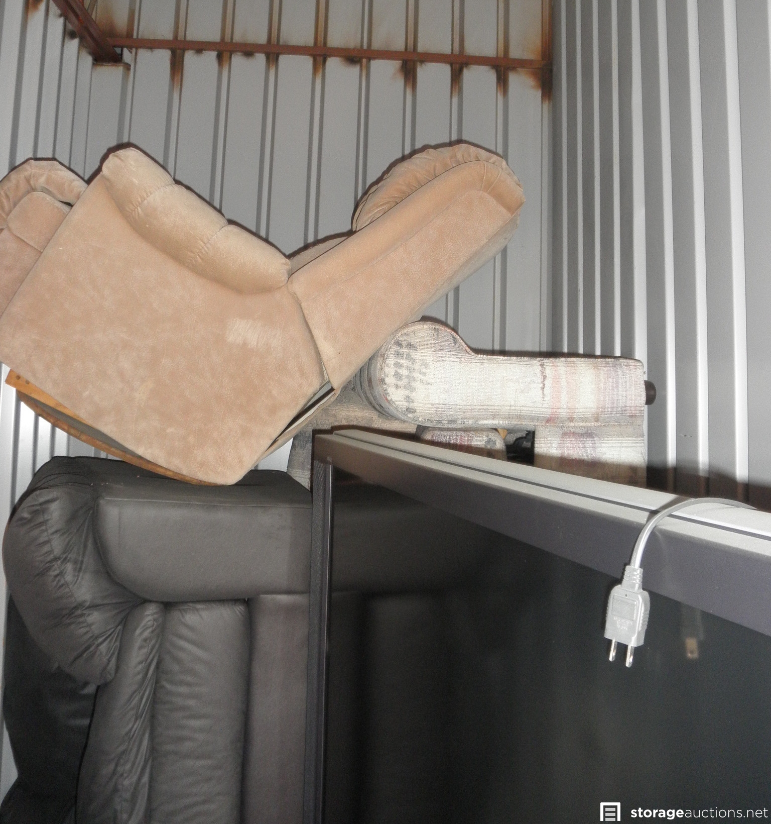 Big screen TV, Speakers, Bag with misc tools, 4 gang roll up power cord, Leather Loveseat, Recliner, Cooler, Desk