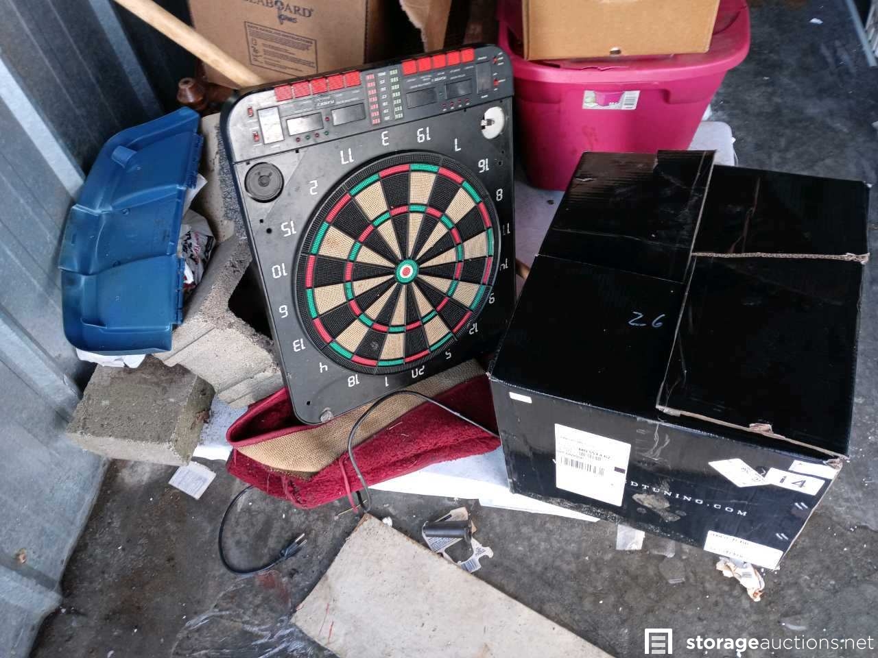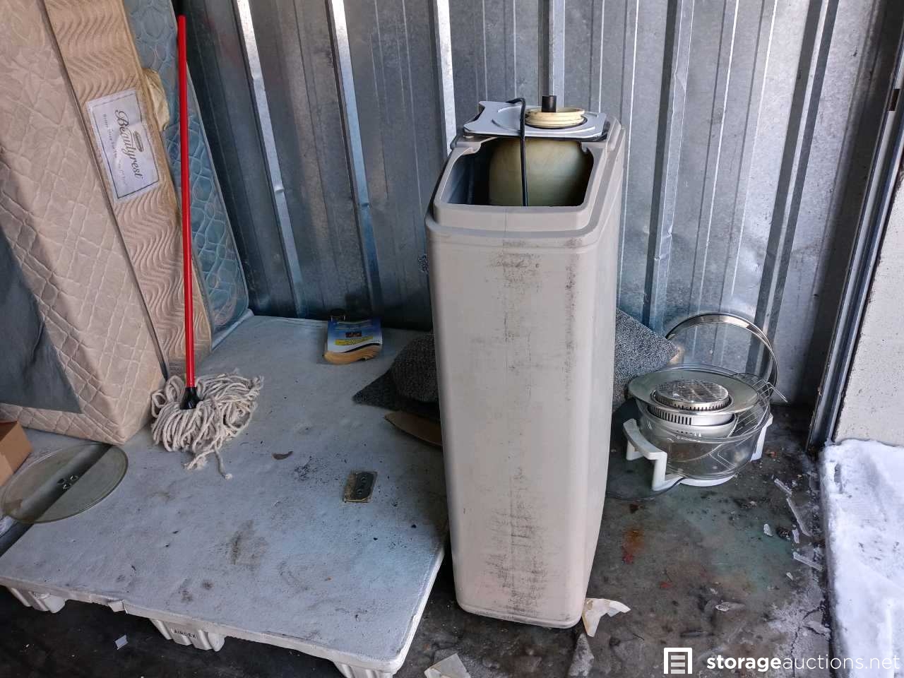 This unit appears to contain a new Swisstech winter jacket, craftsman drill, quantum cooler, arctic snowpants, wood headboard and footboard, wood side table, wood coffee table, lamp, emergency light, microwave, toaster oven, chair, dart board, boxes, plastic tubs, miscellaneous
