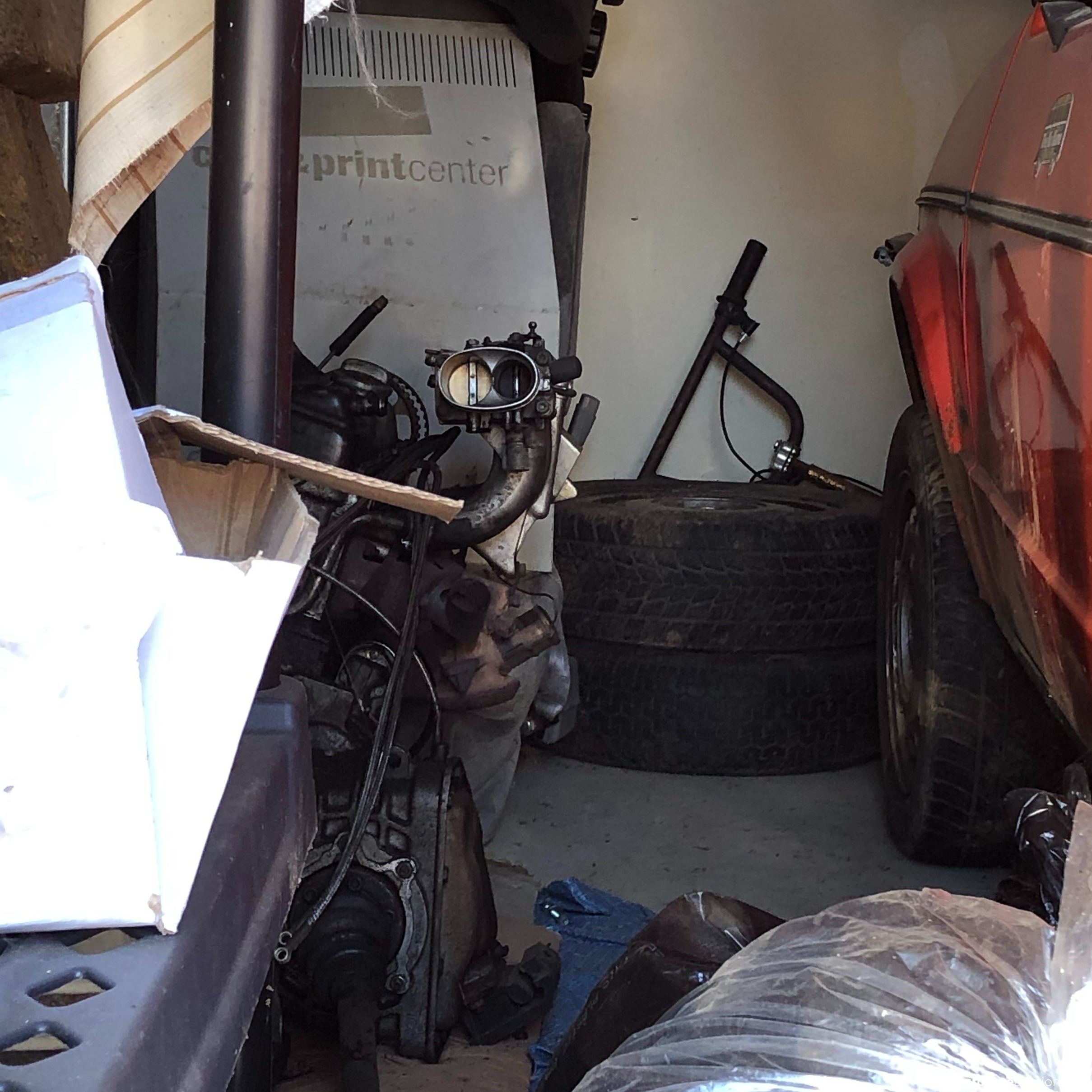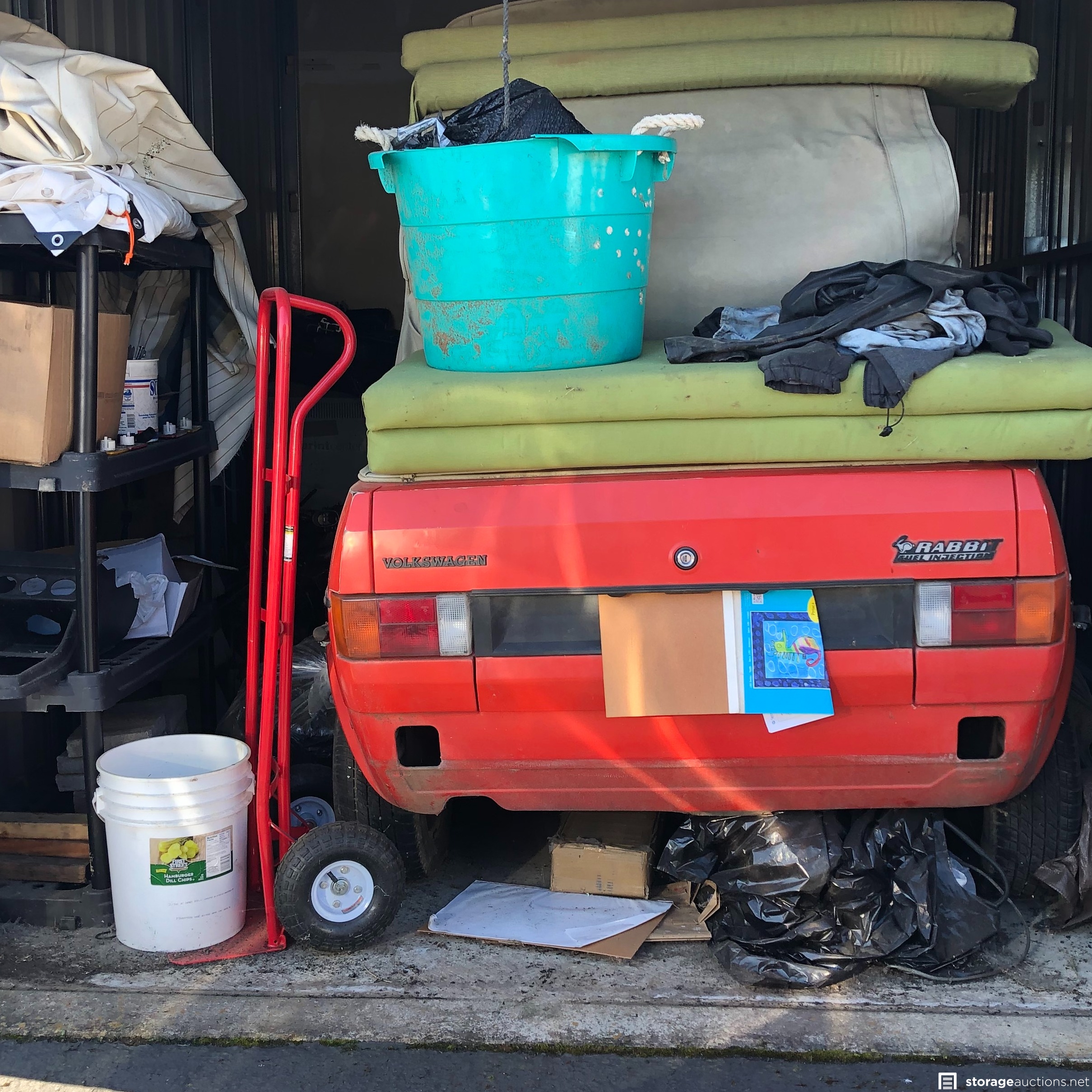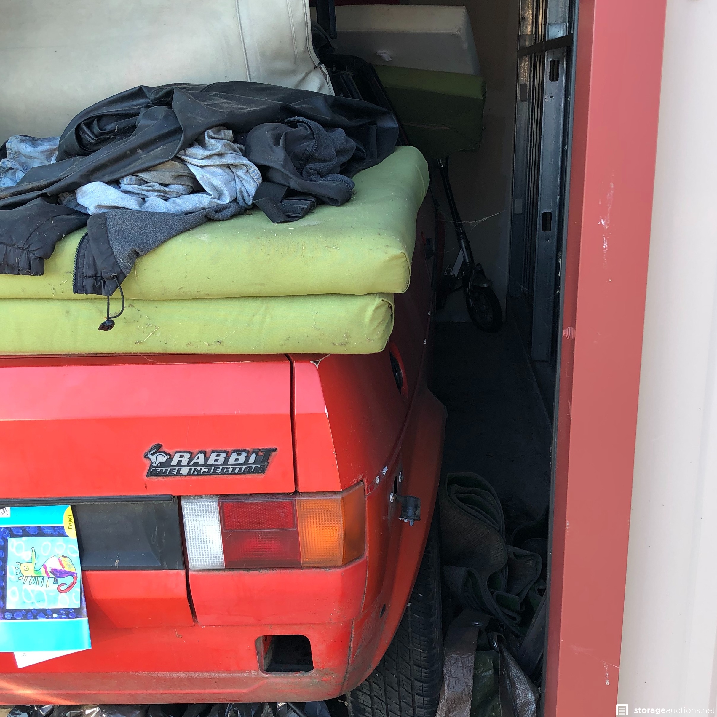 There appears to be a convertible Rabbit car, car parts, a dolly, shelving, a copy and printer center, engine, transmission, seats, tires and wheels, one or two scooters, and other misc. items.