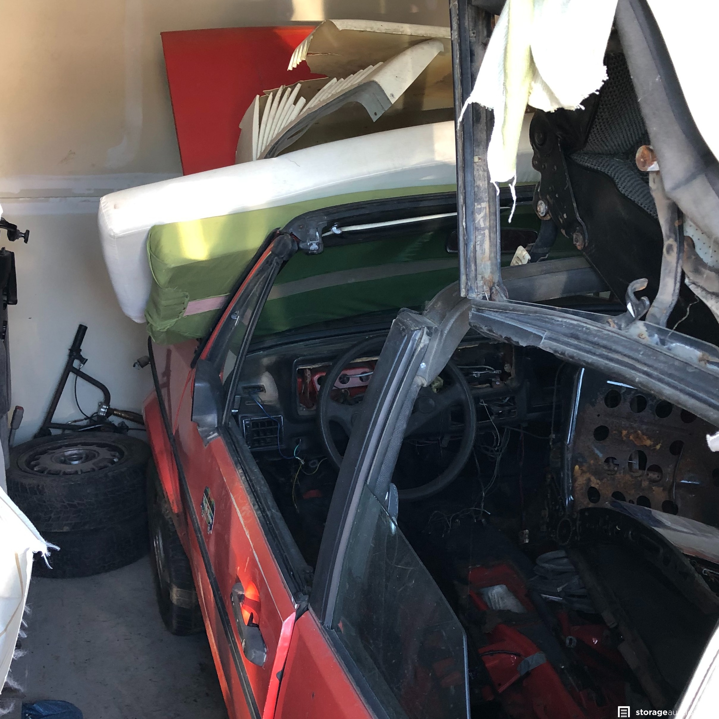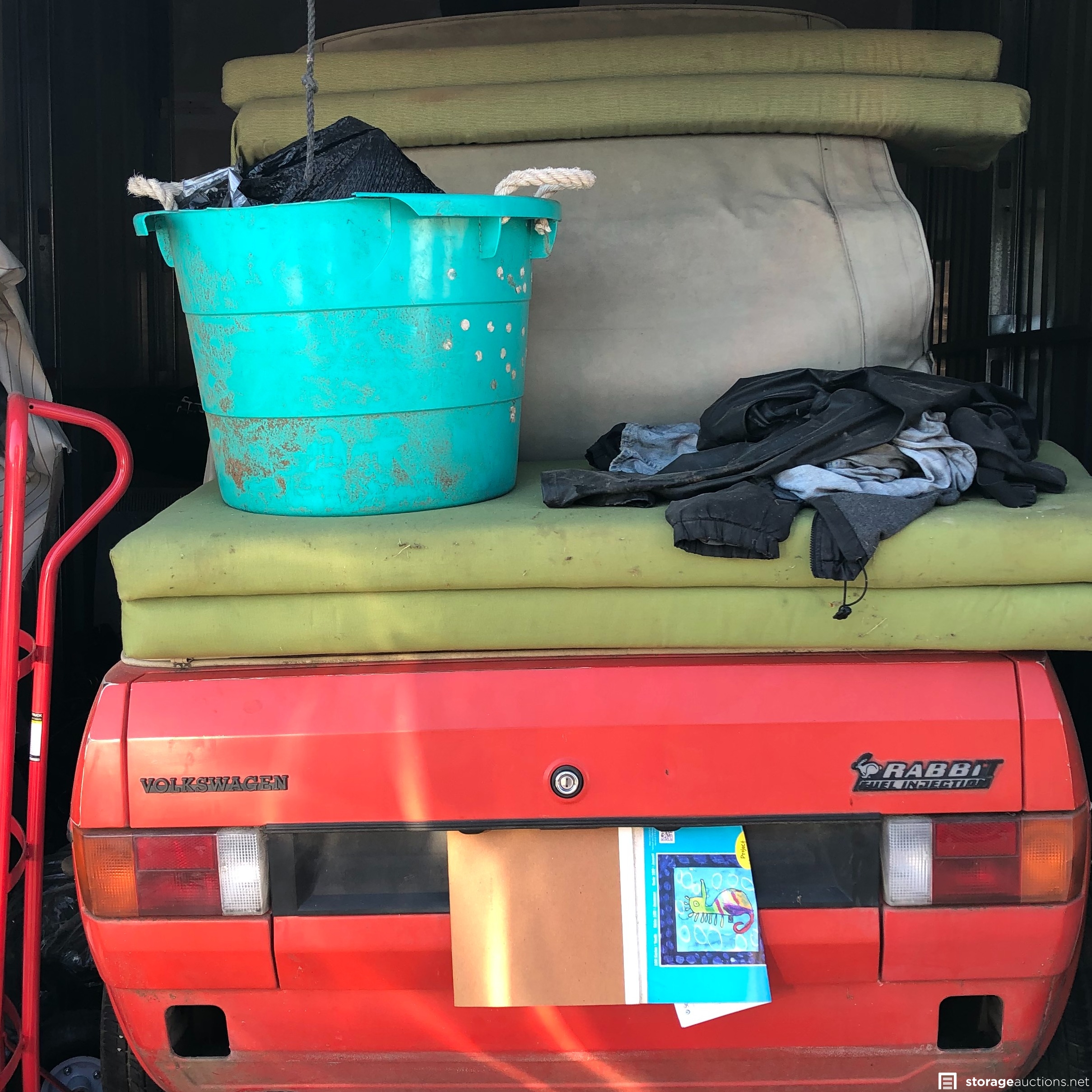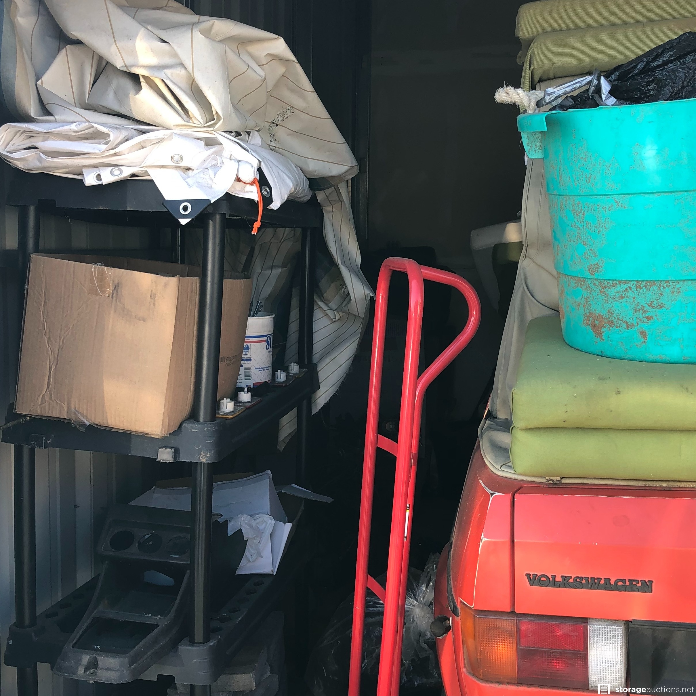 There appears to be a convertible Rabbit car, car parts, a dolly, shelving, a copy and printer center, engine, transmission, seats, tires and wheels, one or two scooters, and other misc. items.